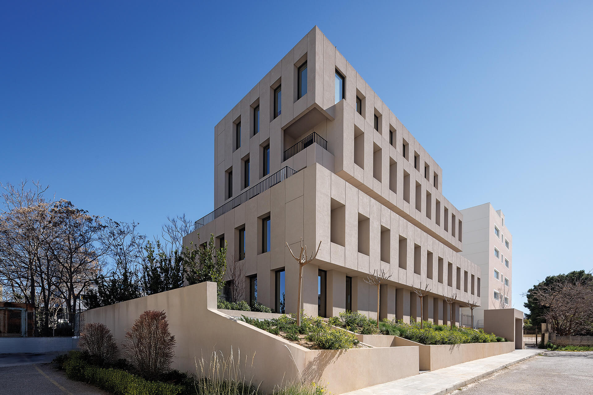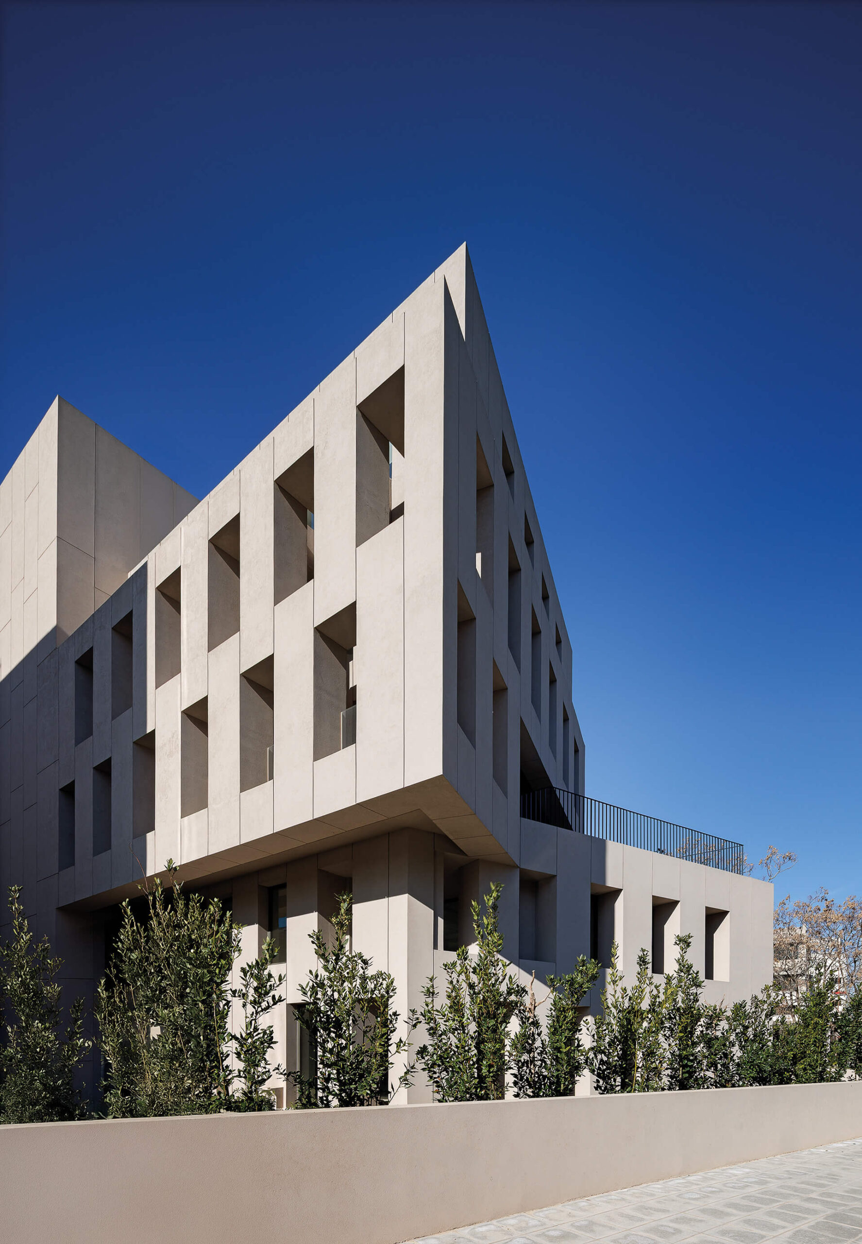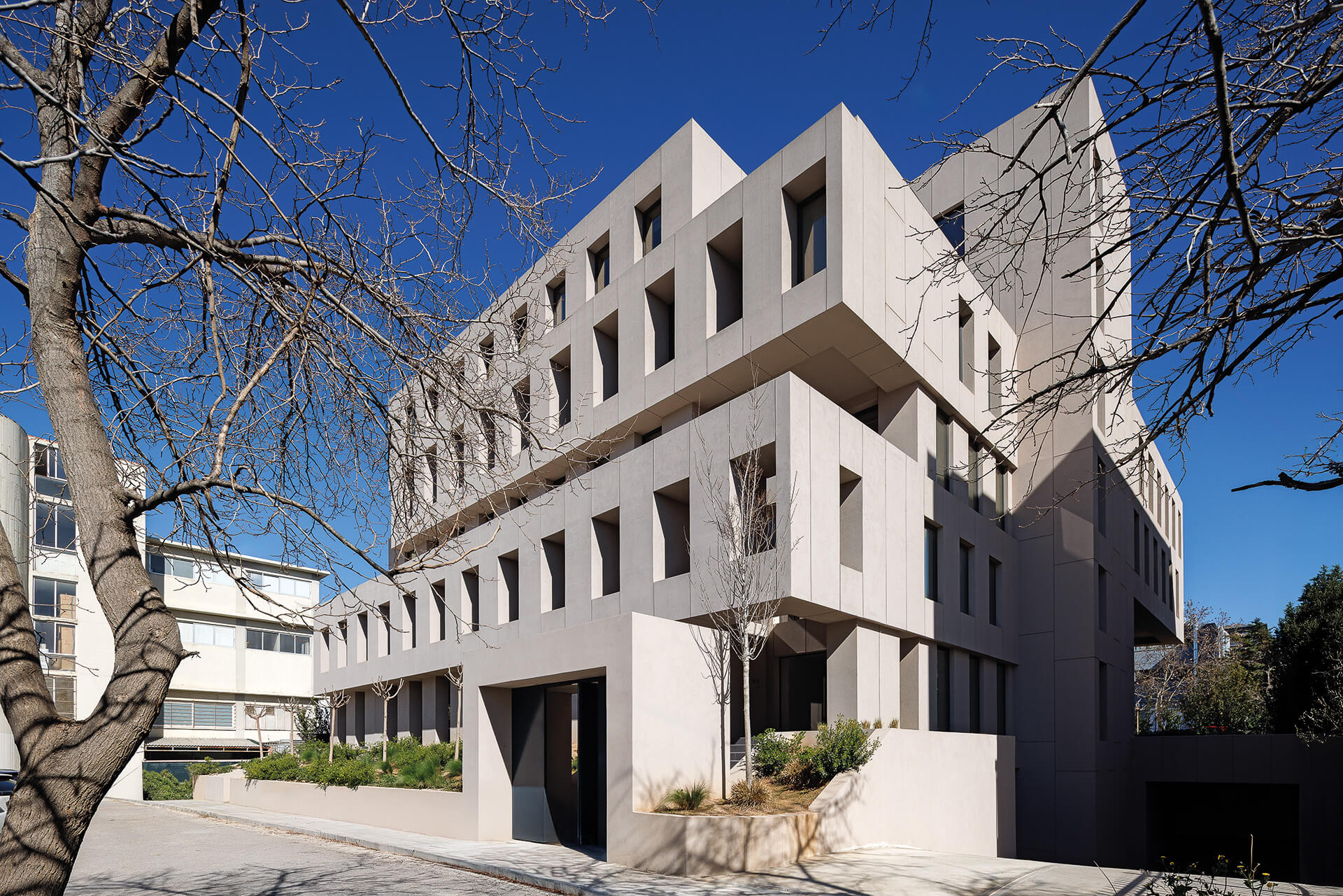 Παράλληλα, διασπάται σε επιμέρους στοιχεία, που με τον τρόπο αυτόν διαμορφώνουν, με μία ρυθμική εναλλαγή “κενού και πλήρους“, ένα σύστημα σκίασης και ανοιγμάτων, ρυθμίζοντας τις συνθήκες σκιάς και φυσικού φωτός στο εσωτερικό του κτιρίου. Τμήματα τοίχων και παραθύρων που εναλλάσσονται μεταξύ τους, περιβάλουν το κτίριο σε όλα τα επίπεδα, οργανώνοντας έτσι τους ανεξάρτητους και κάπως τυχαίους υφιστάμενους όγκους, ενώ διαμορφώνουν μια ενιαία αντίληψη για το κτίριο.