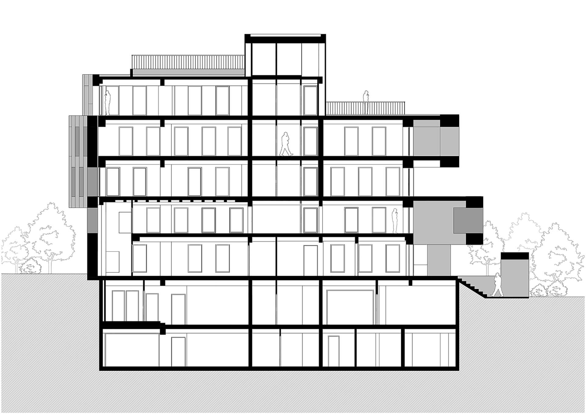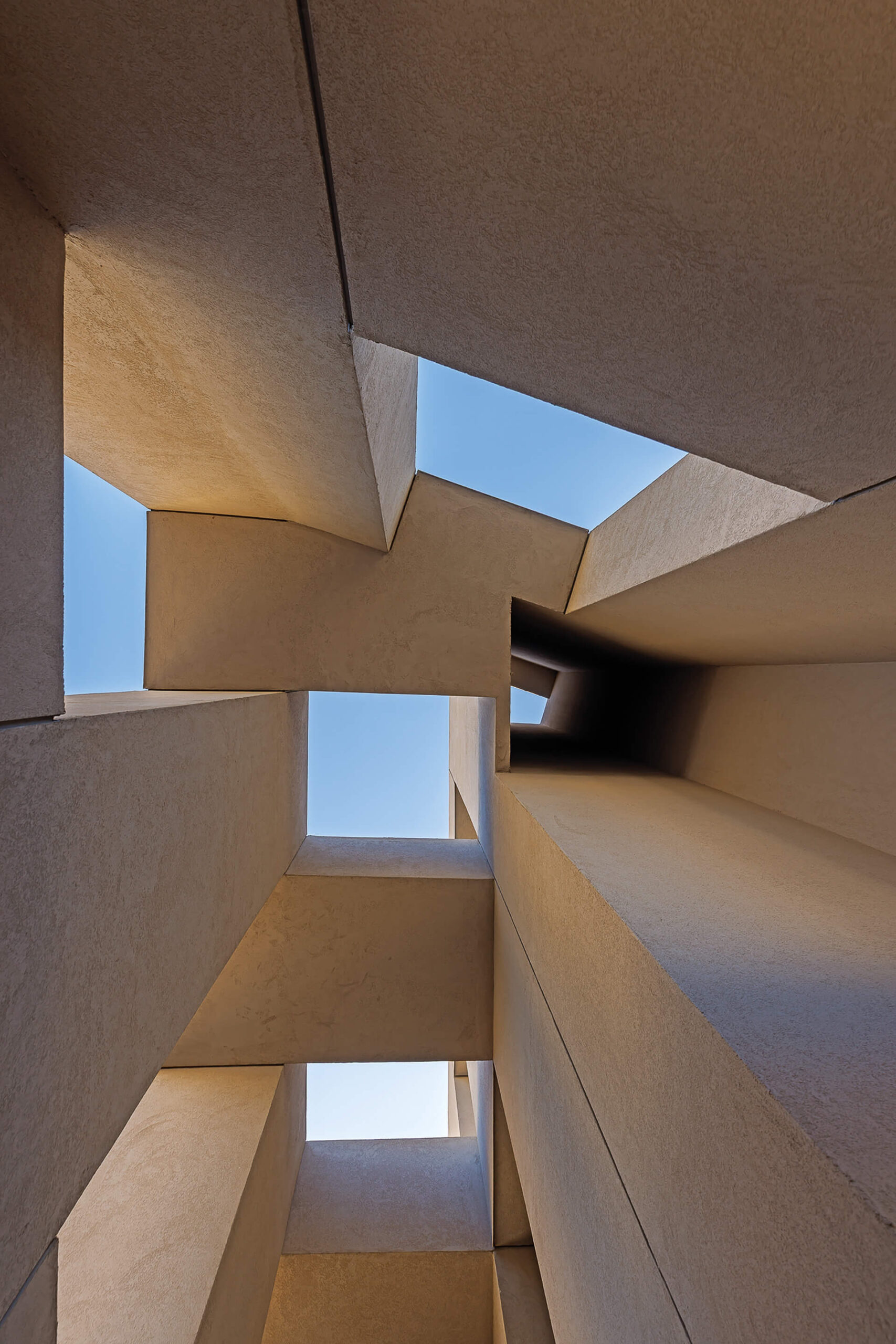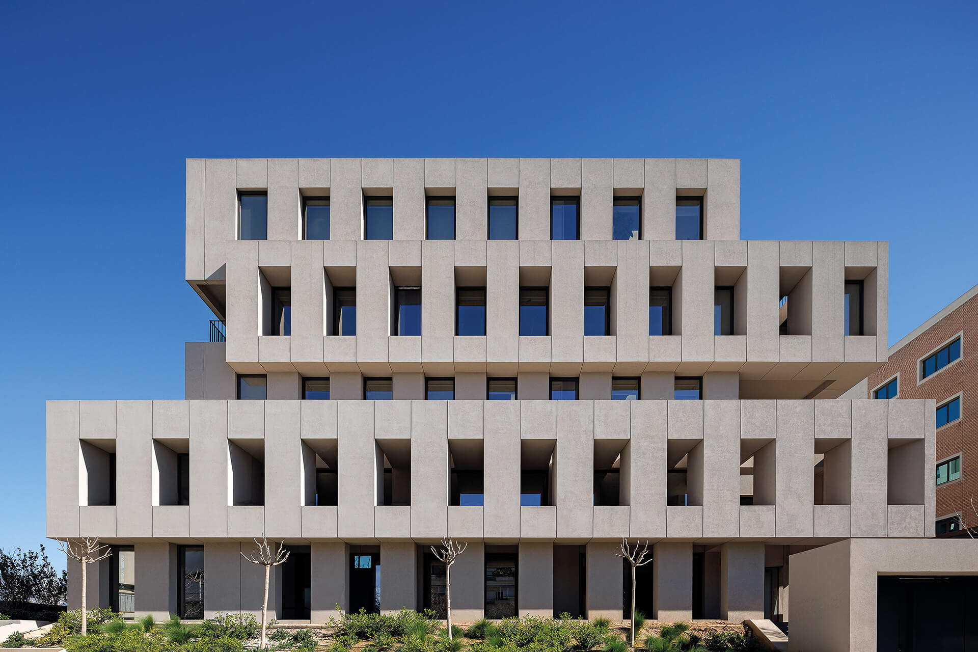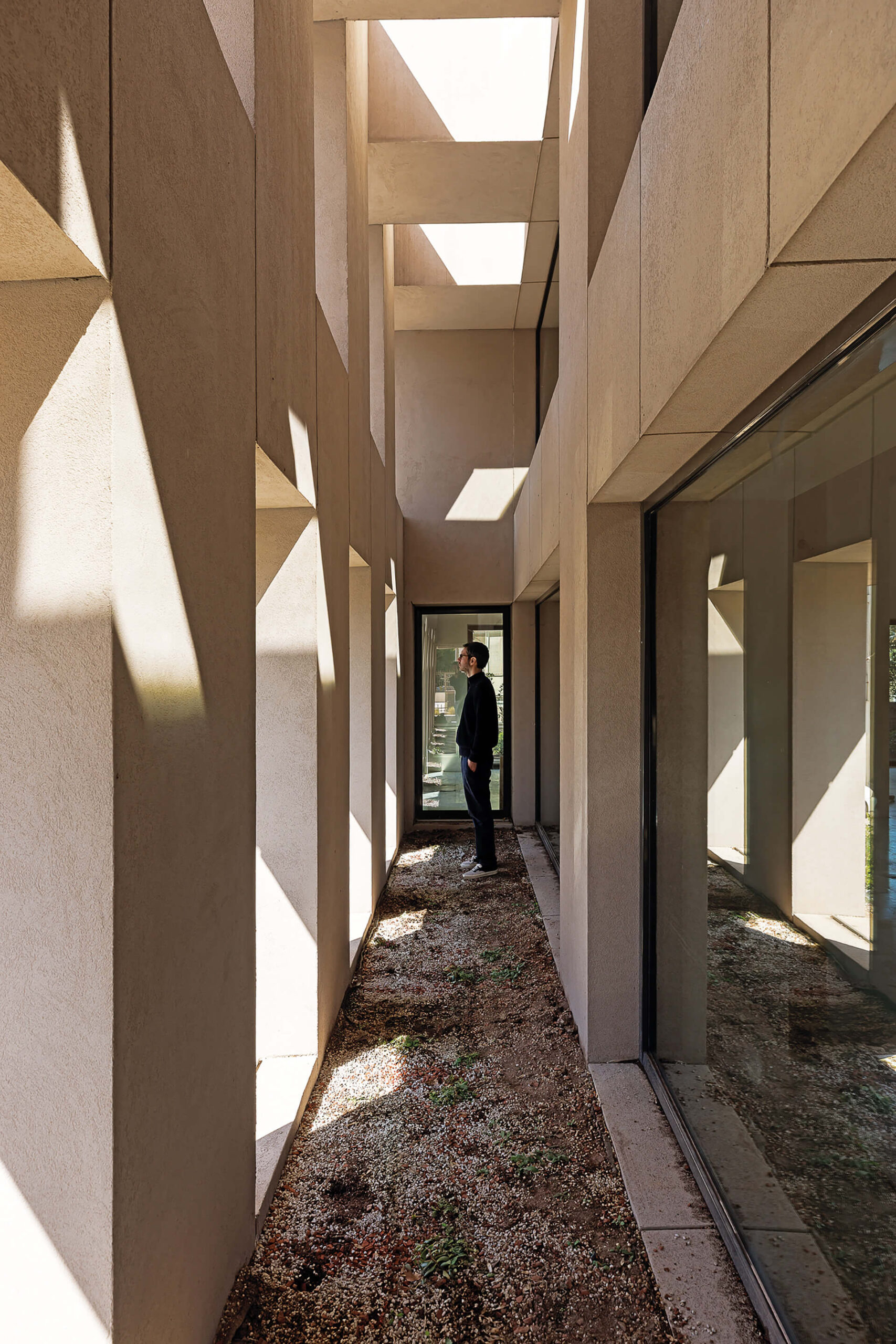 Παράλληλα, διασπάται σε επιμέρους στοιχεία, που με τον τρόπο αυτόν διαμορφώνουν, με μία ρυθμική εναλλαγή “κενού και πλήρους“, ένα σύστημα σκίασης και ανοιγμάτων, ρυθμίζοντας τις συνθήκες σκιάς και φυσικού φωτός στο εσωτερικό του κτιρίου. Τμήματα τοίχων και παραθύρων που εναλλάσσονται μεταξύ τους, περιβάλουν το κτίριο σε όλα τα επίπεδα, οργανώνοντας έτσι τους ανεξάρτητους και κάπως τυχαίους υφιστάμενους όγκους, ενώ διαμορφώνουν μια ενιαία αντίληψη για το κτίριο.