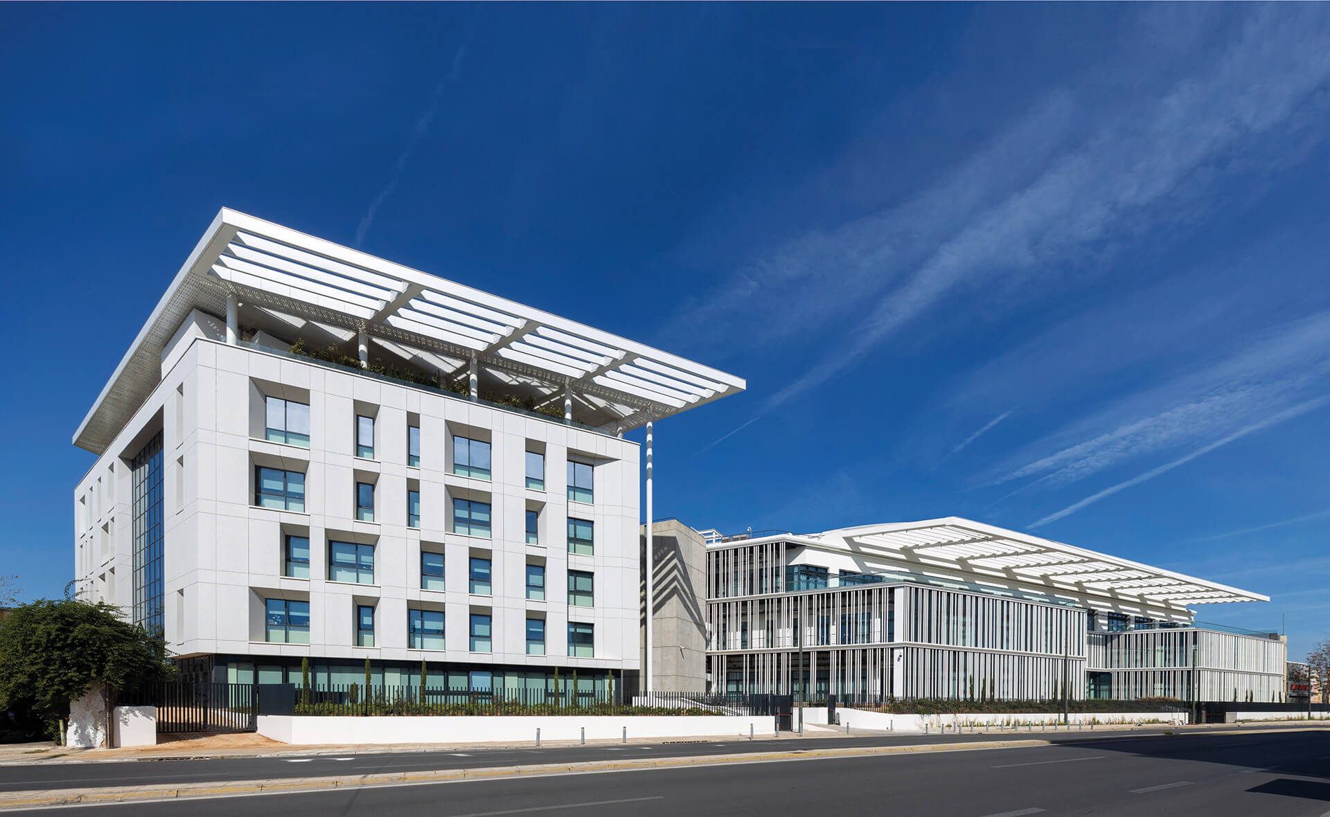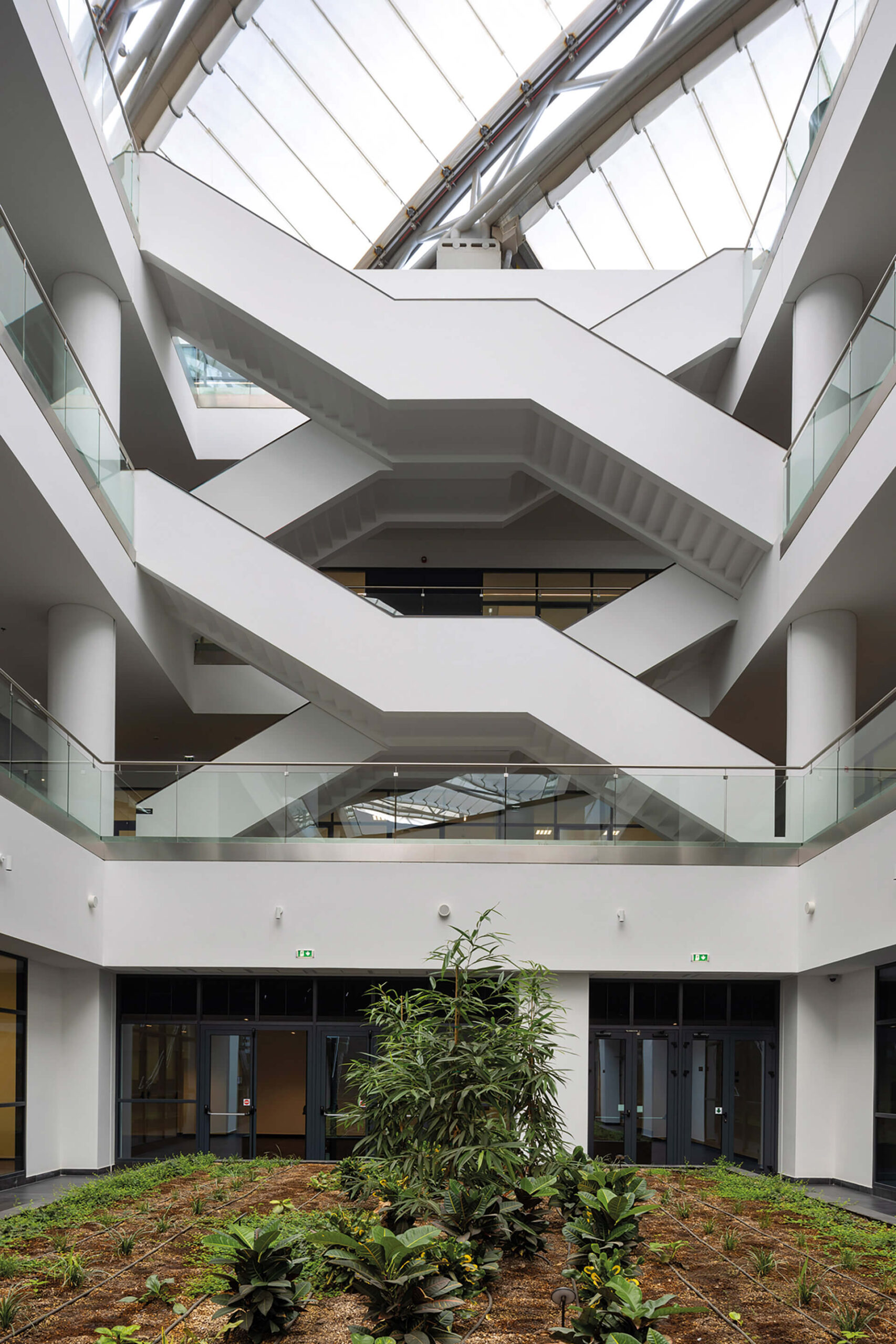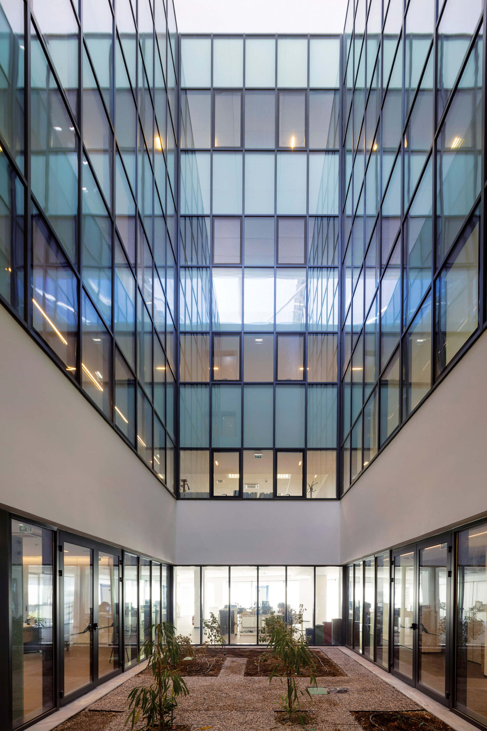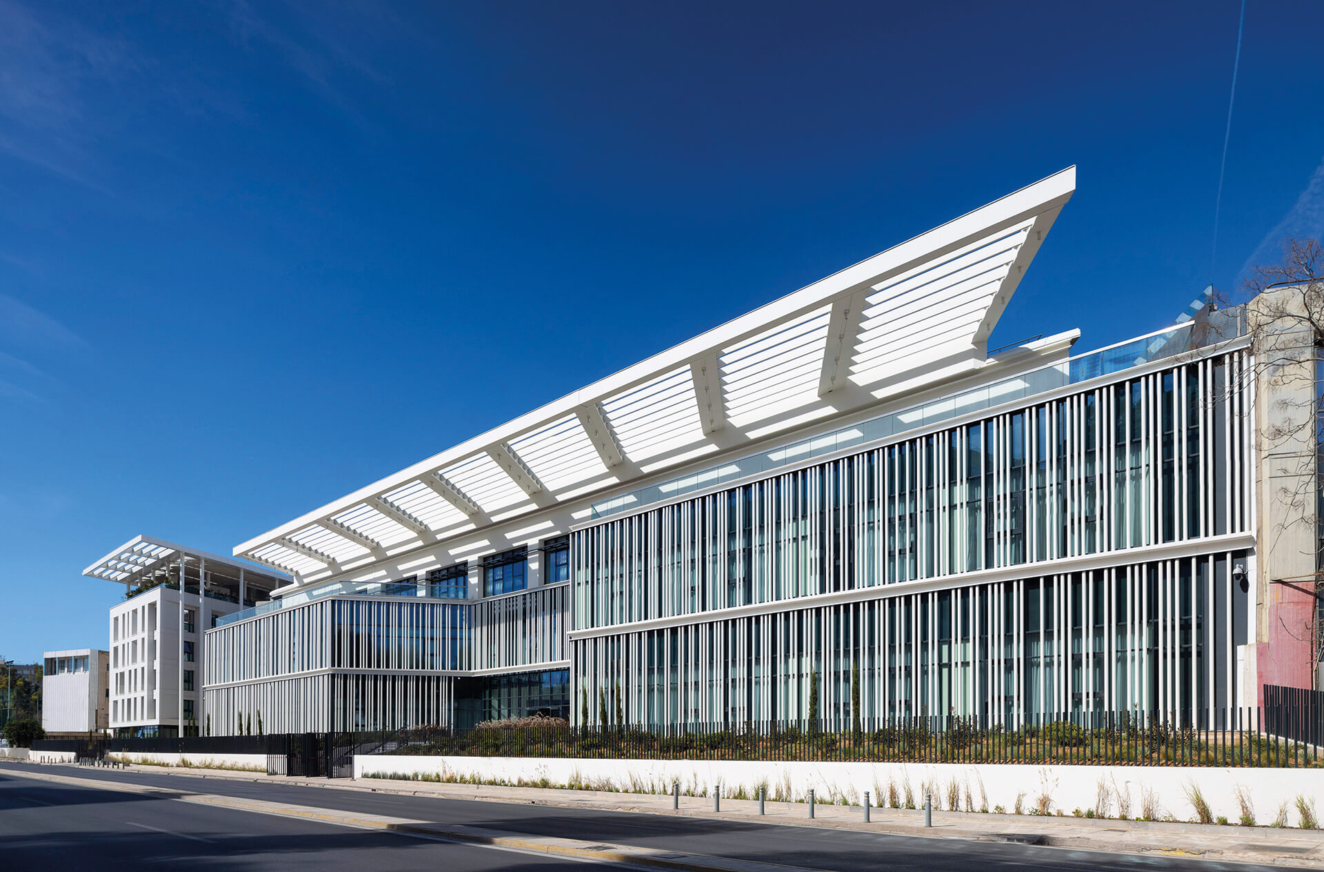 Σε δεύτερο επίπεδο, ένα τρισδιάστατο κέλυφος από ινοπλισμένη τσιμεντοσανίδα ενσωματώνει υαλοπετάσματα μέσω εσοχών, διατηρώντας την αυτονομία των υλικών, ενώ ταυτόχρονα συμβάλλει στη συνοχή της σύνθεσης. Το νέο κτίριο, χωροθετημένο νοτιοδυτικά του υπάρχοντος, αναπτύσσεται σε ισόγειο, τέσσερις ορόφους και φυτεμένο δώμα.