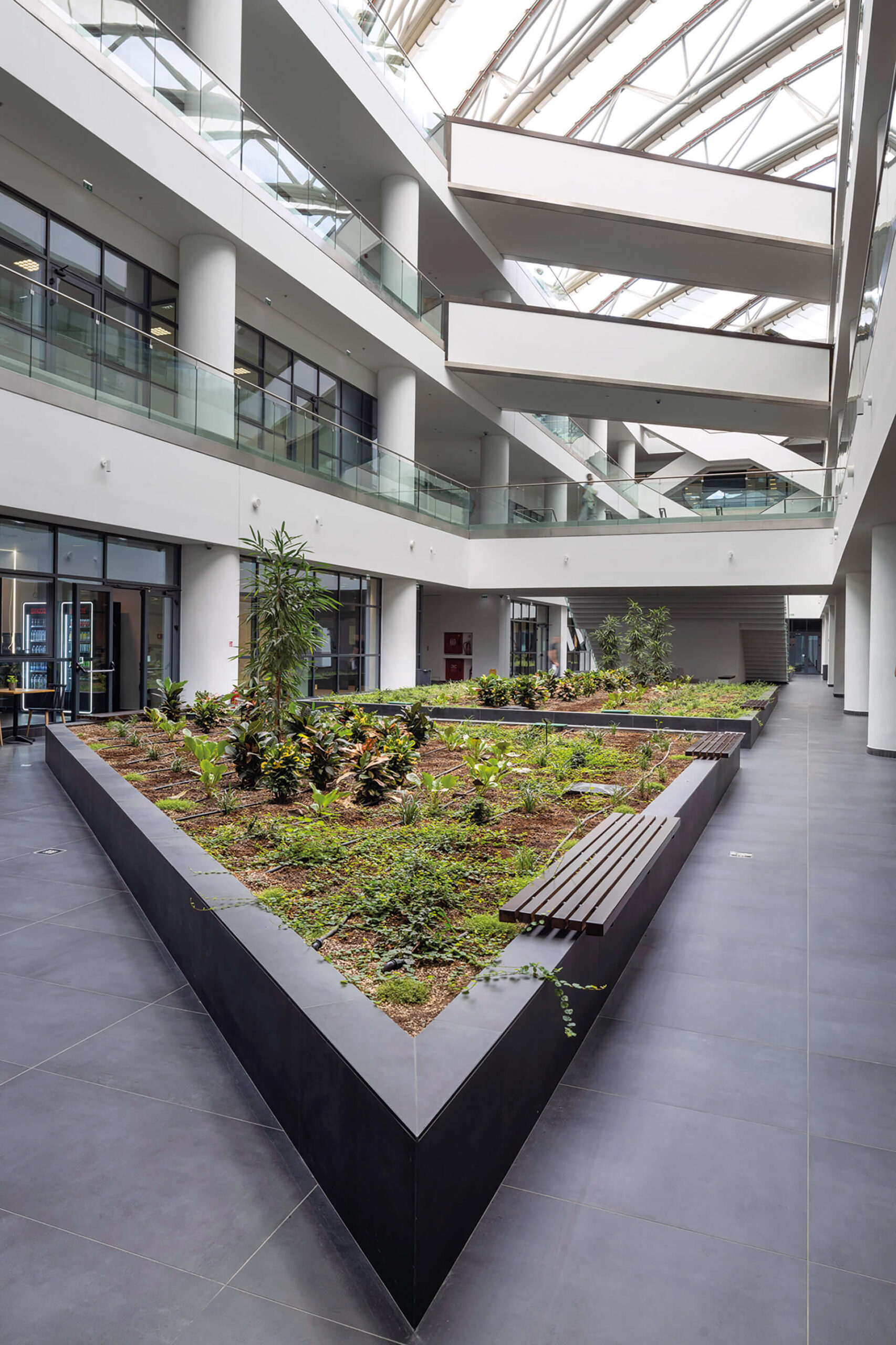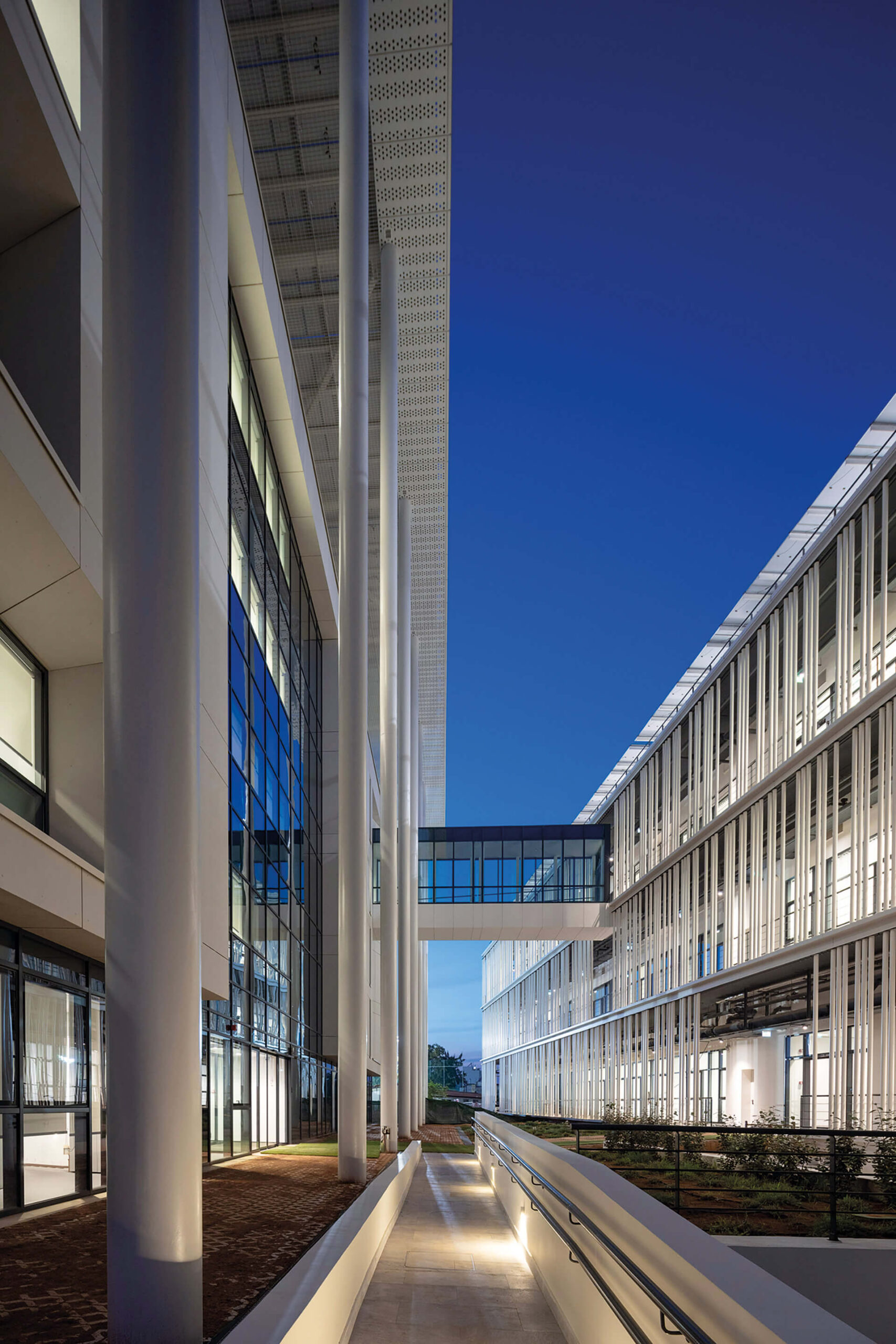 Παράλληλα, ο περιβάλλον χώρος λειτουργεί ως συνδετικός κρίκος μεταξύ των δύο κατασκευών, ενώ το ενεργειακό στέγαστρο και τα υποστυλώματα ενισχύουν τη συνολική ενότητα του συγκροτήματος. Ο ενδιάμεσος χώρος προσφέρει ένα μεταβατικό τοπίο που προάγει την αλληλεπίδραση και την εκτόνωση των χρηστών. Η φύτευση και οι επιλεγμένες επιστρώσεις των δαπέδων ολοκληρώνουν την αρχιτεκτονική σύνθεση.