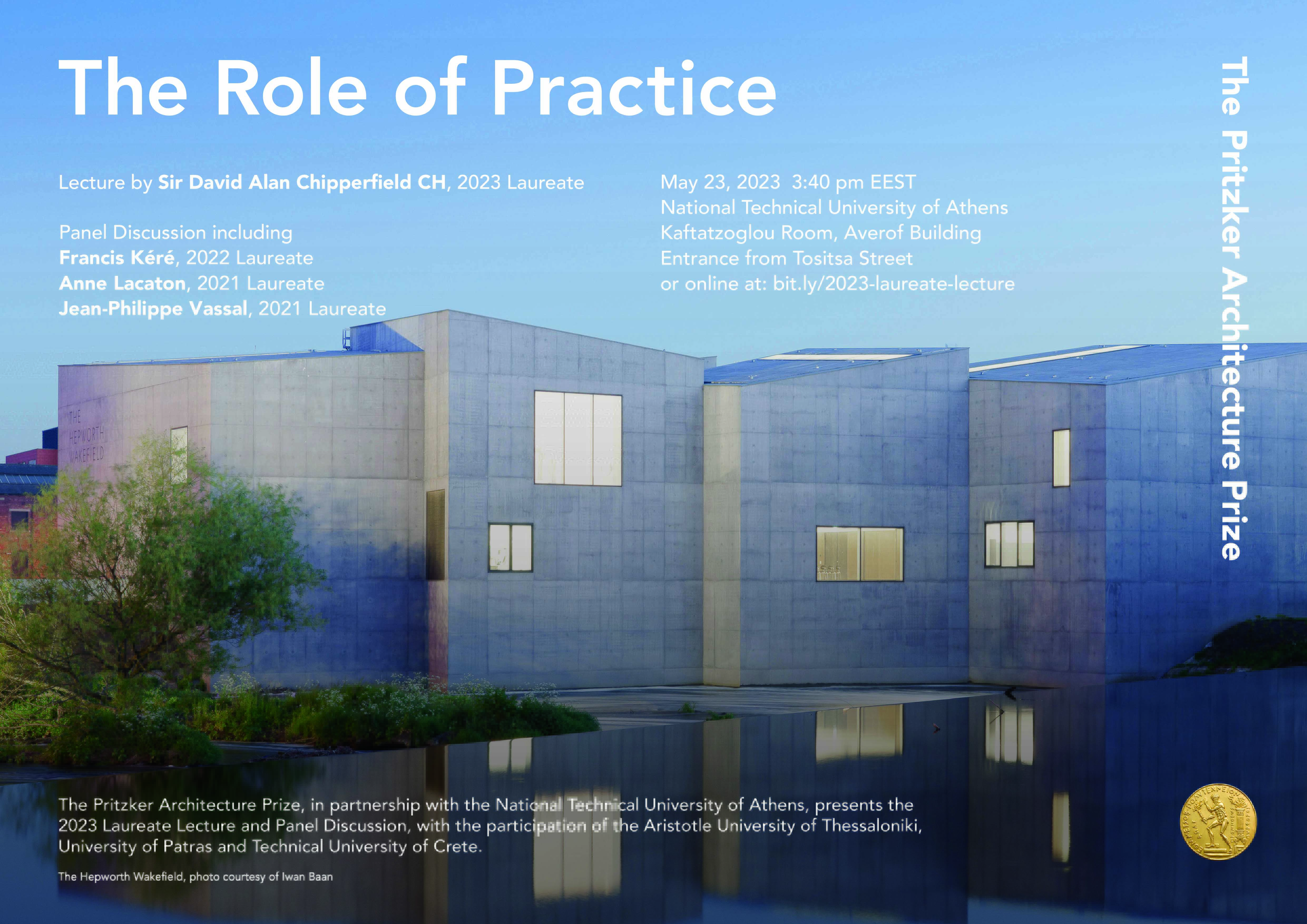 Τα Αρχιτεκτονικά Βραβεία Pritzker σε συνεργασία με το Εθνικό Μετσόβιο Πολυτεχνείο παρουσιάζουν τον βραβευμένο αρχιτέκτονα για το 2023, Sir David Alan Chipperfield CH, την Τρίτη 23 Μαΐου ώρα 3:40-6.00 μ.μ., σε διάλεξη με θέμα: “The Role of Practice” που θα γίνει στη Σχολή Αρχιτεκτόνων Μηχανικών Ε.Μ.Π., Συγκρότημα Πατησίων, κτίριο Αβέρωφ, Αίθουσα Καυταντζόγλου. Θα γίνεται παράλληλη προβολή στα Αμφιθέατρα Α002 & Α008.