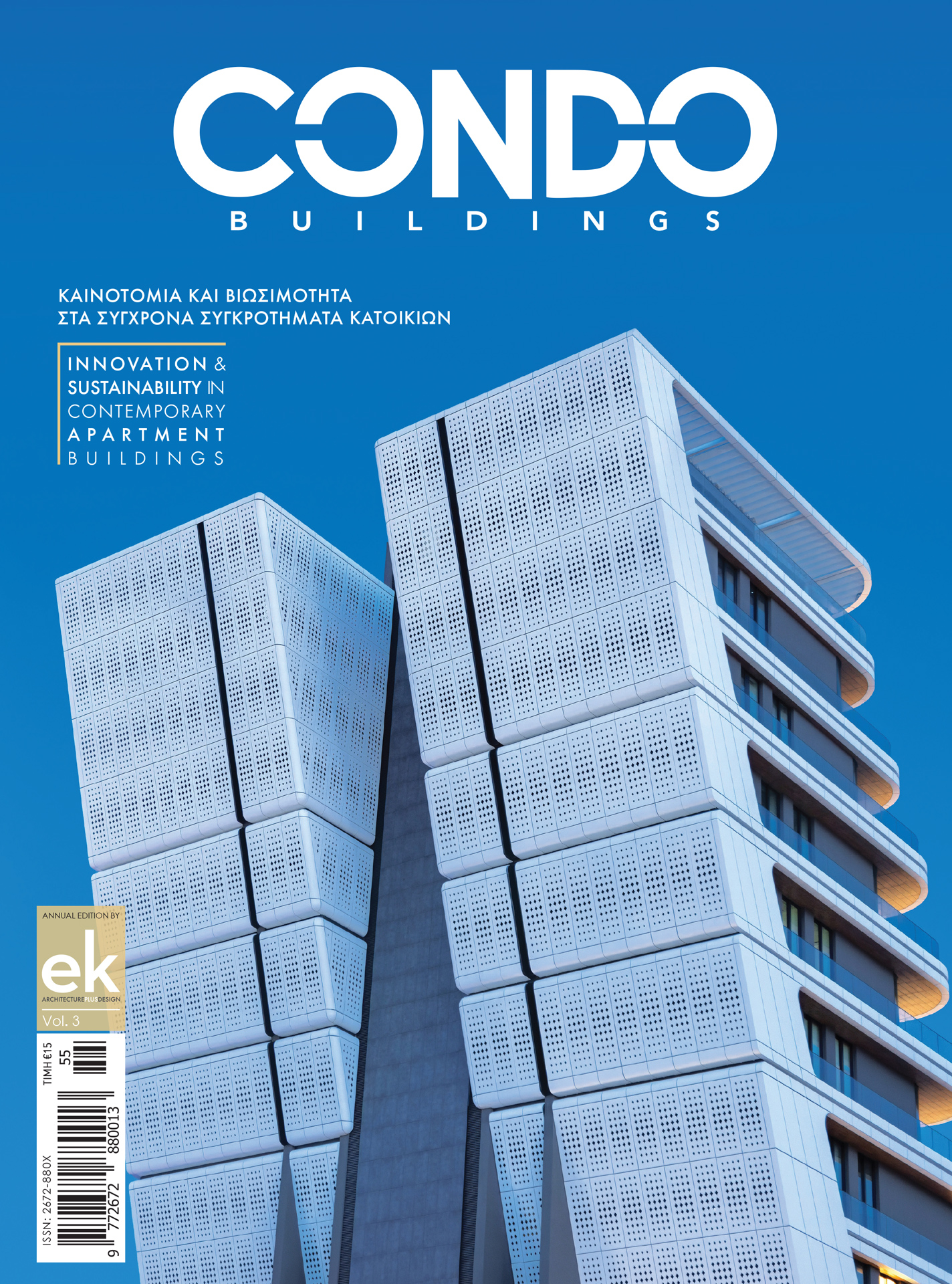 H ετήσια δίγλωσση έκδοση Condo Buildings, του ek magazine, είναι αφιερωμένη στις πολυκατοικίες νέας γενιάς από την Ελλάδα και την Κύπρο. Η τυπολογία της πολυκατοικίας συνεχίζει να εξελίσσεται, εμπλουτίζοντας τις δυνατότητές της με νέους τρόπους οργάνωσης του χώρου και ανανεωμένες κατασκευαστικές τεχνικές. Στόχος της θεματικής αυτής έκδοσης είναι να καταγράψει τα πιο ενδιαφέροντα παραδείγματα σύγχρονων πολυκατοικιών, σε ετήσια περιοδικότητα, δημιουργώντας ένα αρχείο με τα νέα πρότυπα συλλογικής κατοίκησης.