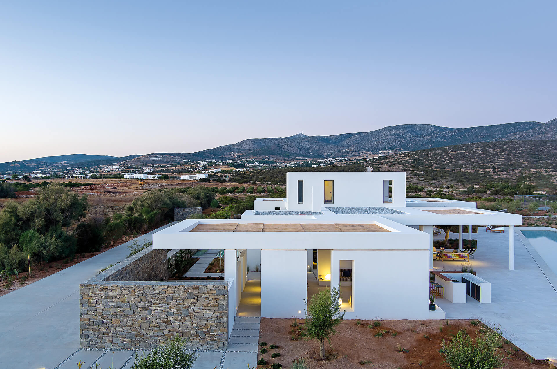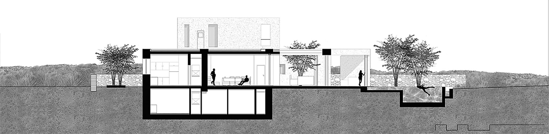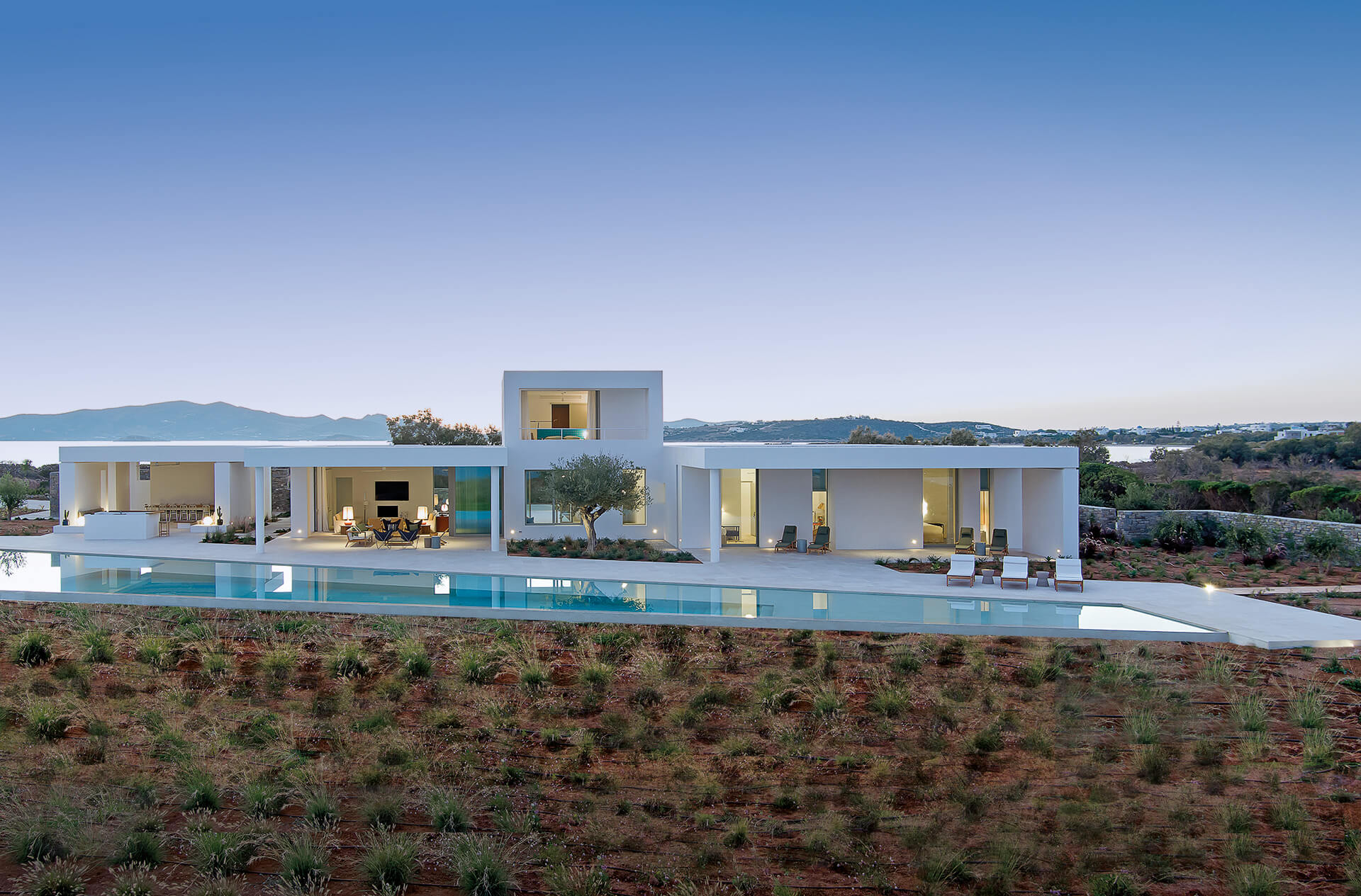 Η αρχιτεκτονική, παρούσα στο ιδανικό αυτό τοπίο, δημιουργεί μια κατοικία ξεκούρασης και απόλαυσης. Η αναφορά στο ελληνικό καλοκαίρι είναι εμφανής στον τρόπο με τον οποίο οι χώροι δεν είναι μονοσήμαντα ορισμένοι αλλά διαρρέουν προς το περιβάλλον και τη θάλασσα. Η κατοικία είναι μια ερμηνεία, ένας δανεισμός στοιχείων από τις αρχές του μοντερνισμού -που τόσο σχετίζεται με την κυκλαδική αρχιτεκτονική- με στόχο την ενοποίηση και την απαλοιφή των ορίων μεταξύ του φυσικού και του κατοικημένου χώρου.