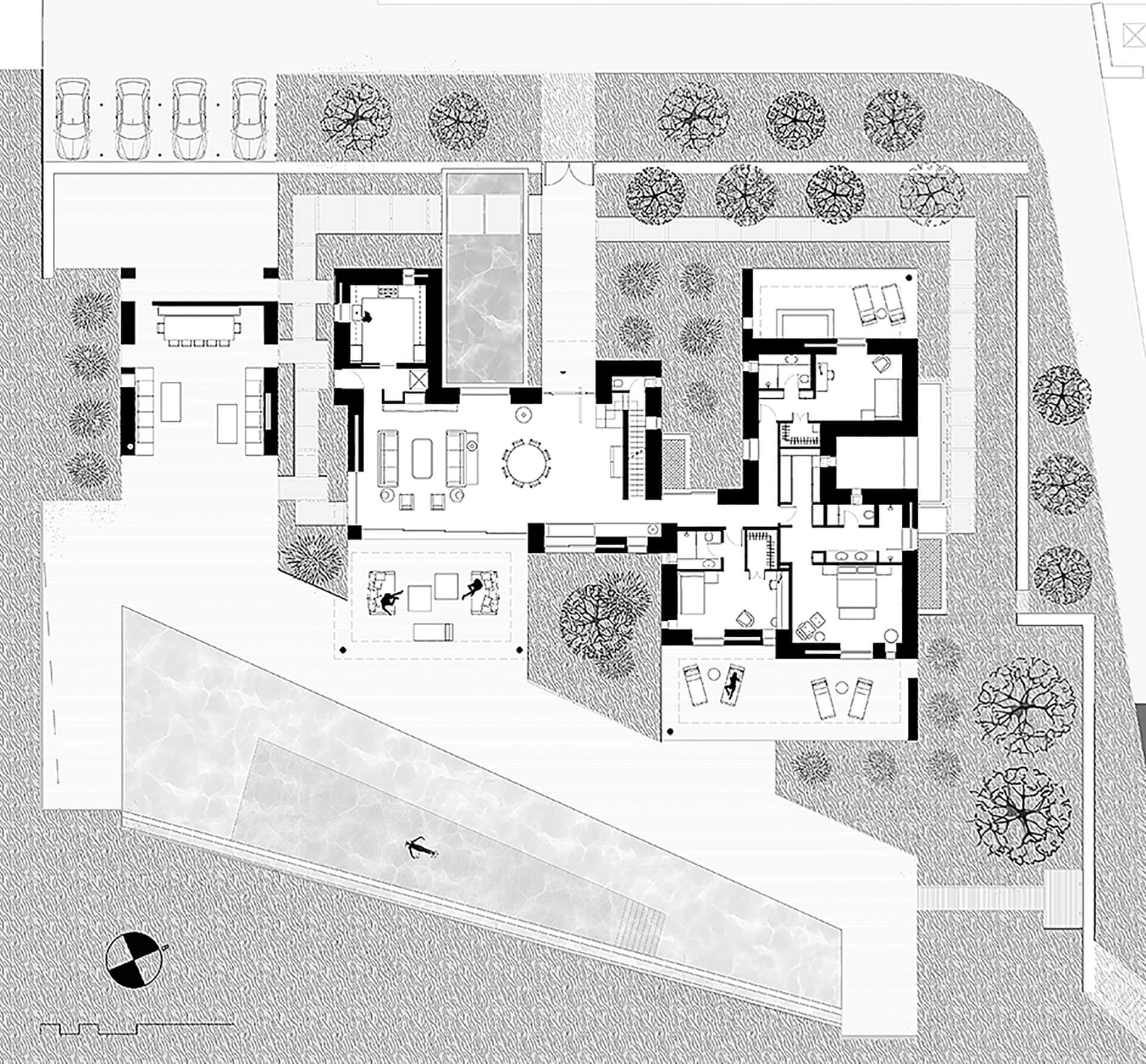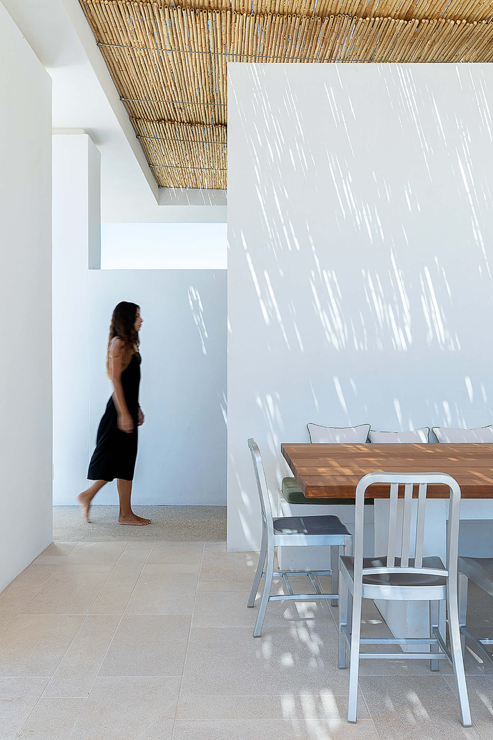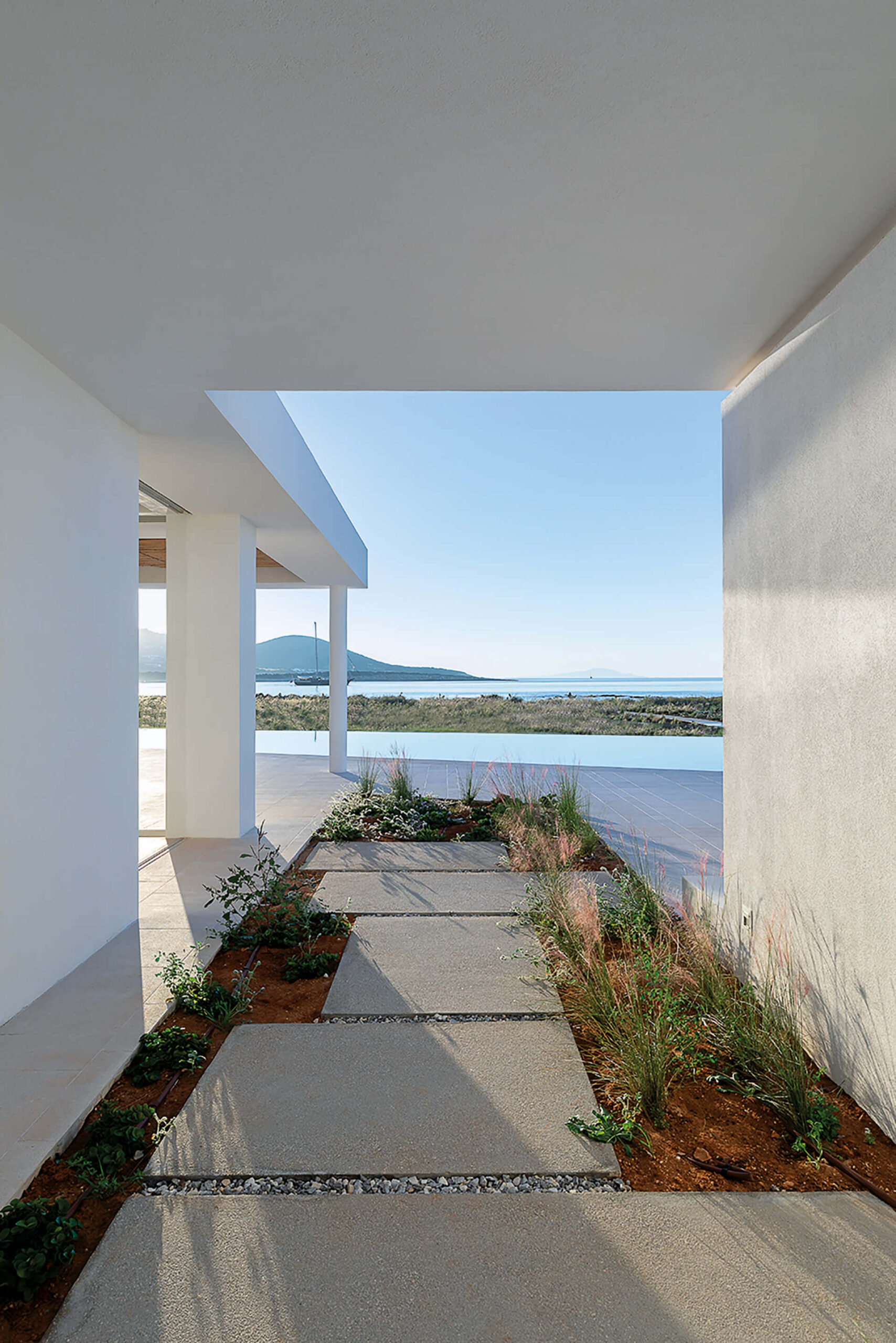 Τα υδάτινα στοιχεία, οι αυλές, καθώς και η φύτευση απλώνονται σαν επίπεδα, ενοποιώντας τη θάλασσα, την παραλία και το τοπίο με τους χώρους διημέρευσης, συνεχίζοντας έτσι τη διαδρομή από την κατοικία προς τη θάλασσα. Οι πέργκολες, συνεπίπεδες με τις μεγάλες πλάκες, συμπληρώνονται με καλάμι, επεκτείνοντας την κατοικία και διαμορφώνοντας μια οπτική συνέχεια. Τα τοιχία, οι πέργκολες, οι επιφάνειες νερού, τα δώματα με χαλίκι, οι αυλές με το ιδιαίτερο πέτρωμα, καθώς και οι μεγάλοι ημιυπαίθριοι διαμορφώνουν μια αρχιτεκτονική που ορίζεται από τη συνέχεια των υλικών.