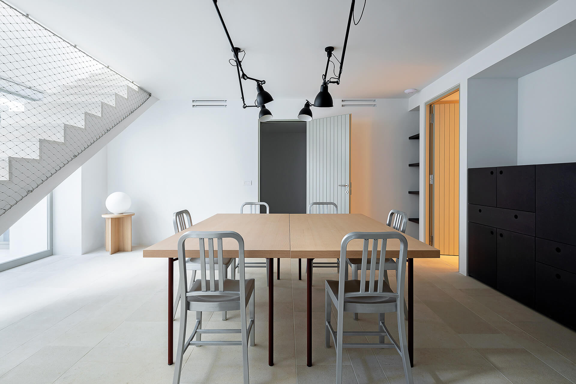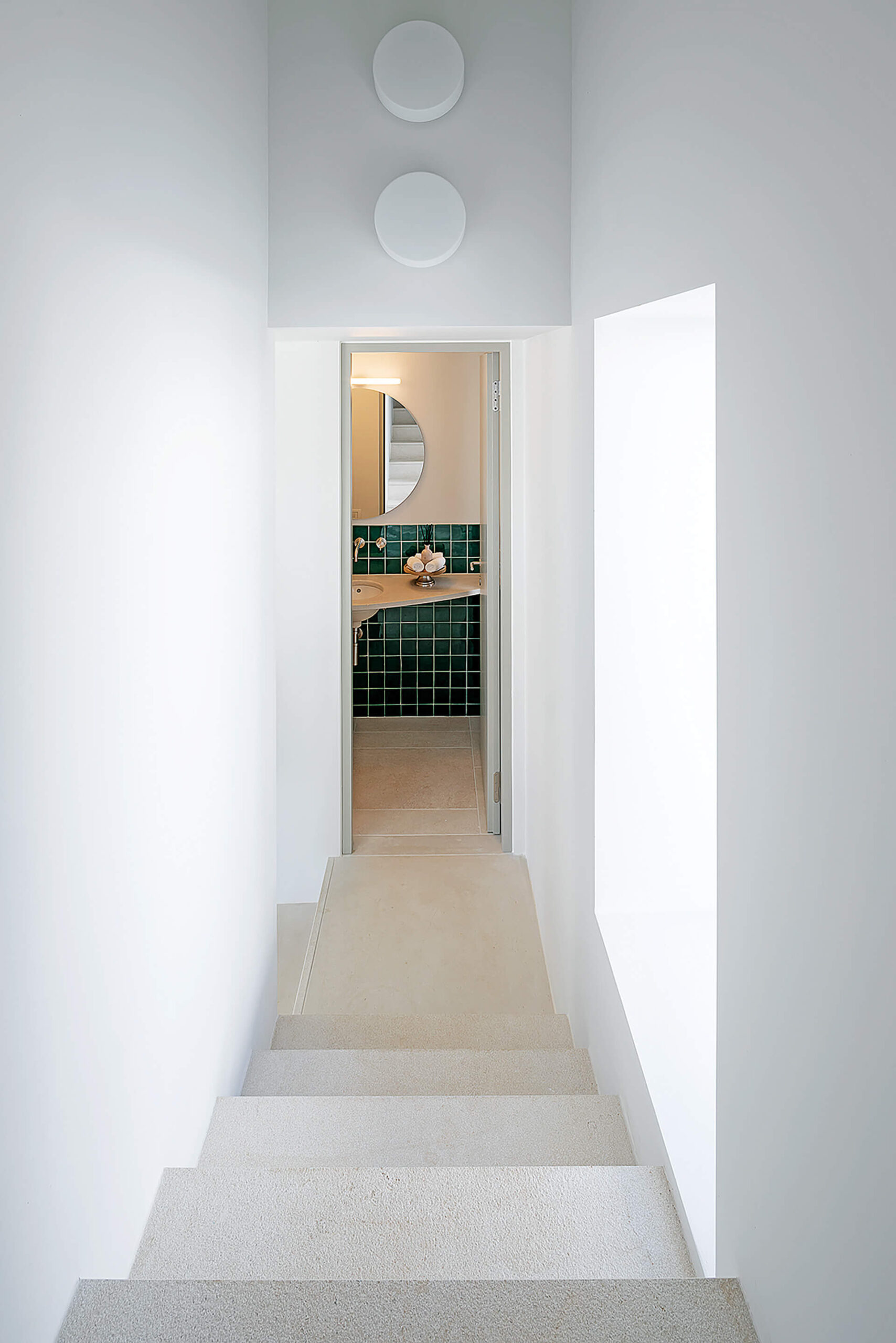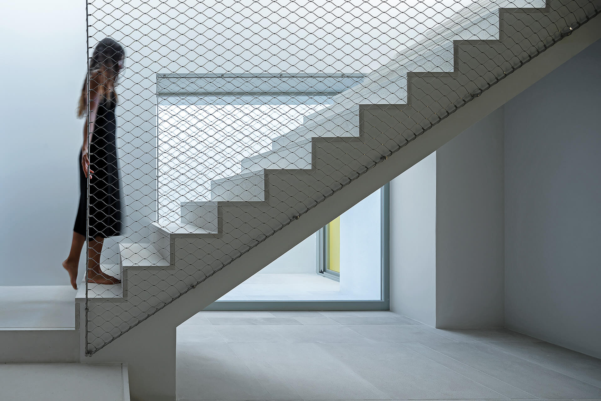 Τα υδάτινα στοιχεία, οι αυλές, καθώς και η φύτευση απλώνονται σαν επίπεδα, ενοποιώντας τη θάλασσα, την παραλία και το τοπίο με τους χώρους διημέρευσης, συνεχίζοντας έτσι τη διαδρομή από την κατοικία προς τη θάλασσα. Οι πέργκολες, συνεπίπεδες με τις μεγάλες πλάκες, συμπληρώνονται με καλάμι, επεκτείνοντας την κατοικία και διαμορφώνοντας μια οπτική συνέχεια. Τα τοιχία, οι πέργκολες, οι επιφάνειες νερού, τα δώματα με χαλίκι, οι αυλές με το ιδιαίτερο πέτρωμα, καθώς και οι μεγάλοι ημιυπαίθριοι διαμορφώνουν μια αρχιτεκτονική που ορίζεται από τη συνέχεια των υλικών.