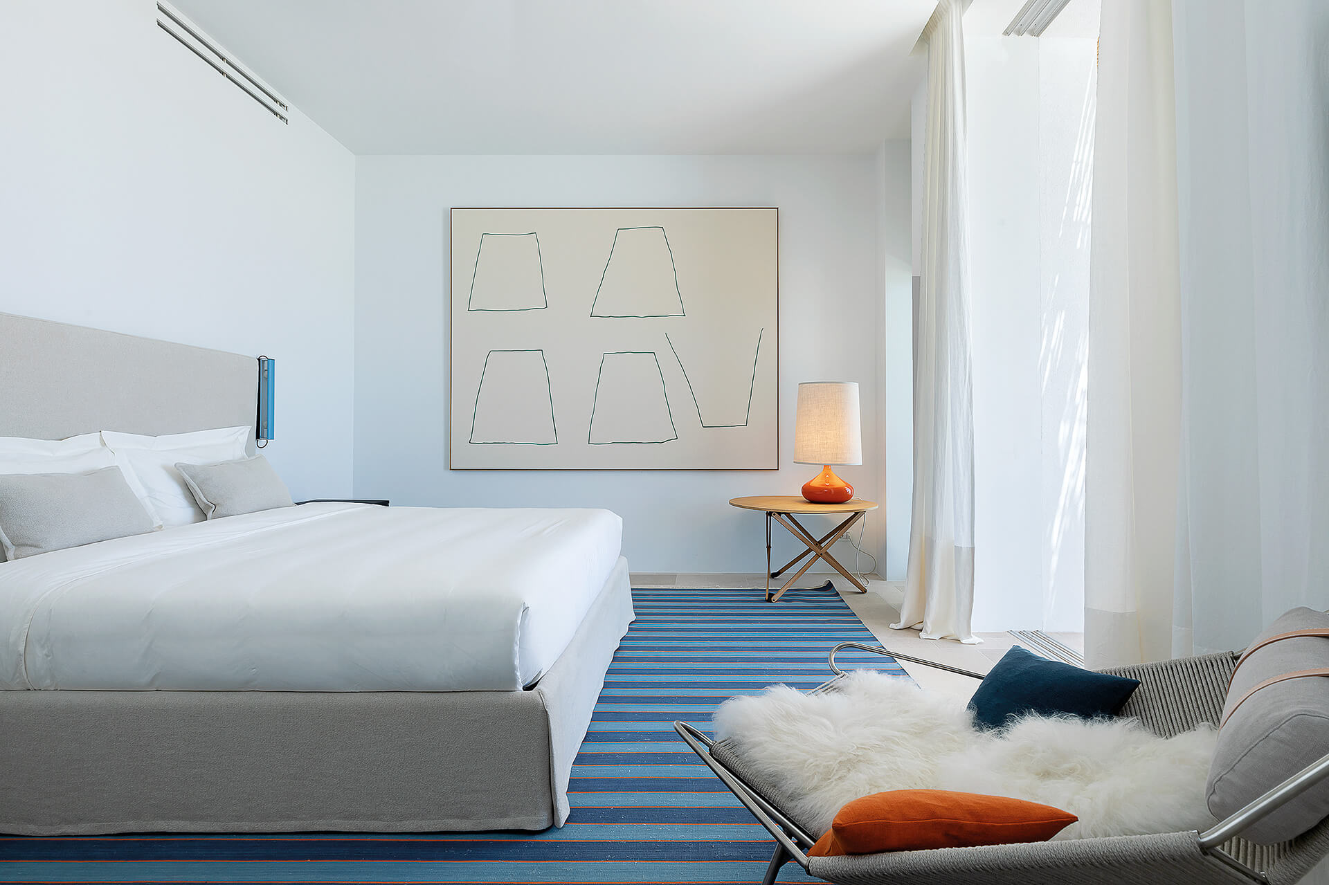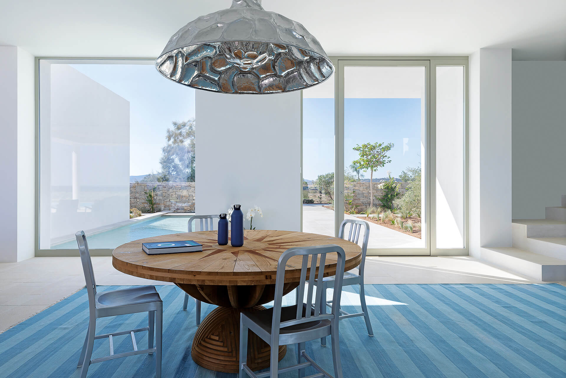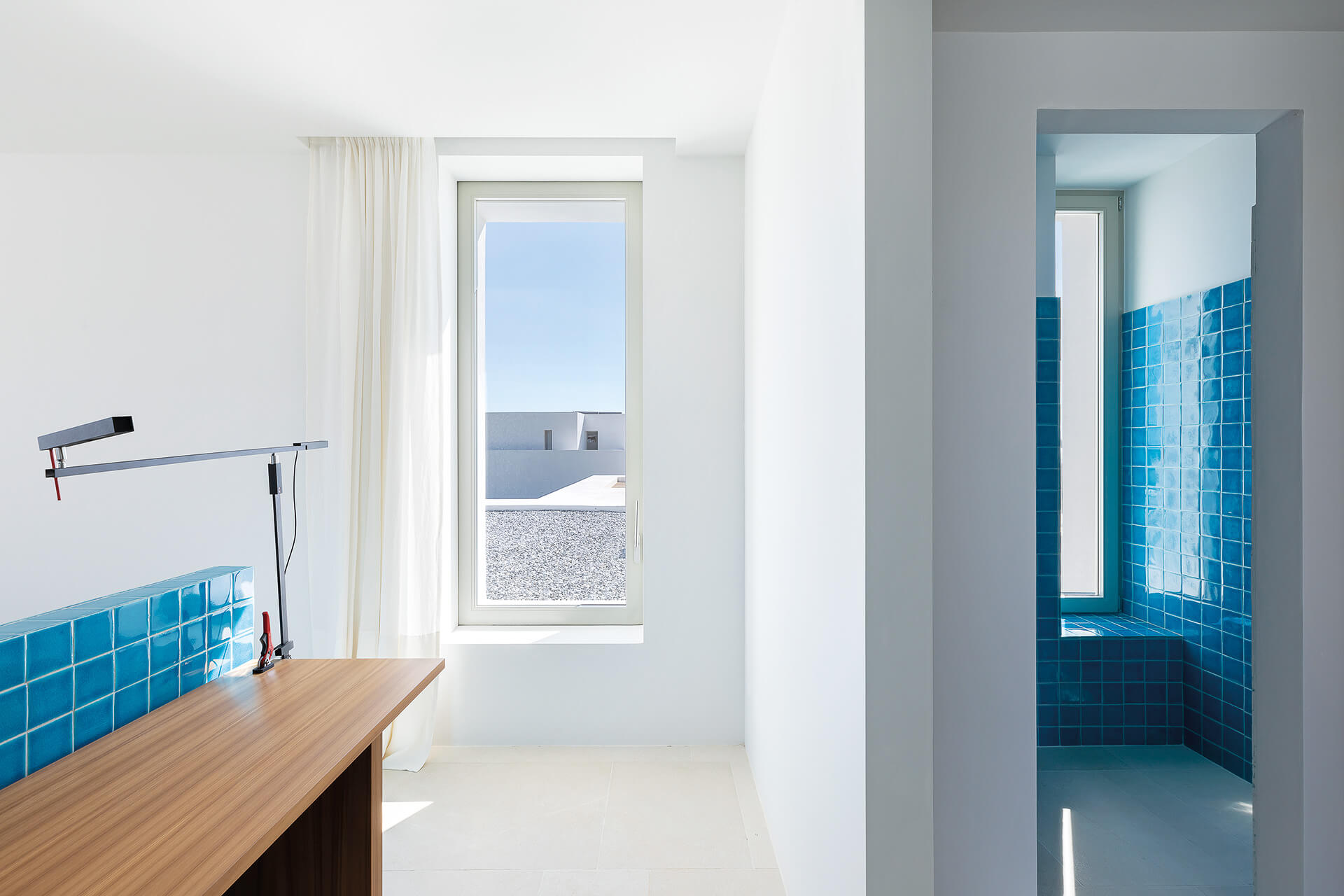 Οι εσωτερικοί χώροι διαμορφώνονται σε συσχέτιση με την τοπική αρχιτεκτονική, το πνεύμα, την ιστορία και τη φύση αλλά και από την προσωπικότητα και τις ανάγκες των κατοίκων. Έτσι, γίνεται χρήση αποκλειστικά φυσικών υλικών και χρωμάτων. Η παλέτα τους εμπλουτίζεται και δημιουργεί μία χαρακτηριστική διαστρωμάτωση. Τοπική πέτρα, ελαφρώς σφυρηλατημένη, στρωμένη σε ένα περίπλοκο και χαρακτηριστικό μοτίβο, καλύπτει όλα τα εσωτερικά και εξωτερικά δάπεδα, μετριάζοντας το εκθαμβωτικό λευκό των τοίχων. Το ανοιχτόχρωμο ξύλο όλων των επίπλων φέρνει τη φύση μέσα στην κατοικία ενώ τα υφάσματα και τα ειδικά σχεδιασμένα χαλιά διαδραματίζουν επίσης σημαντικό ρόλο, με τις διαφορετικές υφές και τα χρώματά τους. Το μεγαλύτερο μέρος των επίπλων κατασκευάζεται κατά παραγγελία, εκτός από μερικά απλά κομμάτια σκανδιναβικού σχεδιασμού. Τα πλακάκια από τερακότα σε έντονα μεσογειακά χρώματα χαρακτηρίζουν τα μπάνια ενώ ο φωτισμός είναι εξαιρετικά διακριτικός, δίνοντας πρωταγωνιστικό ρόλο στη μαγεία του φεγγαριού και των αστεριών τη νύχτα.