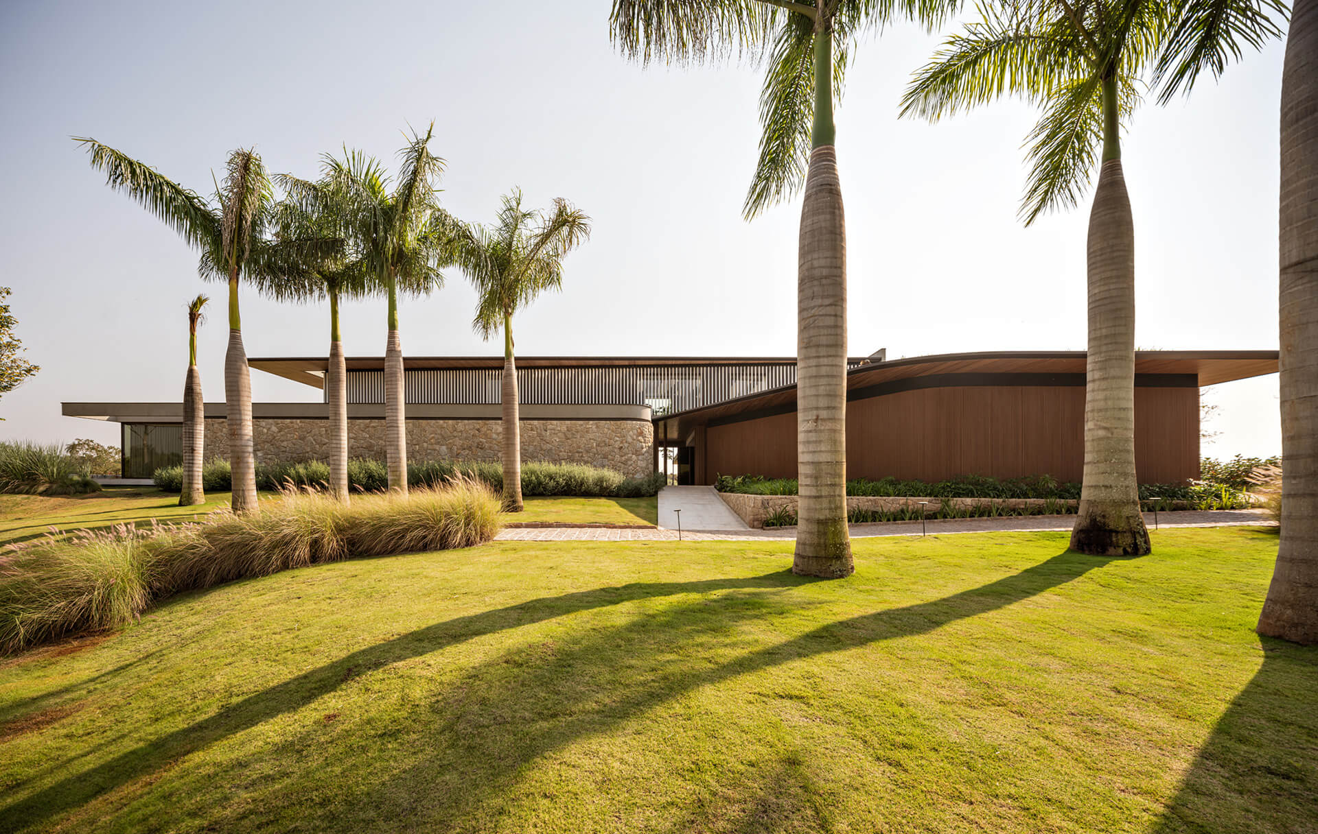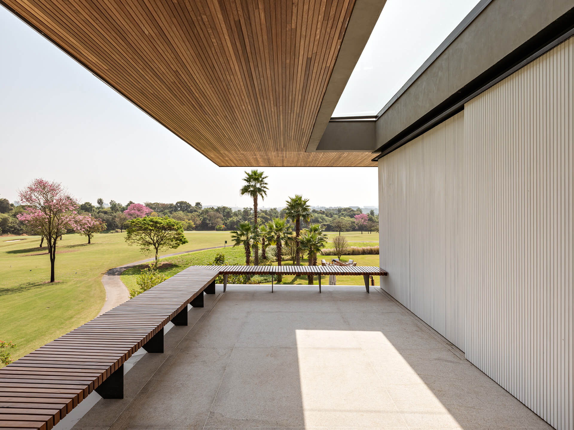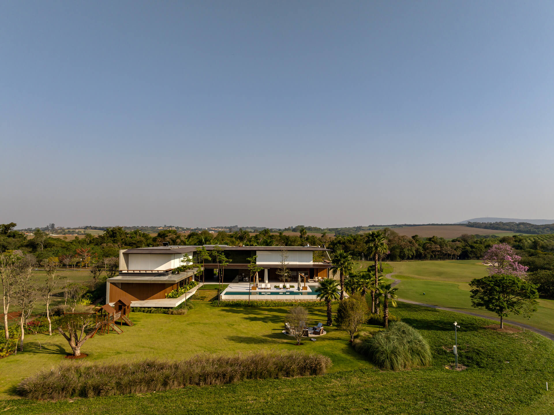 Η κατοικία βρίσκεται σε ένα οικόπεδο εξαιρετικής φυσικής ομορφιάς και περιβαλλόμενη από γήπεδο γκολφ και σχεδιάζεται ως μια αρχιτεκτονική σύνθεση που επιδιώκει την ομαλή ένταξή της στο τοπίο. Μέσα από τη μελετημένη άρθρωση της ογκοπλασίας και της υλικότητας, το έργο ισορροπεί ένα εκτεταμένο λειτουργικό πρόγραμμα με μια αίσθηση χωρικής σαφήνειας και αρμονίας. Η κάτοψη σε σχήμα L τοποθετείται σε ελαφρώς υπερυψωμένο επίπεδο σε σχέση με τον δρόμο, εξασφαλίζοντας ανεμπόδιστη πανοραμική θέα στο κατά τα άλλα επίπεδο τοπίο. Η χειρονομία αυτή δημιουργεί μια σταδιακή χωρική μετάβαση, ενισχύοντας παράλληλα τον συνεχή διάλογο μεταξύ εσωτερικών και εξωτερικών χώρων.
