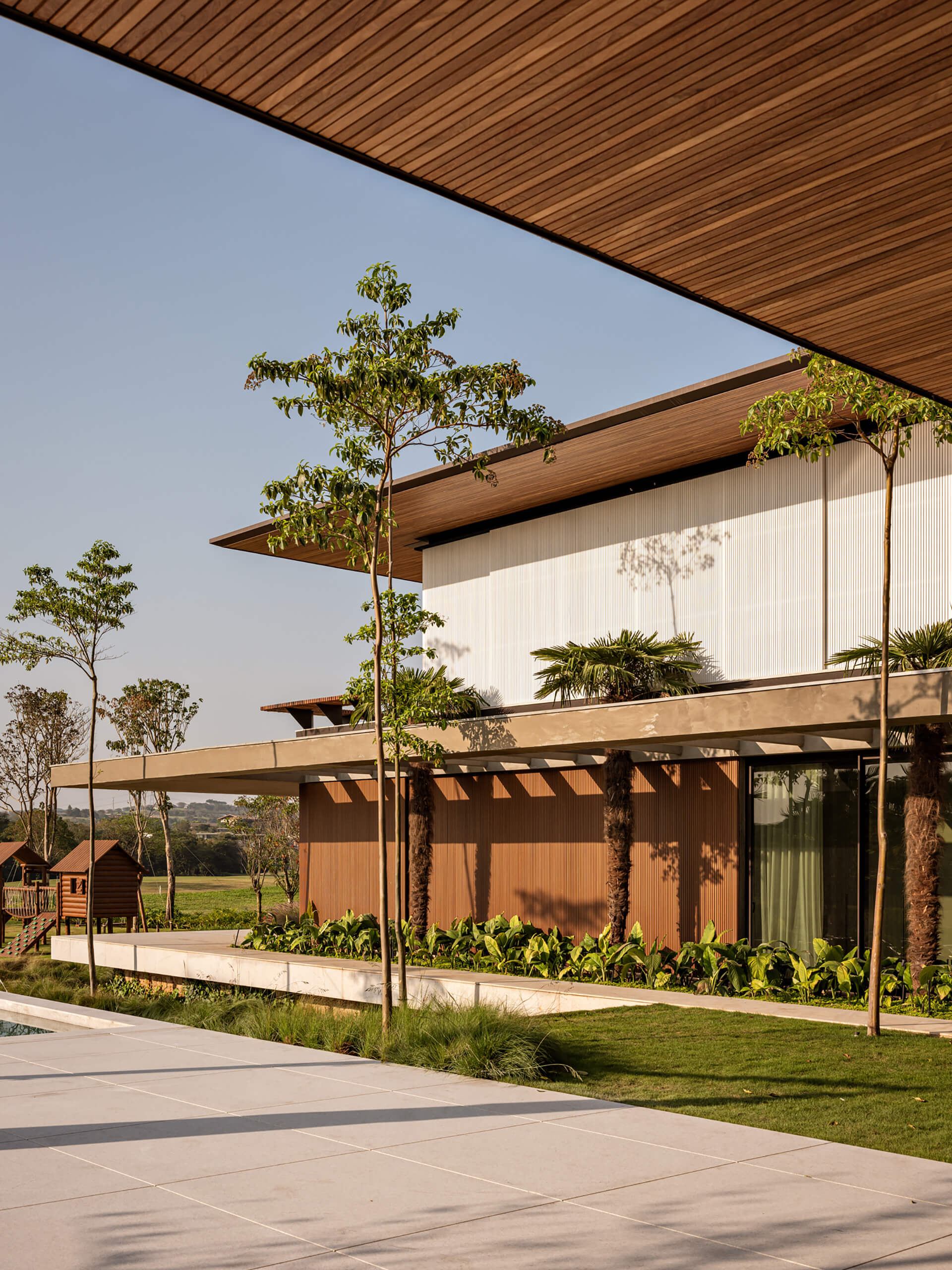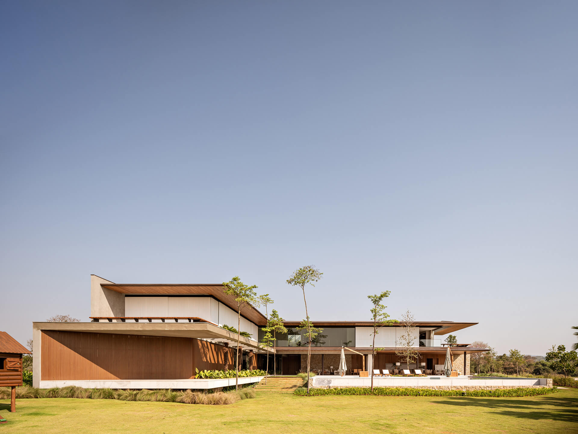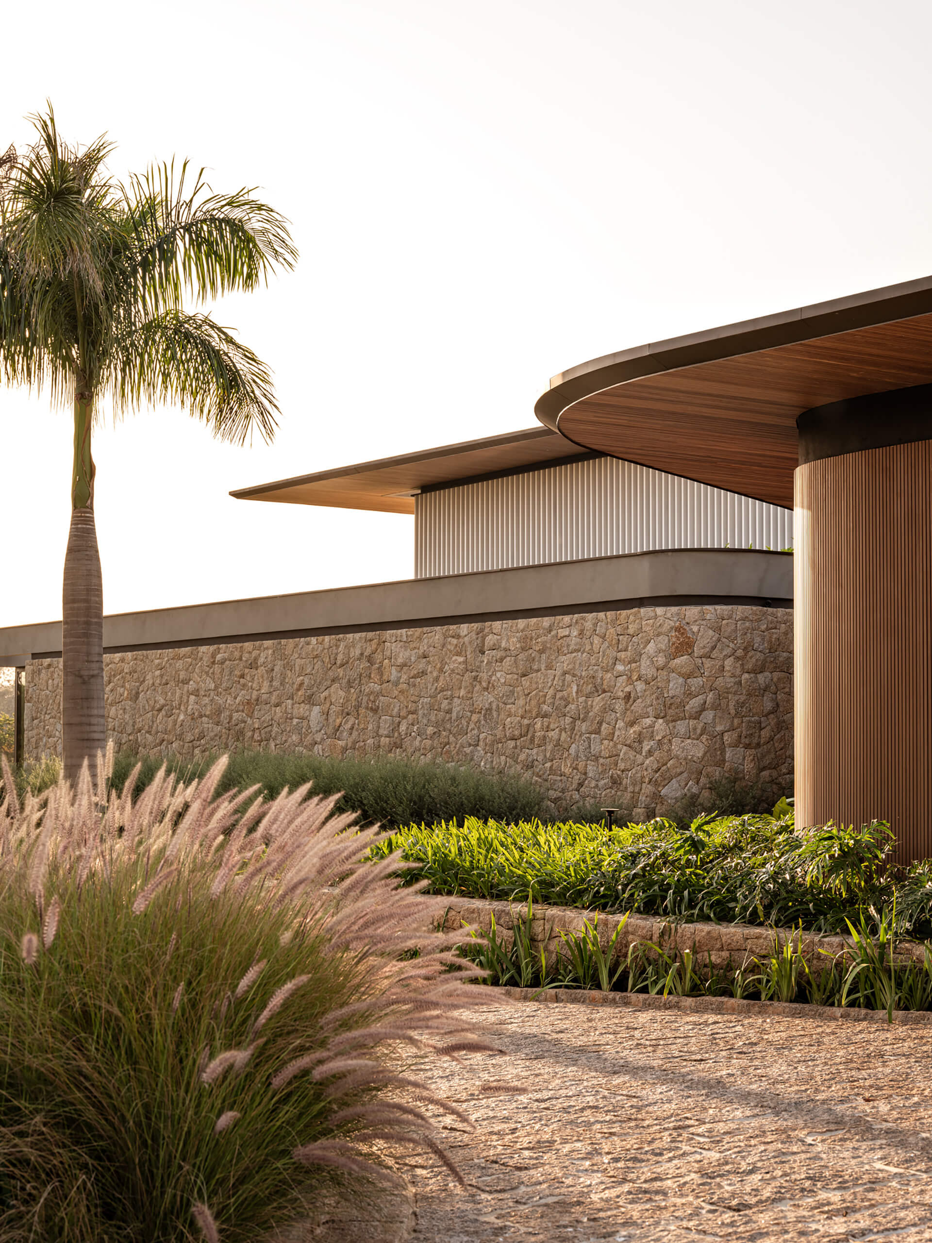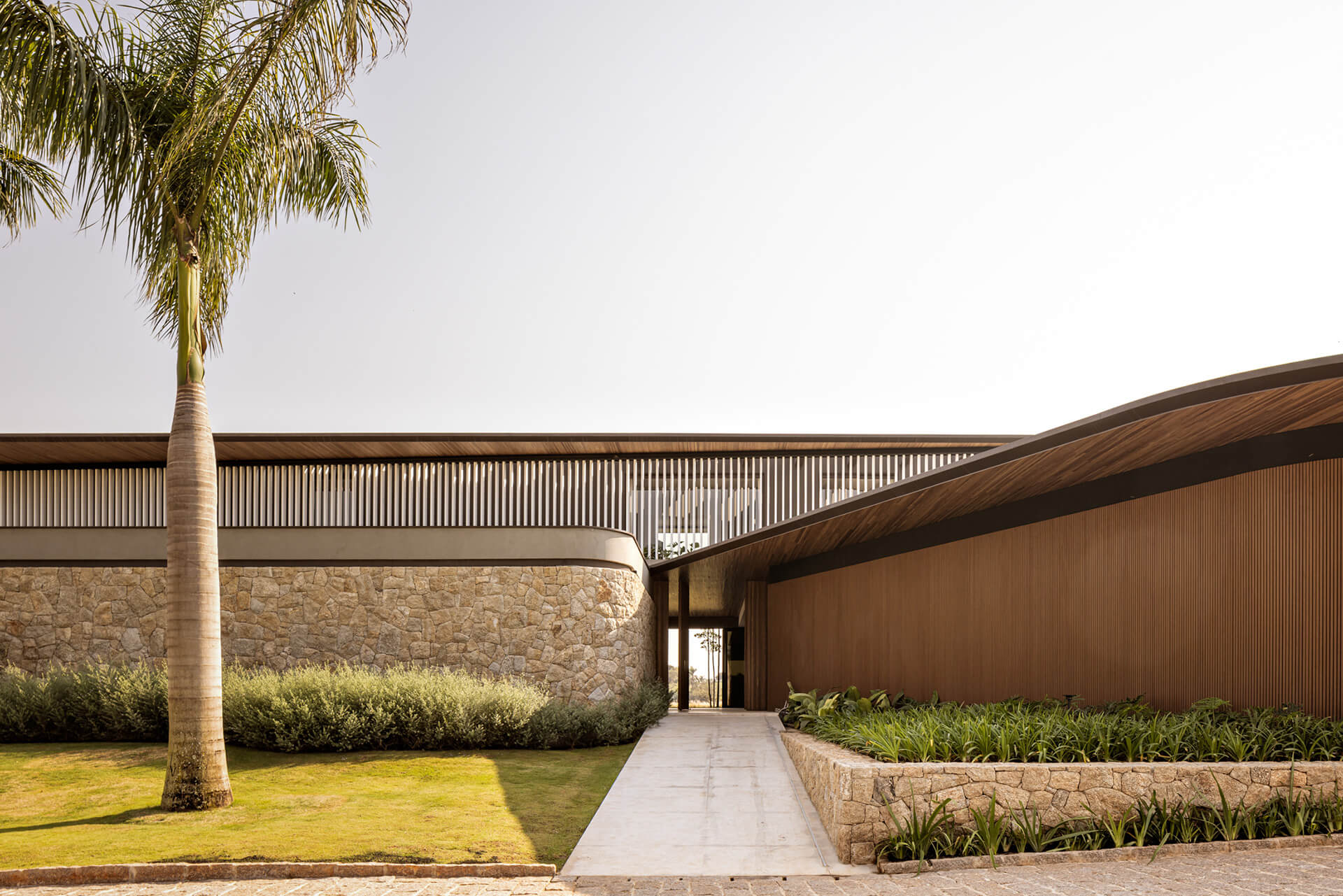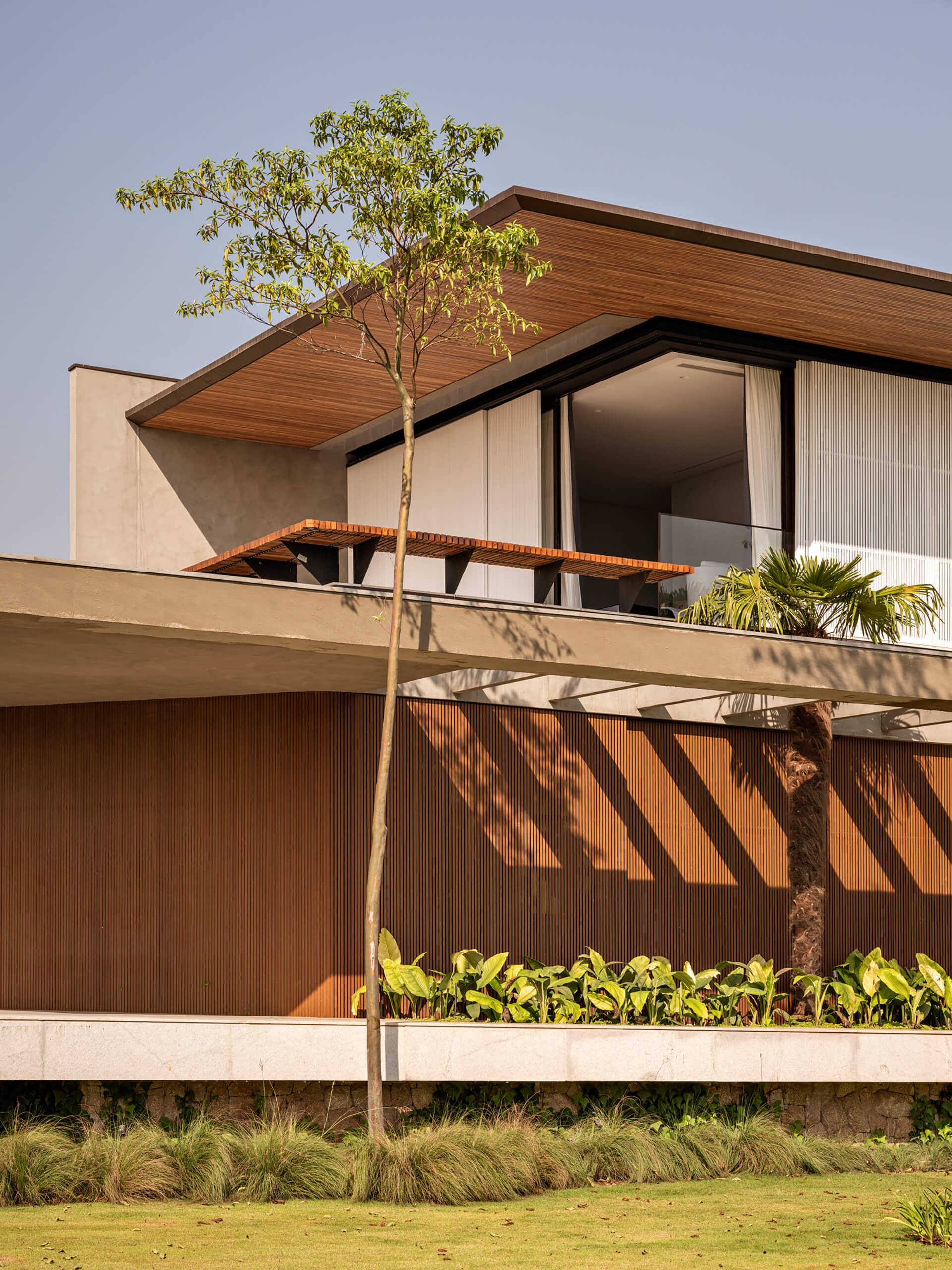 Η μορφολογική γλώσσα της κατοικίας διαμορφώνεται μέσα από την αλληλεπίδραση έντονων οριζόντιων γραμμών και μιας σειράς λεπτών γεωμετρικών μετασχηματισμών. Οι γωνίες αποτμούνται, καμπυλώνονται ή αποκλίνουν, δημιουργώντας μια δυναμική αρχιτεκτονική σύνθεση που συνδυάζει ακρίβεια και εκφραστική ρευστότητα. Η παλέτα υλικών ενισχύει τη σχέση με το περιβάλλον, μέσω φωτεινών και γήινων τόνων που εξασφαλίζουν οπτική συνέχεια με το τοπίο. Τα ξύλινα στοιχεία, σε επενδύσεις και οροφές, συνδυάζονται με μεταλλική κατασκευή, ενώ το εμφανές ανοιχτόχρωμο σκυρόδεμα εισάγει μια διακριτική αντίθεση με τις θερμότερες υφές του ισογείου. Ένα μεγάλο διάτρητο πανέλο στον επάνω όροφο ενισχύει την αίσθηση ελαφρότητας, συμβάλλοντας στη στρωματική διαμόρφωση της όψης.