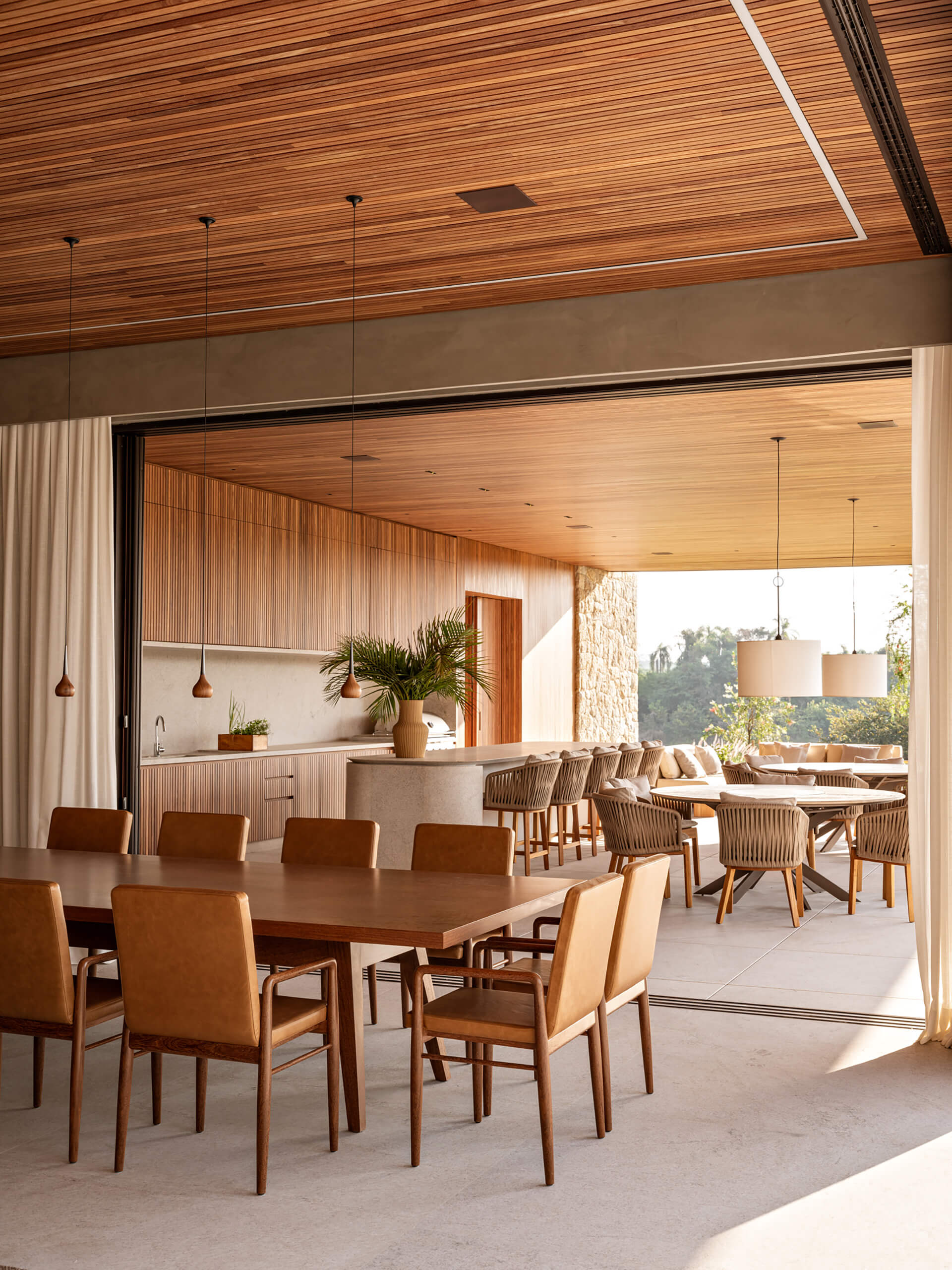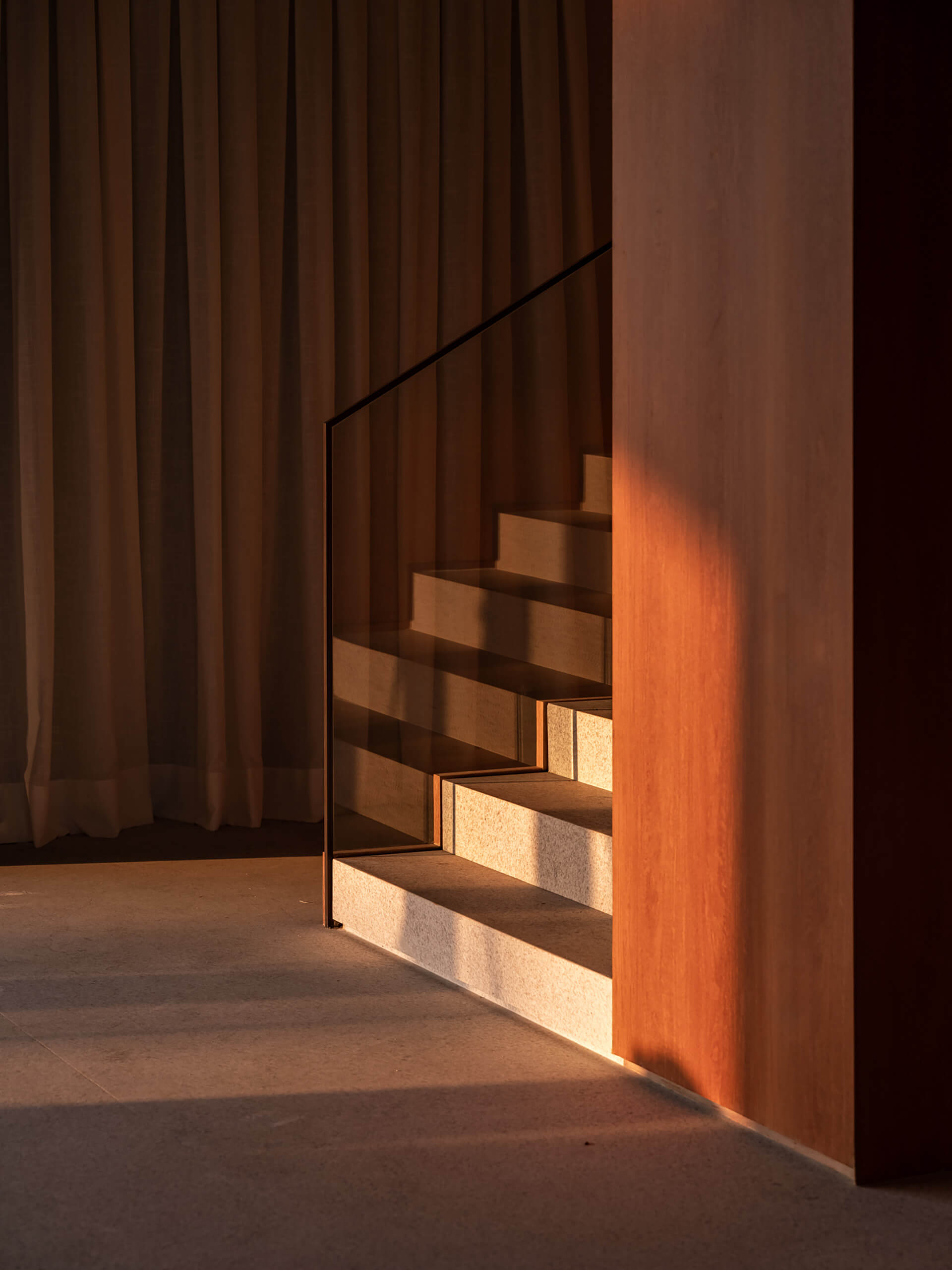 Μεγάλες υάλινες επιφάνειες διασφαλίζουν συνεχή οπτική σύνδεση με το τοπίο, πλαισιώνοντας τη θέα και ενισχύοντας τον στοχαστικό χαρακτήρα της κατοικίας. Αρχιτεκτονικά στοιχεία όπως πέργκολες και κεκλιμένα επίπεδα ρυθμίζουν το παιχνίδι φωτός και σκιάς στις όψεις, εισάγοντας μια χρονική μεταβλητότητα κατά τη διάρκεια της ημέρας. Στον επάνω όροφο, η κύρια σουίτα και τα επιπλέον υπνοδωμάτια αναπτύσσονται κατά μήκος των αξόνων της κάτοψης σε σχήμα L, συνοδευόμενα από χώρους εργασίας που αξιοποιούν την ηρεμία του τοπίου. Ένα μεταλλικό διάτρητο φίλτρο επιτρέπει τη διείσδυση του φωτός διατηρώντας την ιδιωτικότητα, ενώ ένα συνεχές μεταλλικό γείσο οριοθετεί διακριτικά το περίγραμμα του όγκου. Στο εσωτερικό, η αρχιτεκτονική γλώσσα ακολουθεί τη λογική του εξωτερικού, συνδυάζοντας θερμούς τόνους, φυσικό φως, επιλεγμένα έργα τέχνης και σχεδιαστικά αντικείμενα, συνθέτοντας ένα ενιαίο και εκλεπτυσμένο περιβάλλον κατοίκησης.
