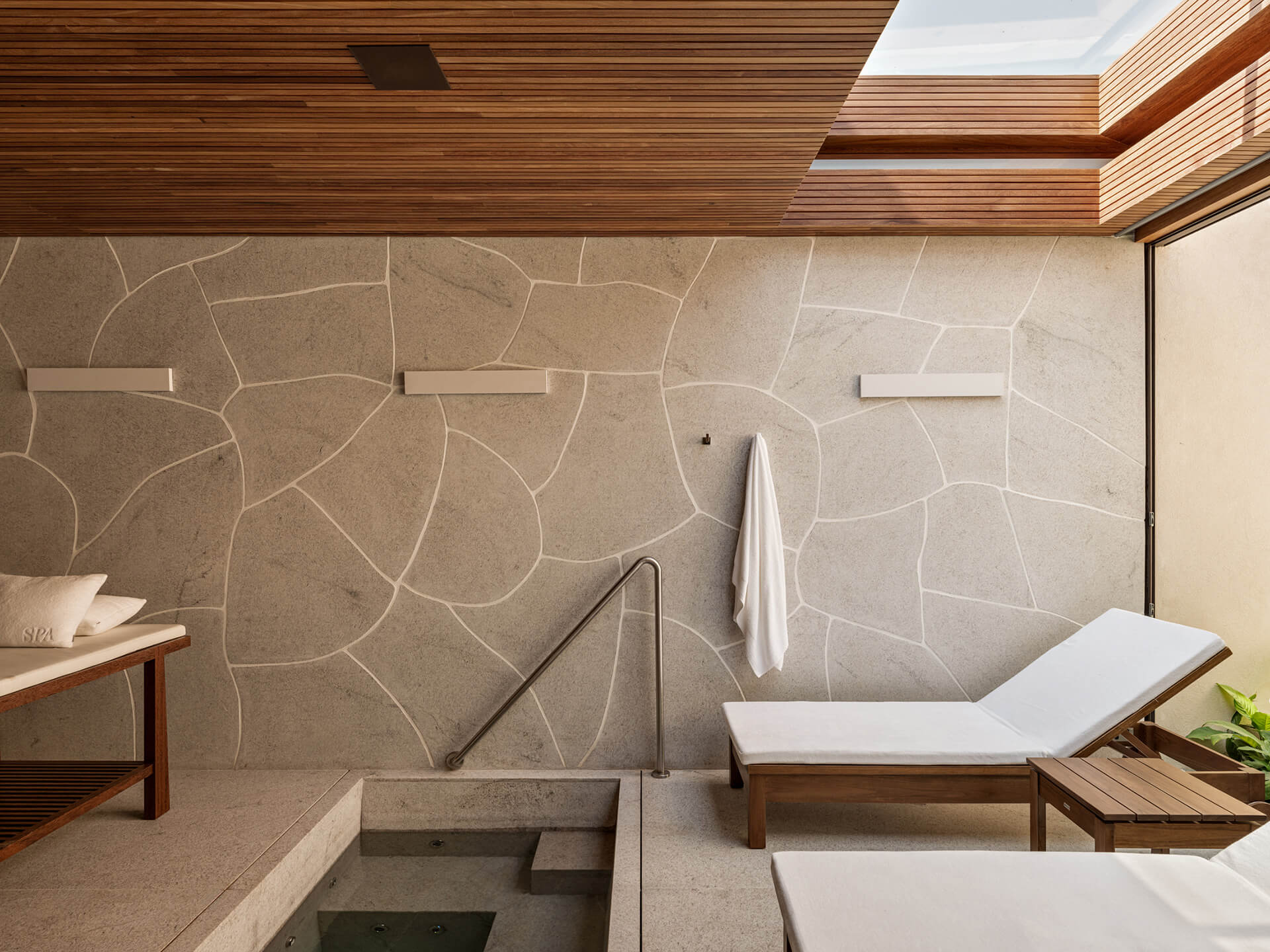 Η σύνθεση οργανώνεται μέσα από μια σαφή λειτουργική διάταξη που διαχωρίζει την κατοικία σε δύο βασικούς όγκους. Ένας επιμήκης όγκος φιλοξενεί τις ιδιωτικές λειτουργίες, όπως τρεις σουίτες, έναν χώρο φυσικοθεραπείας και ένα γραφείο, ενώ ένας εγκάρσιος όγκος συγκεντρώνει τις κοινόχρηστες και υποστηρικτικές χρήσεις, όπως η κουζίνα, η τραπεζαρία και οι βοηθητικοί χώροι. Κατά την είσοδο, ήπιες κεκλιμένες και καμπύλες επιφάνειες καθοδηγούν τη ματιά προς τον κύριο χώρο διημέρευσης, συγκροτώντας μια ρευστή χωρική αλληλουχία που συνδέεται άμεσα με τις ζώνες αναψυχής. Η ενσωμάτωση λειτουργιών όπως σάουνα, spa, γυμναστήριο και παιδικός χώρος ενισχύεται μέσω κινητών υαλοστασίων, που επιτρέπουν ευελιξία και συνέχεια. Το σύνολο αυτού του μετώπου αναψυχής φωτίζεται από φυσικό ζενιθιακό φως, εξασφαλίζοντας ιδιωτικότητα και χωρική καθαρότητα.