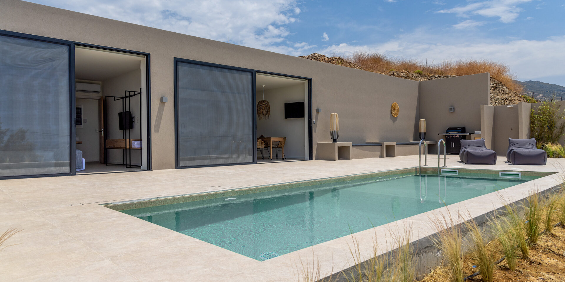 Κάθε κατοικία διαθέτει δύο υπνοδωμάτια και ένα master με το δικό του λουτρό, καθιστικό, κουζίνα και δεύτερο λουτρό, καθώς επίσης και ιδιωτική πισίνα με βεράντα που διαμορφώνεται με χτιστούς καναπέδες και barbeque. Το φυσικό φως εισέρχεται σε όλους τους χώρους μέσα από τους φωταγωγούς στα πίσω τμήματα των υπόσκαφων κατοικιών, ενώ οι χώροι που έχουν θέα προς τη θάλασσα, χάρη στα μεγάλα ανοίγματα της όψης τους, απολαμβάνουν το φυσικό τοπίο.