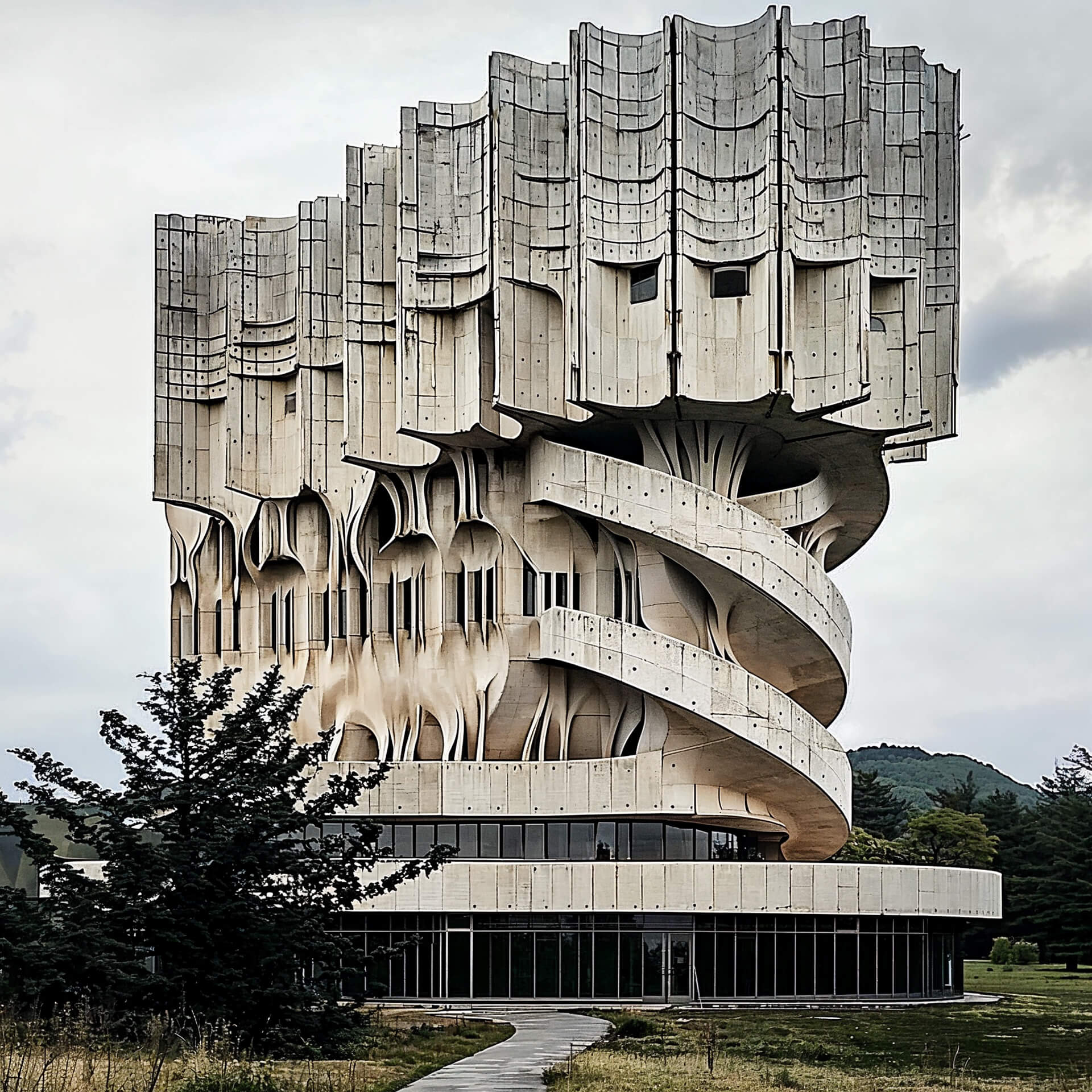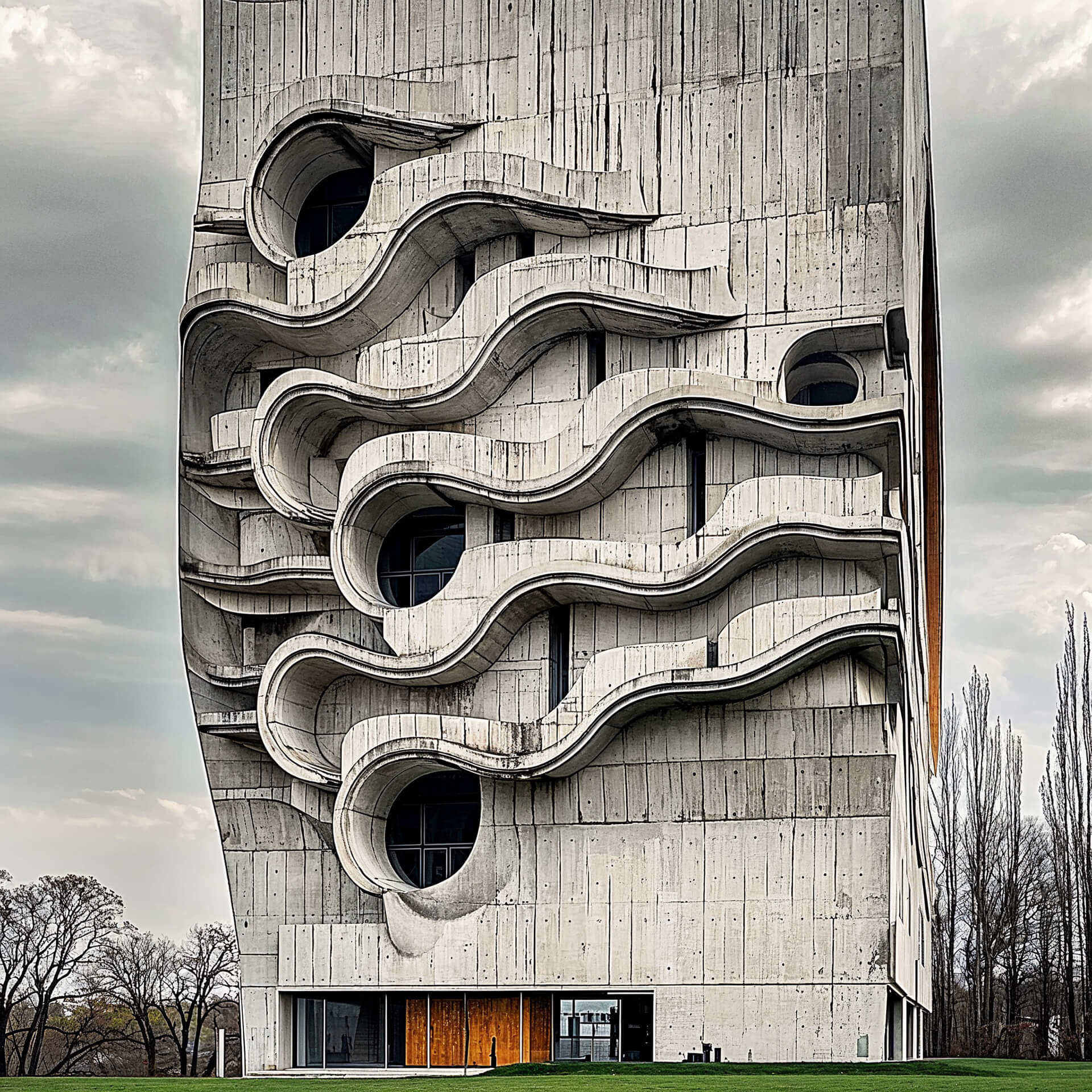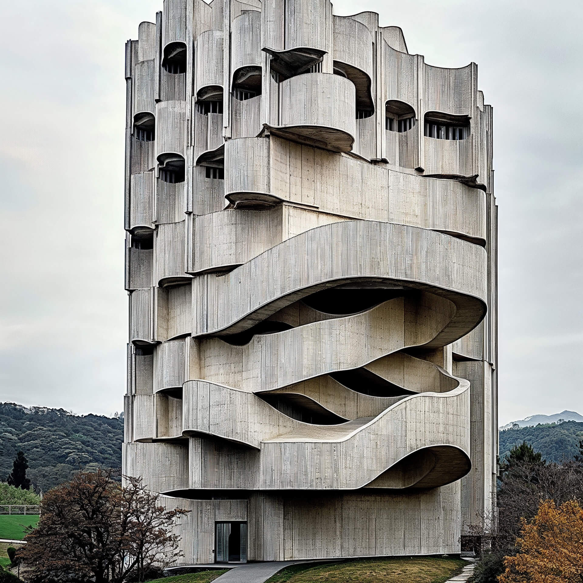 Το σκυρόδεμα, ως δομή και ταυτόχρονα ως “δέρμα”, υπερβαίνει τις άκαμπτες, μονολιθικές συνδηλώσεις του παραδοσιακού μπρουταλισμού, μέσα από ρευστές γεωμετρίες, δυναμικές σπείρες και βαθιά λαξευμένες όψεις. Η τεκτονική γλώσσα μετασχηματίζεται, από τη στατική μάζα σε έναν πιο εκφραστικό και ζωντανό ρόλο, όπου η αλληλεπίδραση φωτός, σκιάς και καμπυλότητας ζωντανεύει τη βαριά υλικότητα του σκυροδέματος.