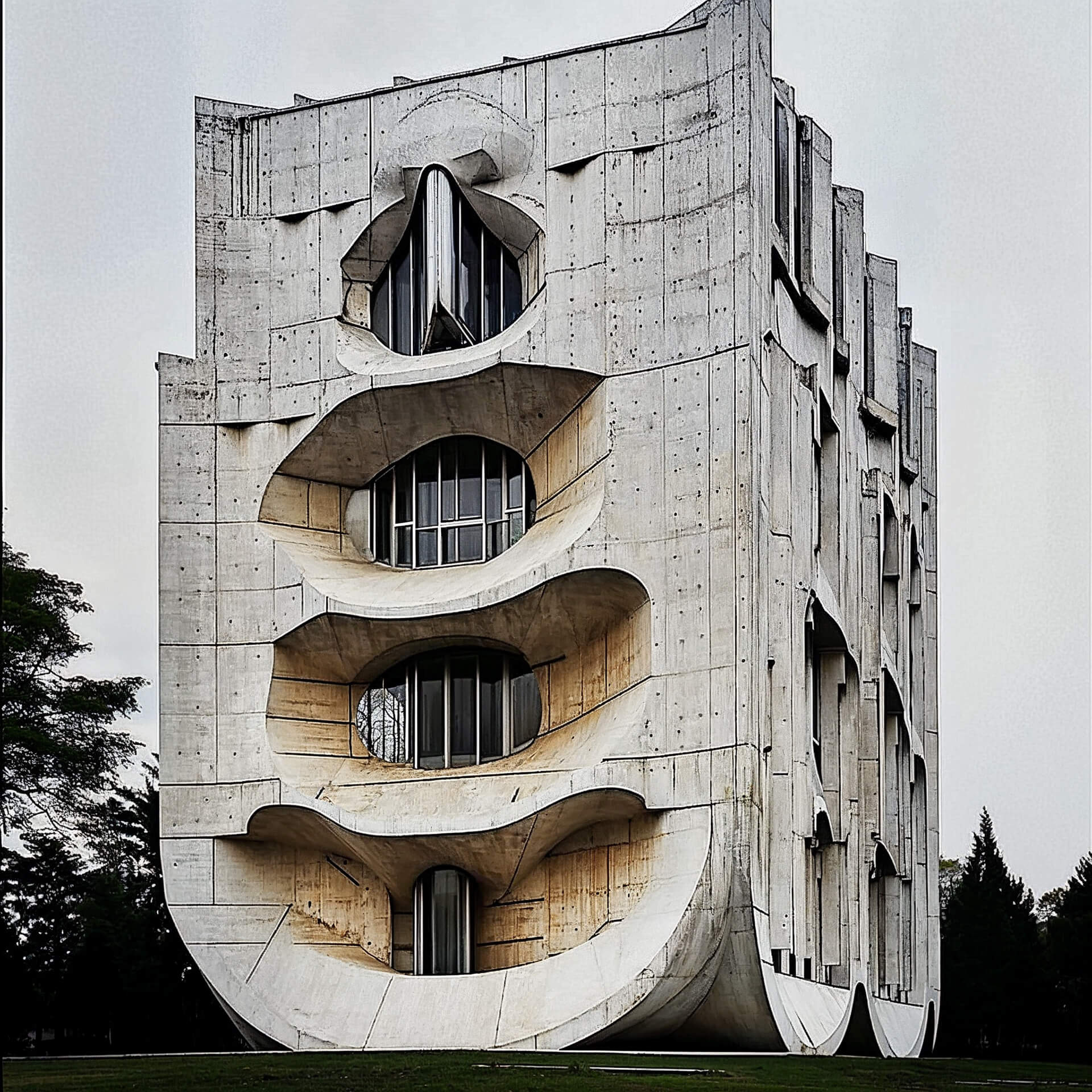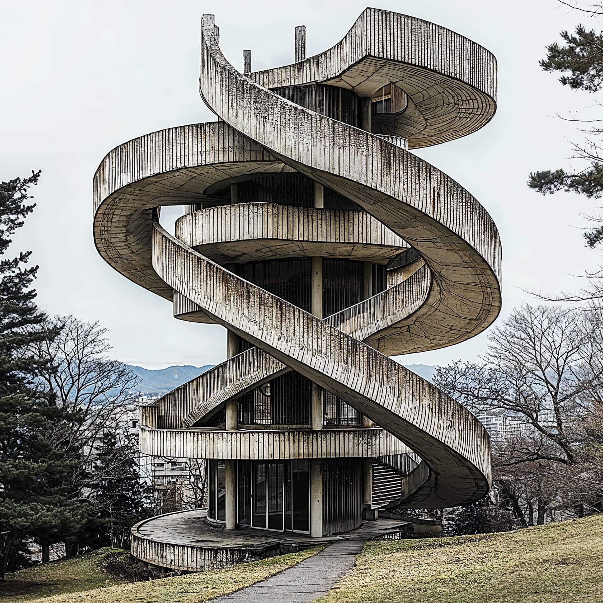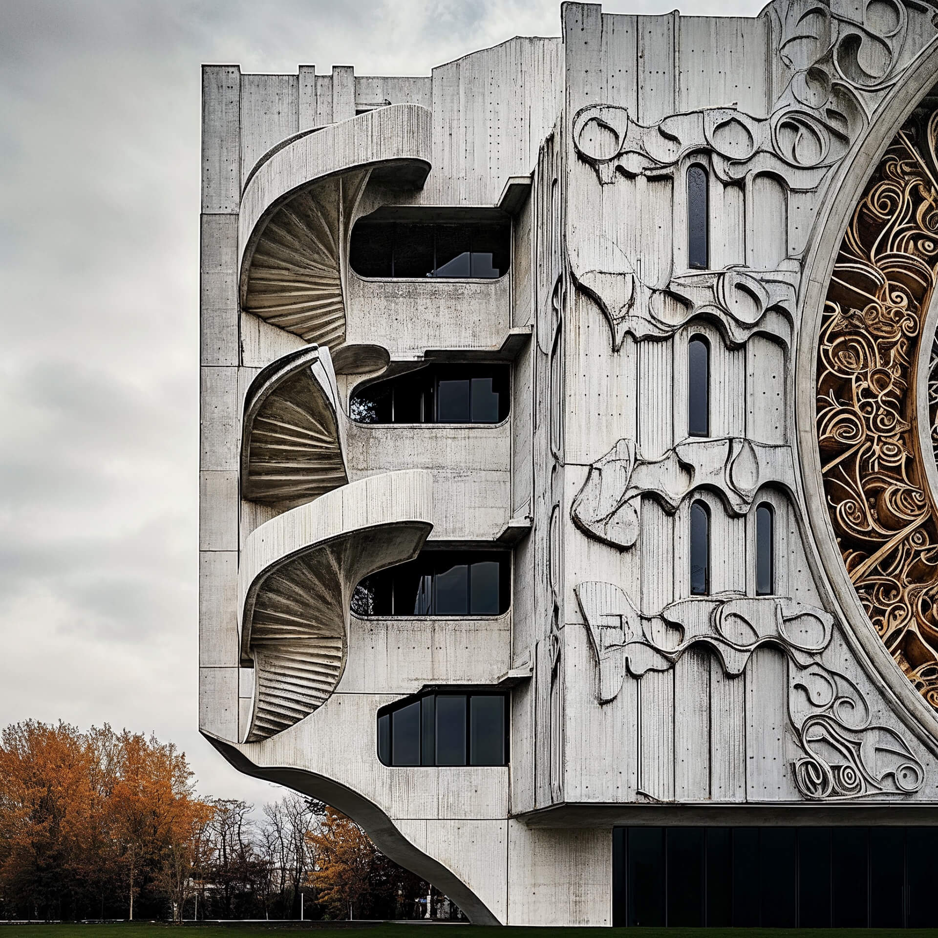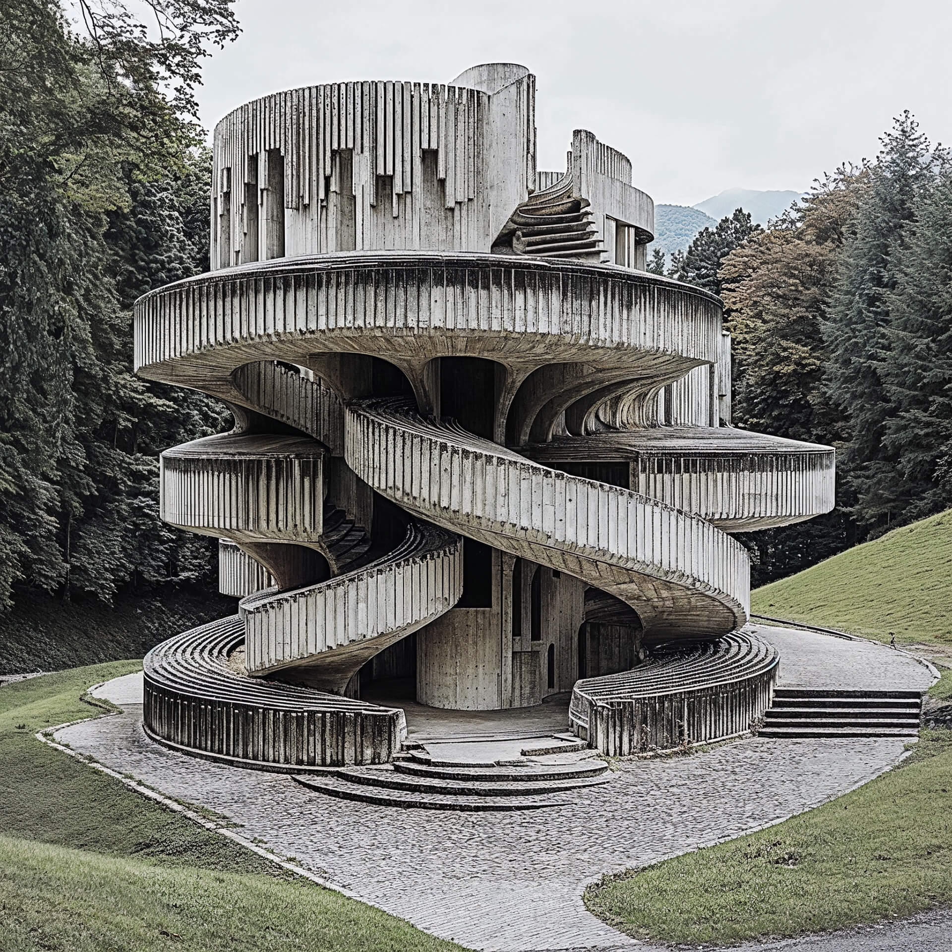 Το σκυρόδεμα, ως δομή και ταυτόχρονα ως “δέρμα”, υπερβαίνει τις άκαμπτες, μονολιθικές συνδηλώσεις του παραδοσιακού μπρουταλισμού, μέσα από ρευστές γεωμετρίες, δυναμικές σπείρες και βαθιά λαξευμένες όψεις. Η τεκτονική γλώσσα μετασχηματίζεται, από τη στατική μάζα σε έναν πιο εκφραστικό και ζωντανό ρόλο, όπου η αλληλεπίδραση φωτός, σκιάς και καμπυλότητας ζωντανεύει τη βαριά υλικότητα του σκυροδέματος.