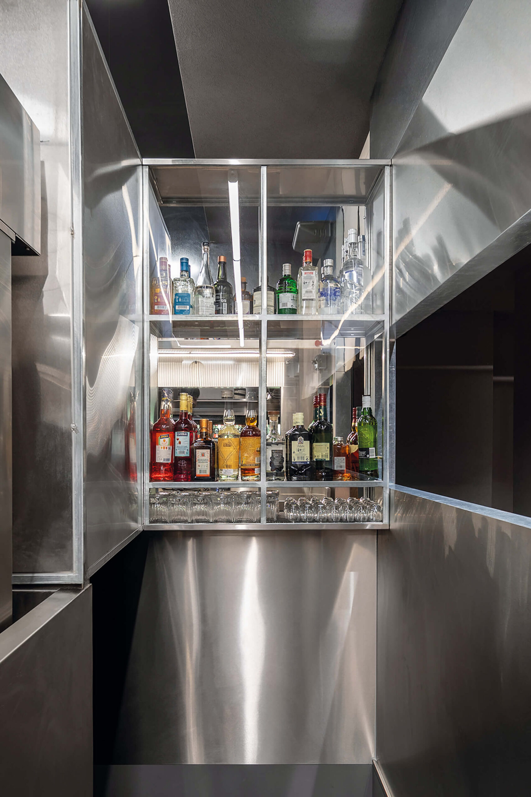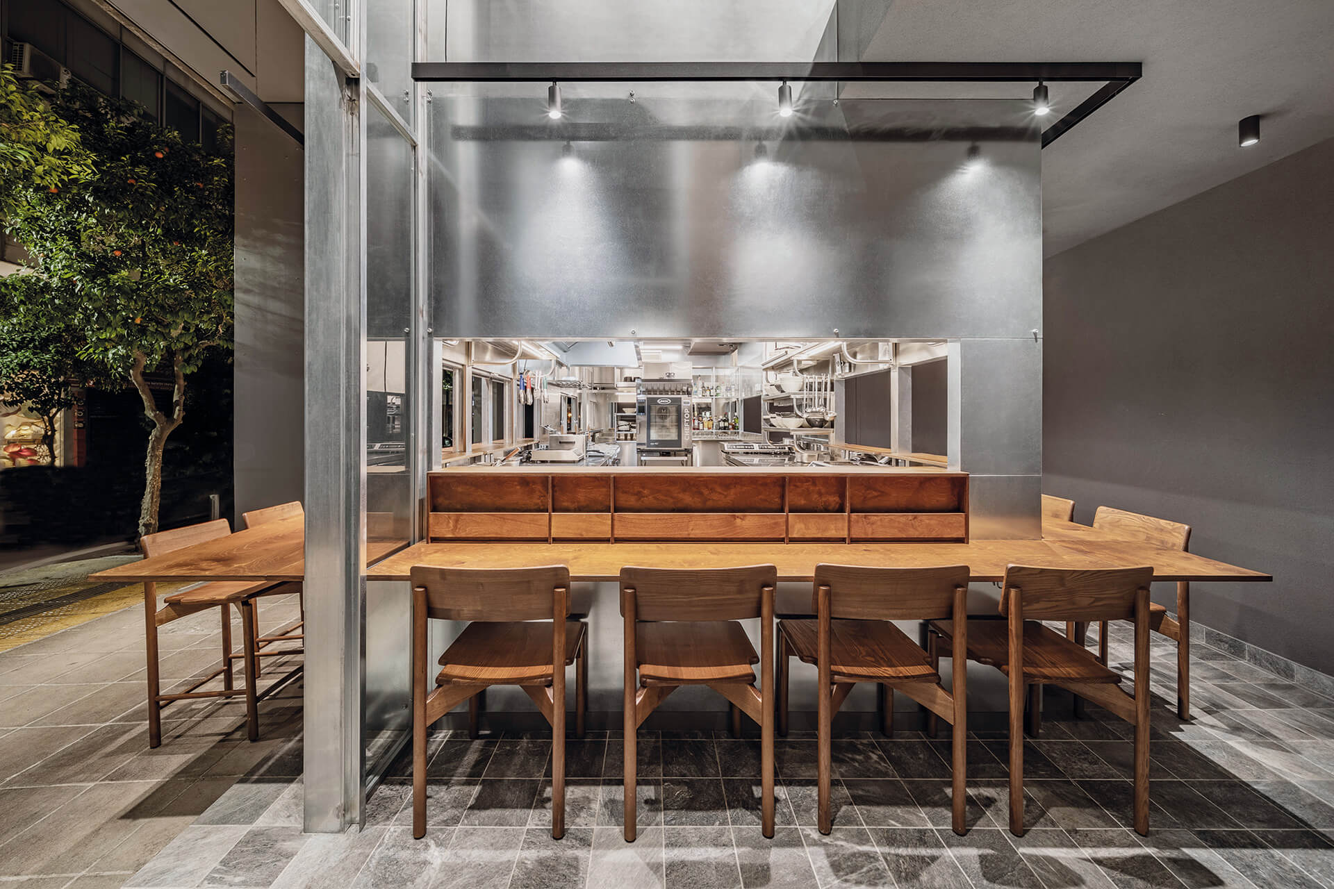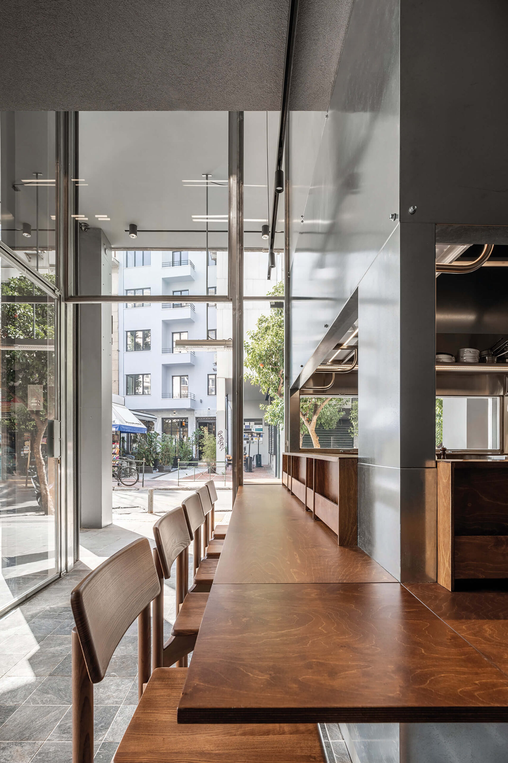 Σχεδιαστική πρόθεση ήταν να θολώσουν τα όρια δημόσιου και ιδιωτικού, φέρνοντας τη δράση της μαγειρικής σε συνεχή αλληλεπίδραση με τους περαστικούς. Χωρικά, αυτό μεταφράστηκε με την τοποθέτηση του χώρου παρασκευής φαγητού στην όψη, στον πυρήνα της ροής του κόσμου από και προς το εσωτερικό. Η περιμετρικά ανοιχτή κουζίνα εντάσσεται σε ένα μεταλλικό στερεό το οποίο αναπτύσσεται σε διπλό ύψος, ενώ ενσωματώνεται στη δομή χωρίς στήριξη από τα υπάρχοντα δομικά στοιχεία, προσφέροντας ακόμα και τη δυνατότητα μεταφοράς του.