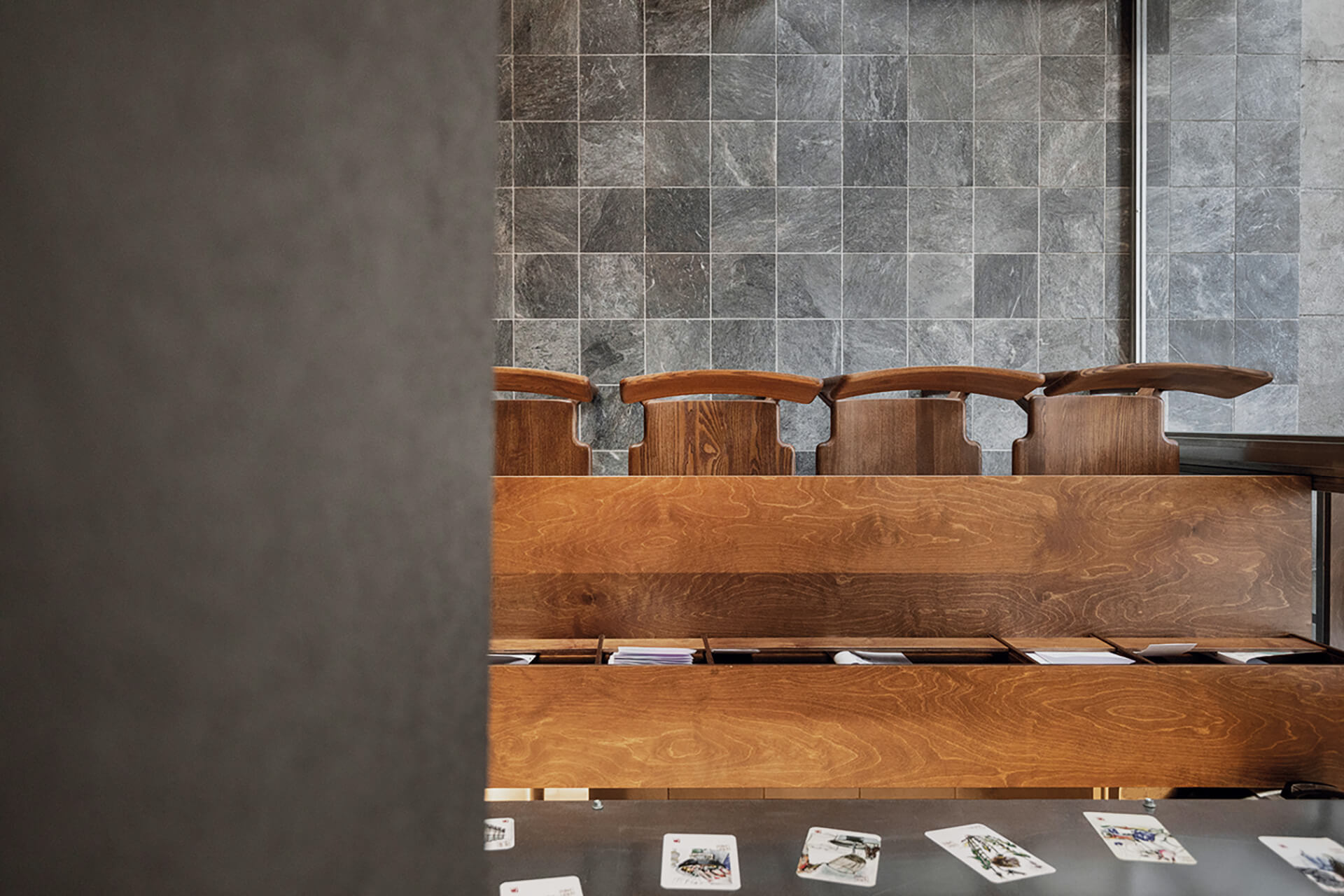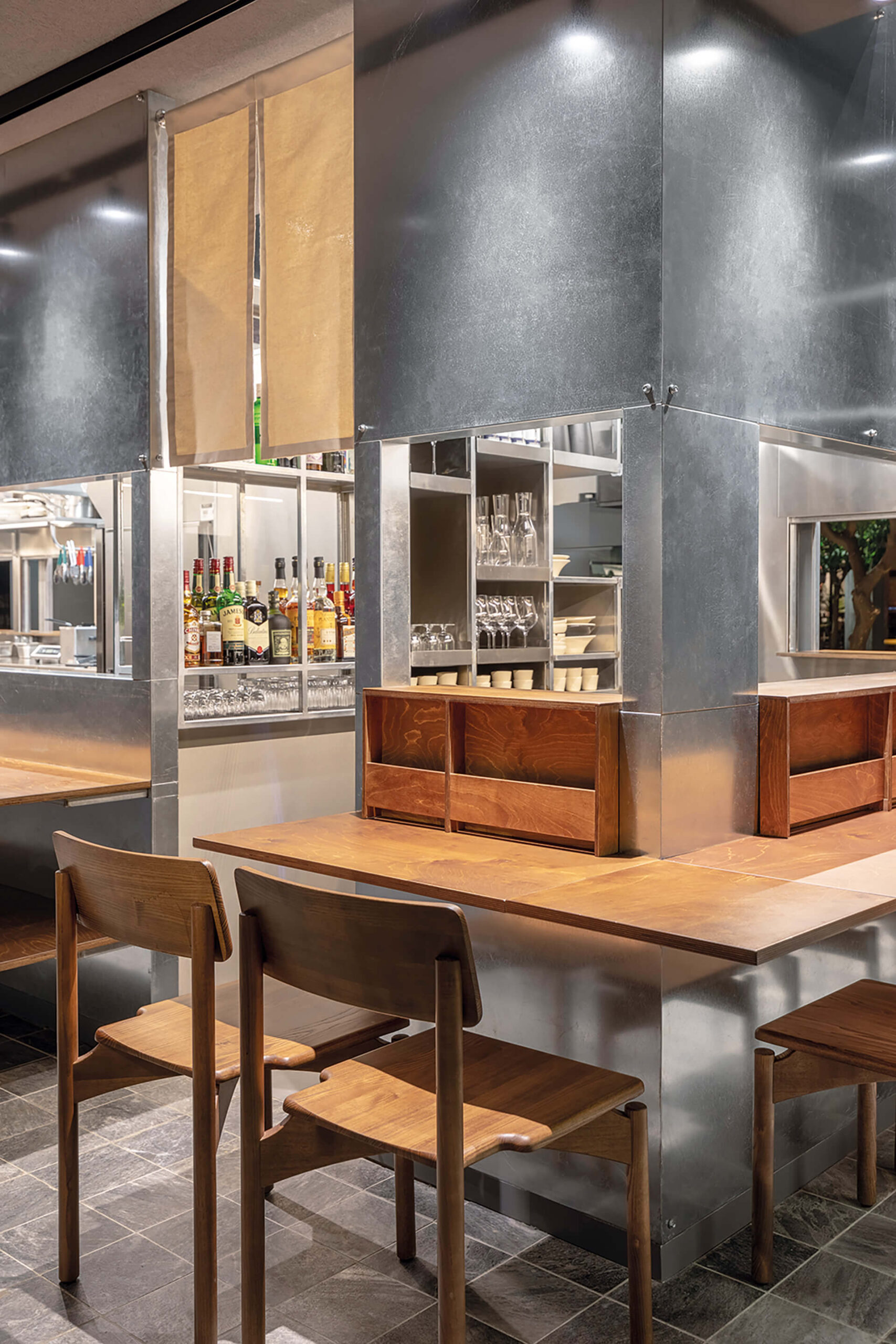 Τον σχεδιασμό συμπληρώνουν ξύλινοι πάγκοι που φέρουν μνήμες από παραδοσιακές καντίνες, κάνοντας την ατμόσφαιρα πιο οικεία, διευκολύνοντας παράλληλα τη λειτουργικότητα και τη ροή της κίνησης. Η ιδιαίτερη έμφαση στην αρμονική σύμπραξη υλικών και δομών στοχεύει στο να εμπλουτίσει το εκάστοτε concept, αναδεικνύοντας την αυθεντικότητα του brand.