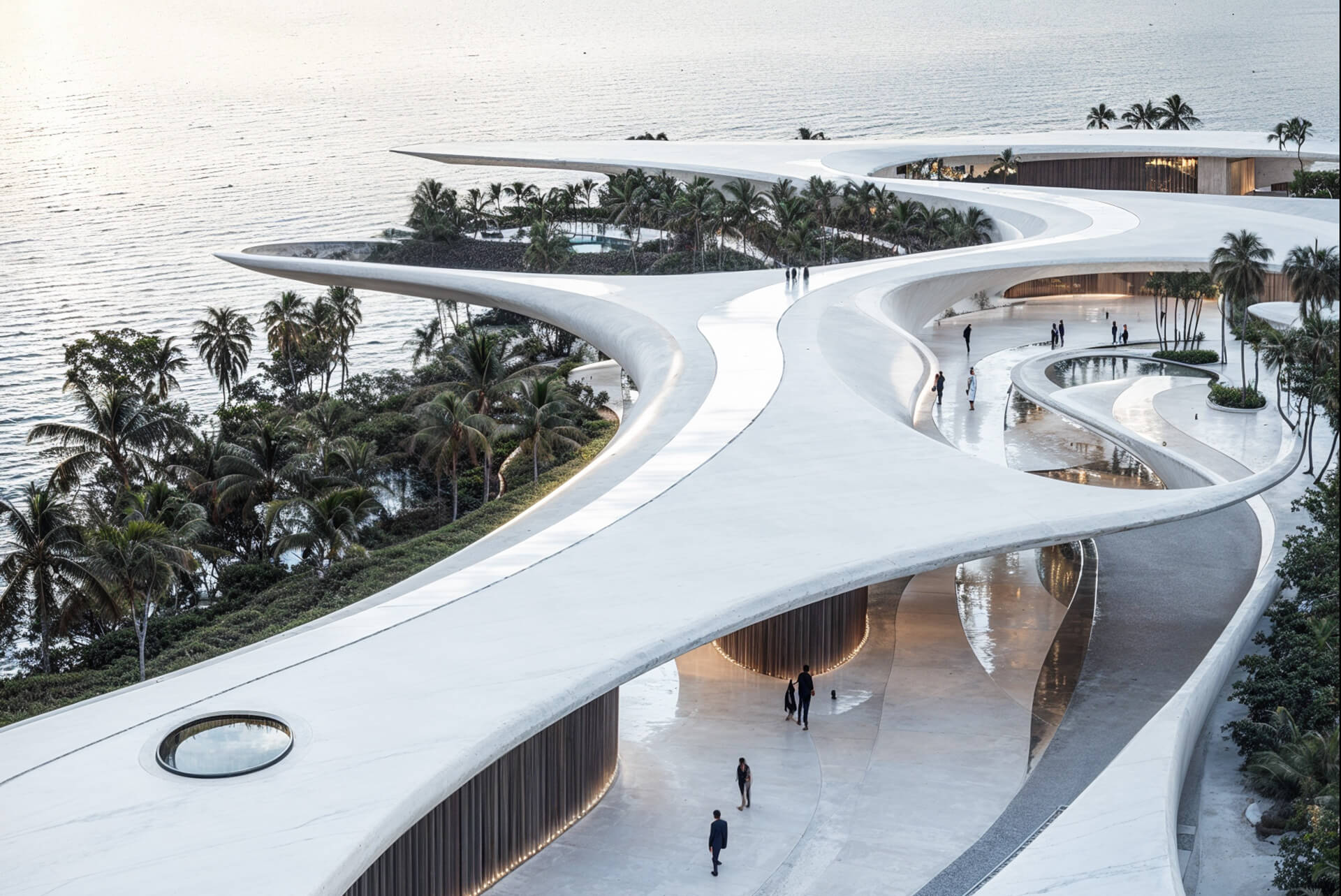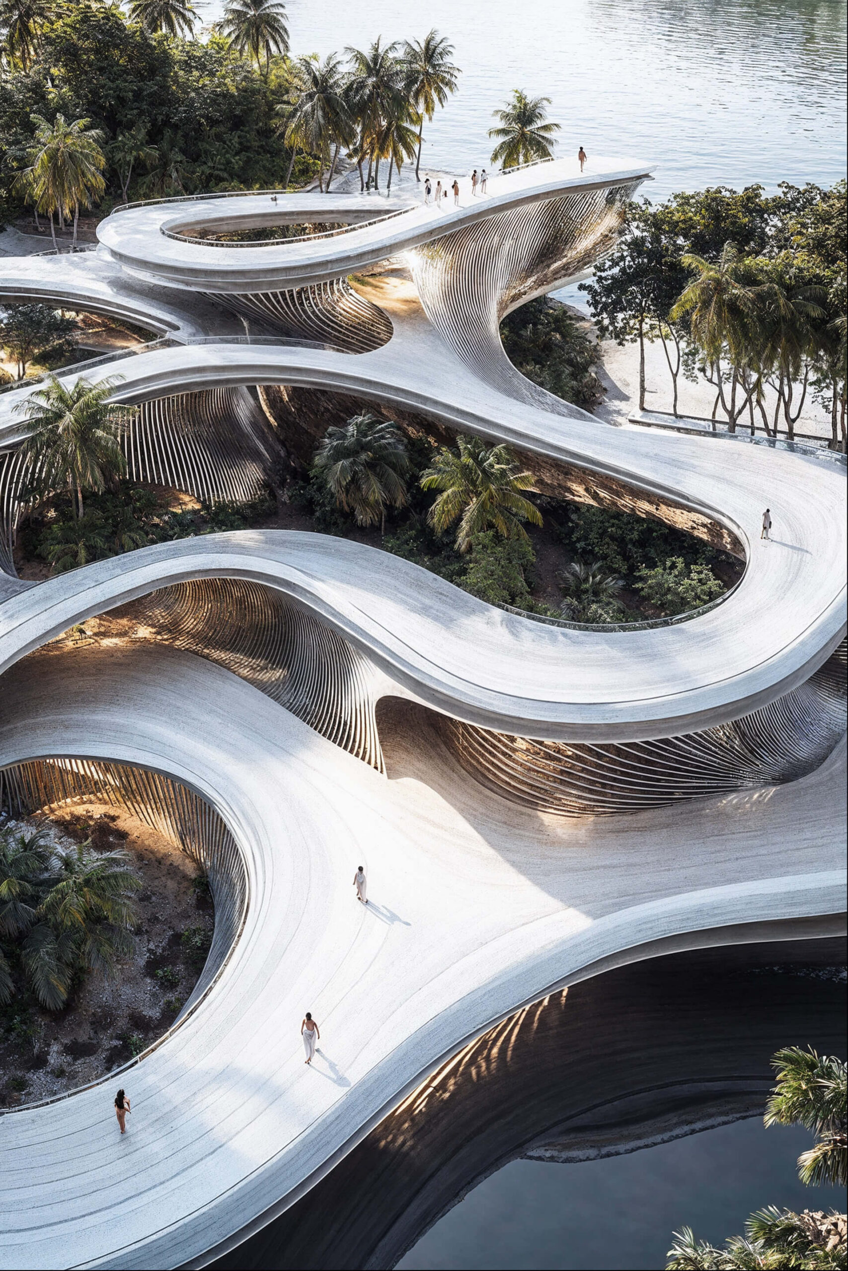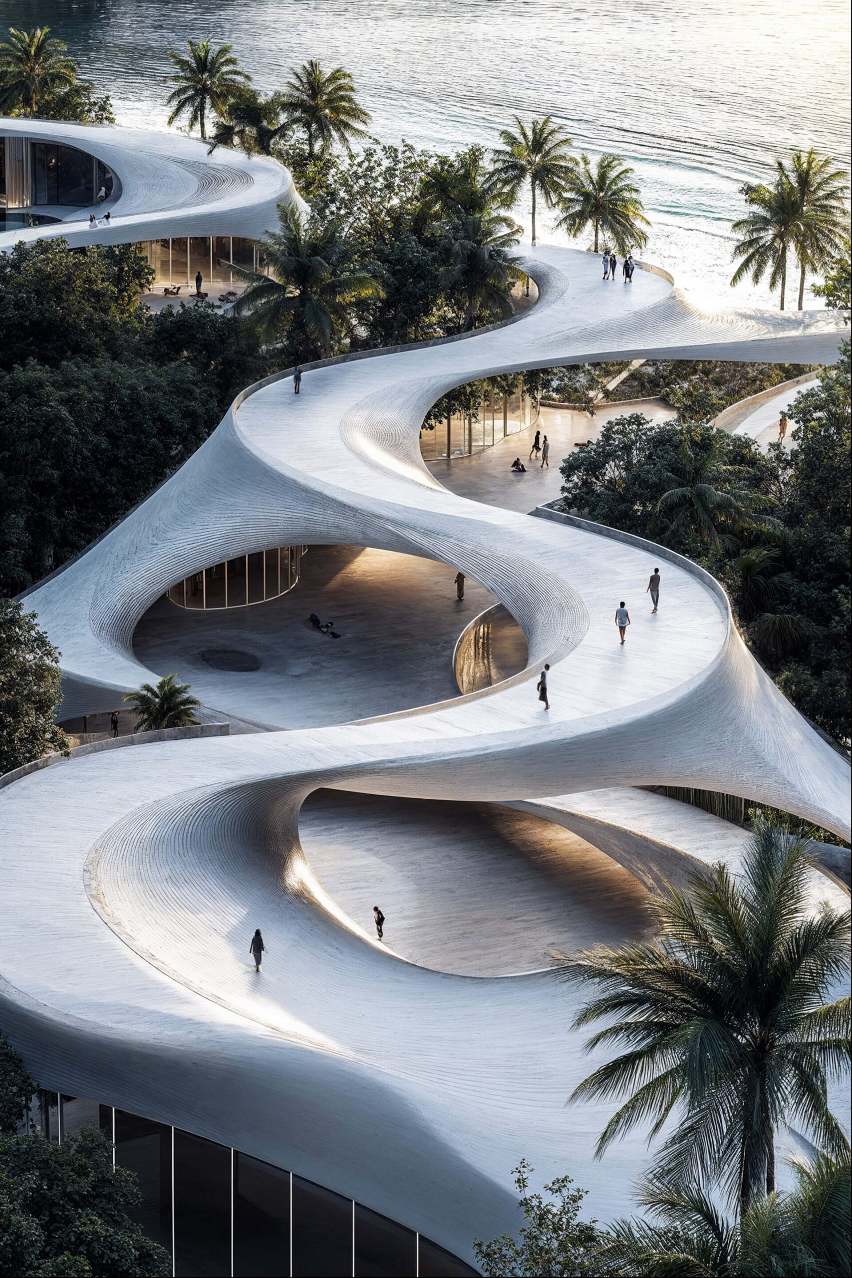 Κινηματογραφική εναέρια λήψη από ένα παραδεισένιο, μικρό, πολυτελές boutique ξενοδοχείο στην Ταϊλάνδη, σε στυλ fluid design, με πολλούς φοίνικες και οργανωμένο γύρω από πολλαπλές παραμετρικές, συμμετρικές αυλές με πισίνες και πολυτελείς, επιμελώς διαμορφωμένους, τροπικούς κήπους ή κλειστά θερμοκήπια. Fluiddesign, οργανικά σχήματα σαν κελύφη· παραμετρικός, αλγοριθμικός σχεδιασμός· ωκεανός, σύννεφα, κινηματογραφικός φωτισμός, ηλιαχτίδες, άνθρωποι που περπατούν, βραβευμένη αρχιτεκτονική, πολυτελής απλότητα, διακριτική κομψότητα, καθαρές φόρμες, σκοτεινό λευκό, ήσυρη πολυτέλεια, χρήση πολύτιμων υλικών, λευκό μάρμαρο calacatta.