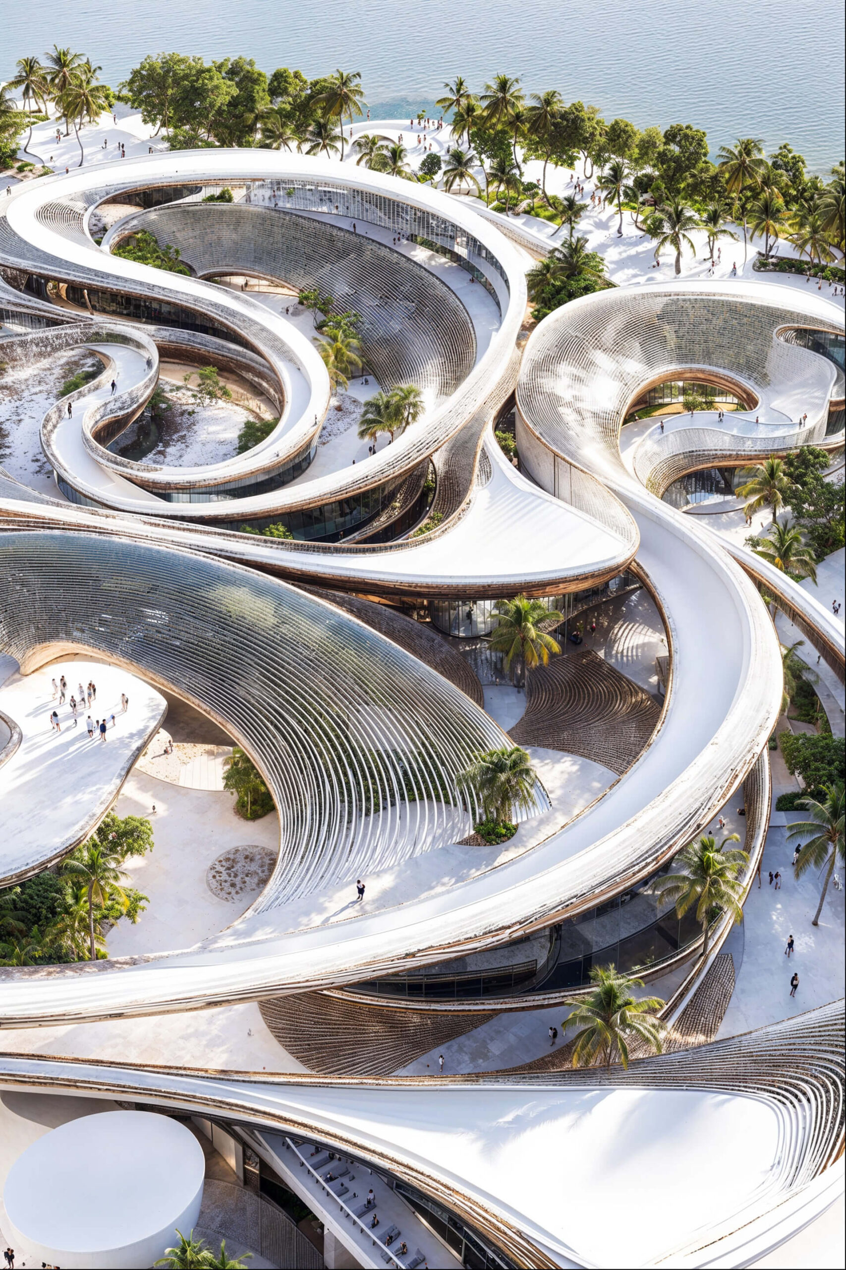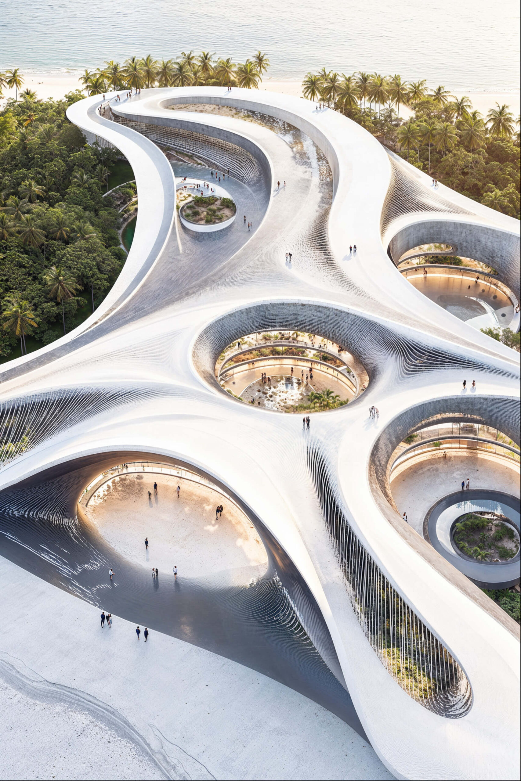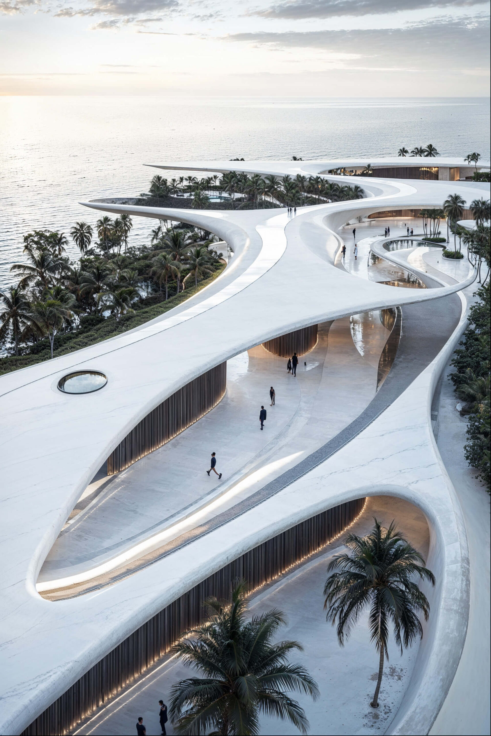 Κινηματογραφική εναέρια λήψη από ένα παραδεισένιο, μικρό, πολυτελές boutique ξενοδοχείο στην Ταϊλάνδη, σε στυλ fluid design, με πολλούς φοίνικες και οργανωμένο γύρω από πολλαπλές παραμετρικές, συμμετρικές αυλές με πισίνες και πολυτελείς, επιμελώς διαμορφωμένους, τροπικούς κήπους ή κλειστά θερμοκήπια. Fluiddesign, οργανικά σχήματα σαν κελύφη· παραμετρικός, αλγοριθμικός σχεδιασμός· ωκεανός, σύννεφα, κινηματογραφικός φωτισμός, ηλιαχτίδες, άνθρωποι που περπατούν, βραβευμένη αρχιτεκτονική, πολυτελής απλότητα, διακριτική κομψότητα, καθαρές φόρμες, σκοτεινό λευκό, ήσυρη πολυτέλεια, χρήση πολύτιμων υλικών, λευκό μάρμαρο calacatta.