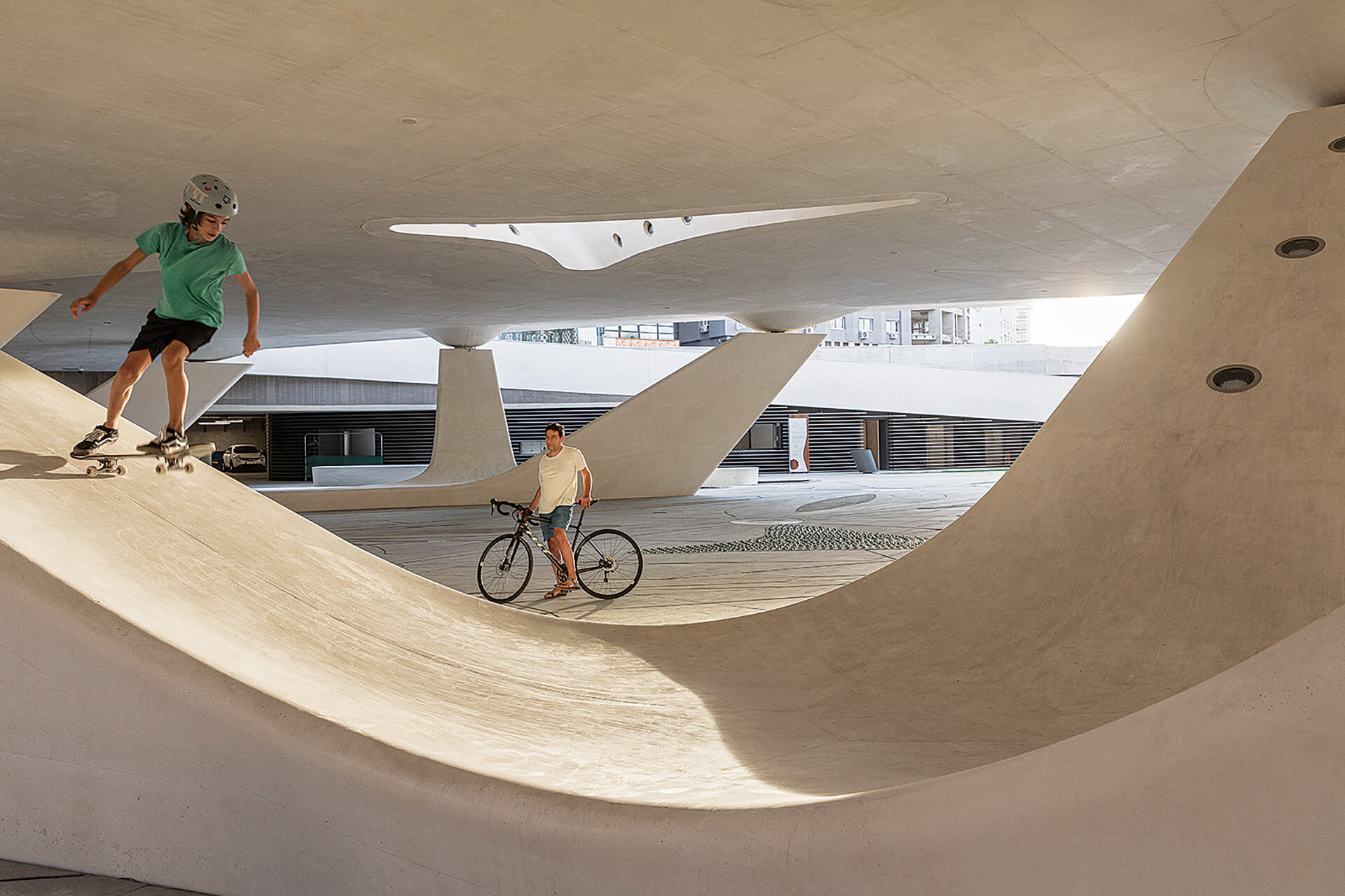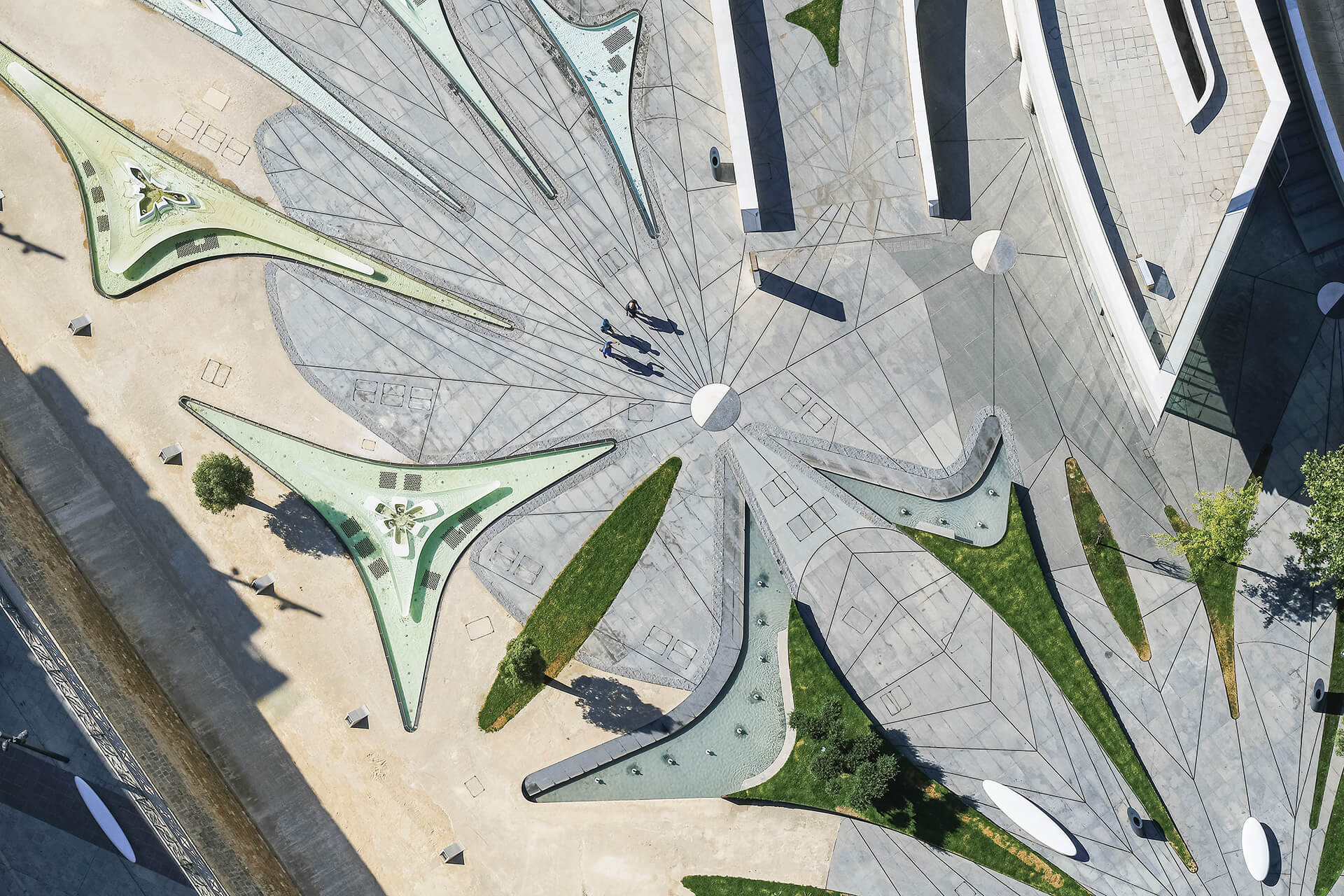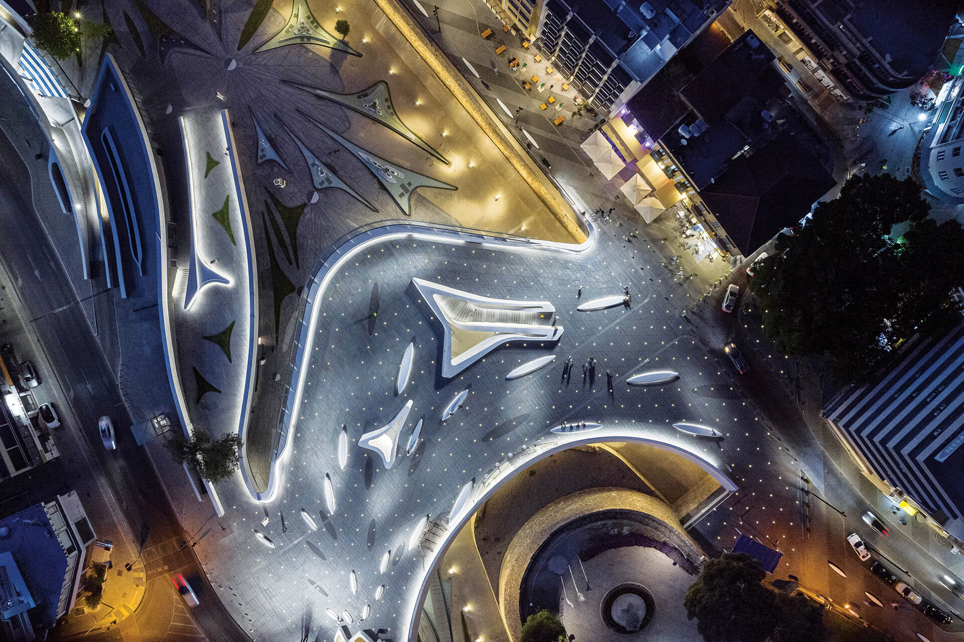 Finally, the lighting design reinforces the square’s fluid geometry and acts as a spatial guidance system during the evening hours. Linear lighting elements are discreetly integrated along the contours of the curved surfaces and bridges, emphasizing the dynamic morphology of the composition and enhancing the legibility of the structure within the urban landscape. At the same time, low-intensity lighting fixtures embedded within the paving create a subtle “field of light” that follows the geometry of the circulation paths and areas of pause. This approach highlights the plasticity of the concrete surfaces, enhances the sense of safety, and transforms the public space into a nocturnal landscape where light operates both functionally and atmospherically.