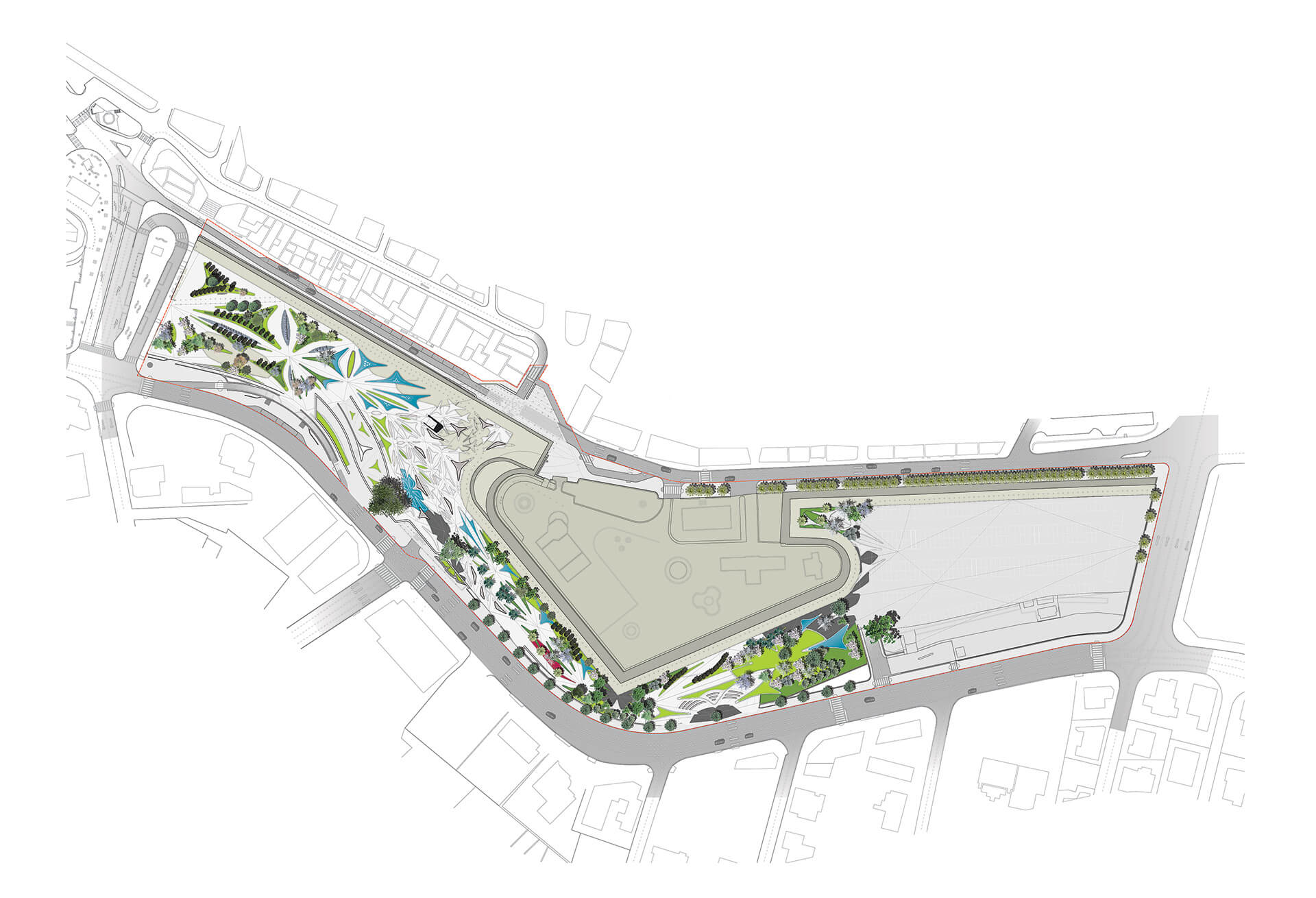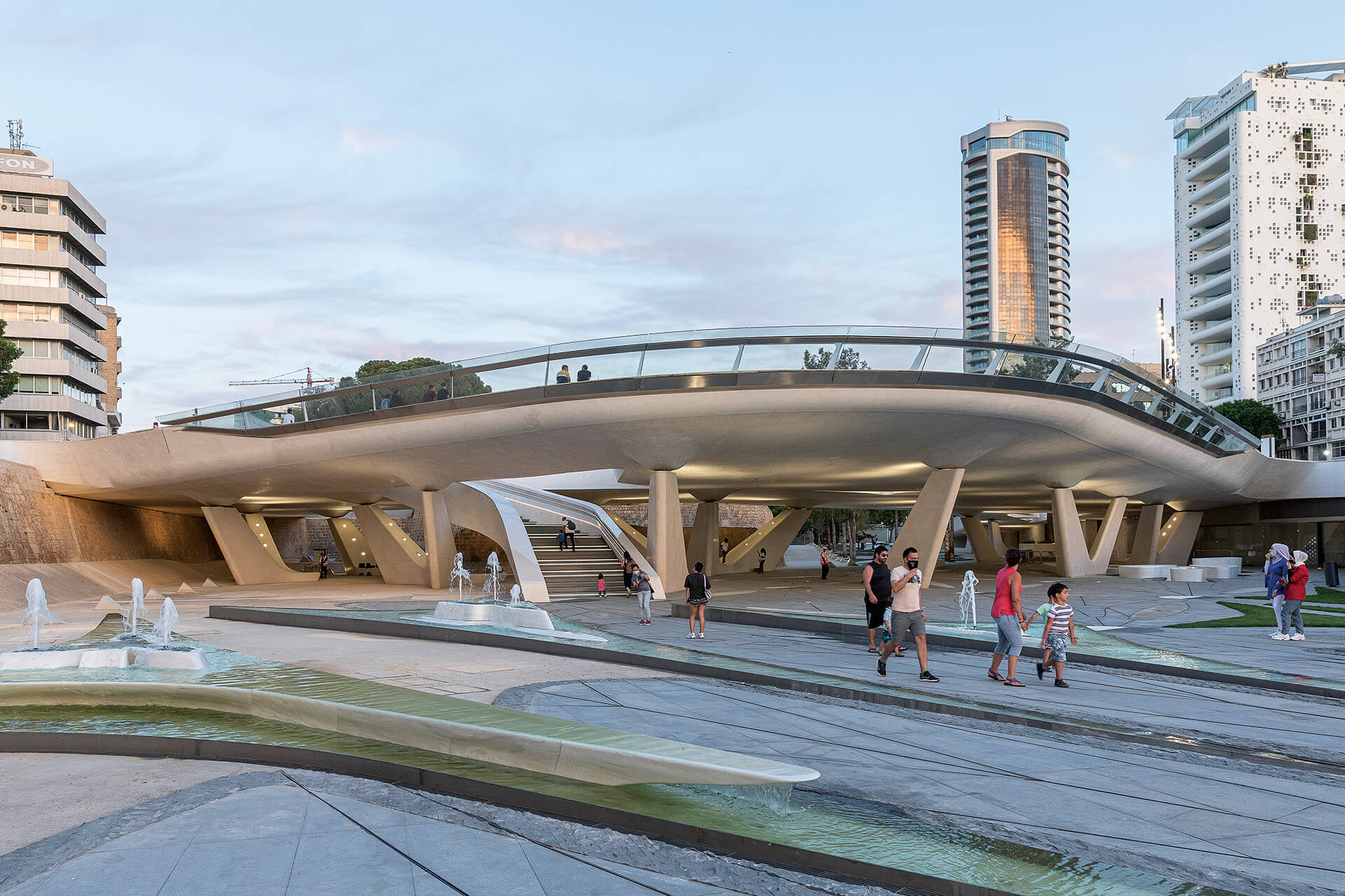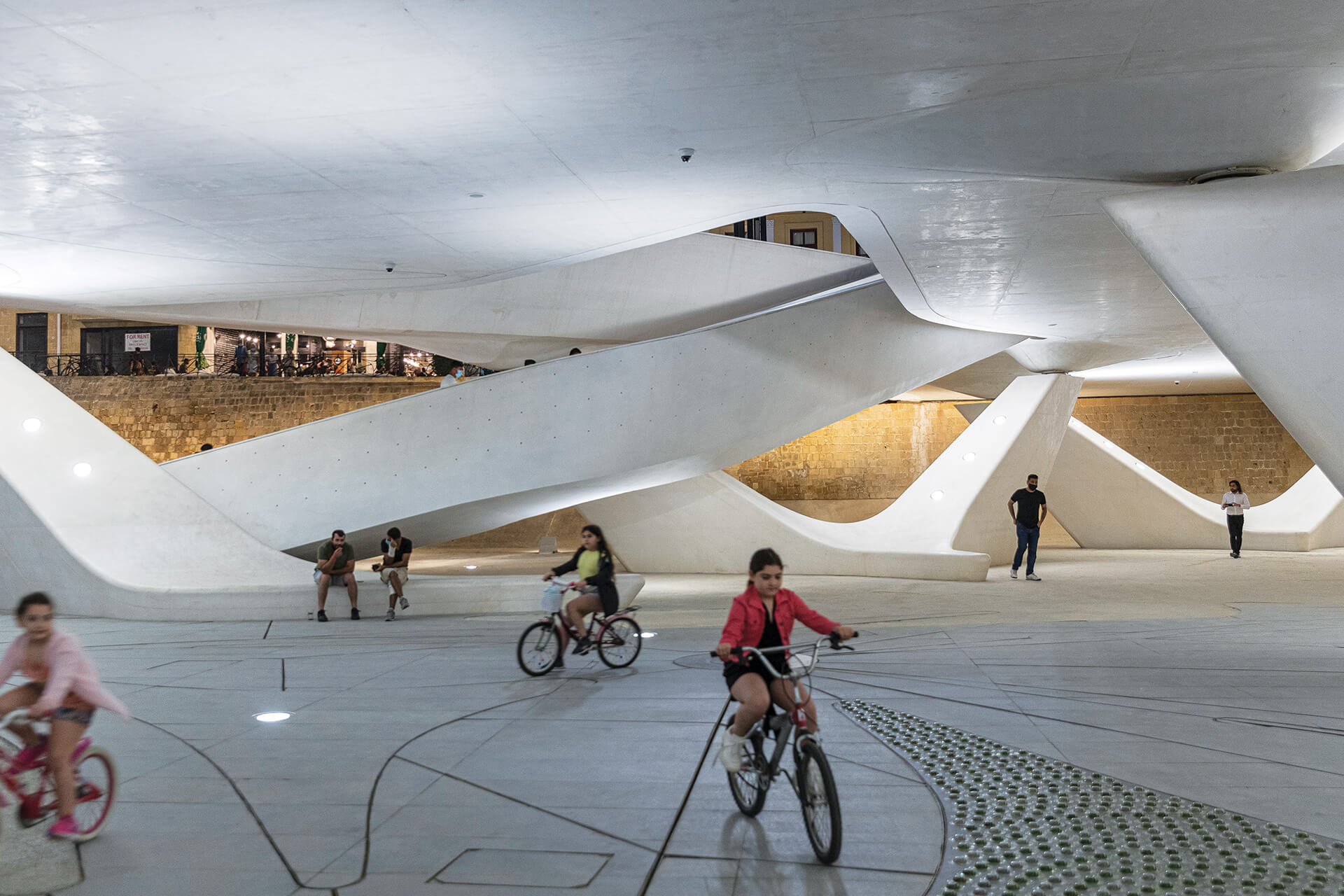 Finally, the lighting design reinforces the square’s fluid geometry and acts as a spatial guidance system during the evening hours. Linear lighting elements are discreetly integrated along the contours of the curved surfaces and bridges, emphasizing the dynamic morphology of the composition and enhancing the legibility of the structure within the urban landscape. At the same time, low-intensity lighting fixtures embedded within the paving create a subtle “field of light” that follows the geometry of the circulation paths and areas of pause. This approach highlights the plasticity of the concrete surfaces, enhances the sense of safety, and transforms the public space into a nocturnal landscape where light operates both functionally and atmospherically.