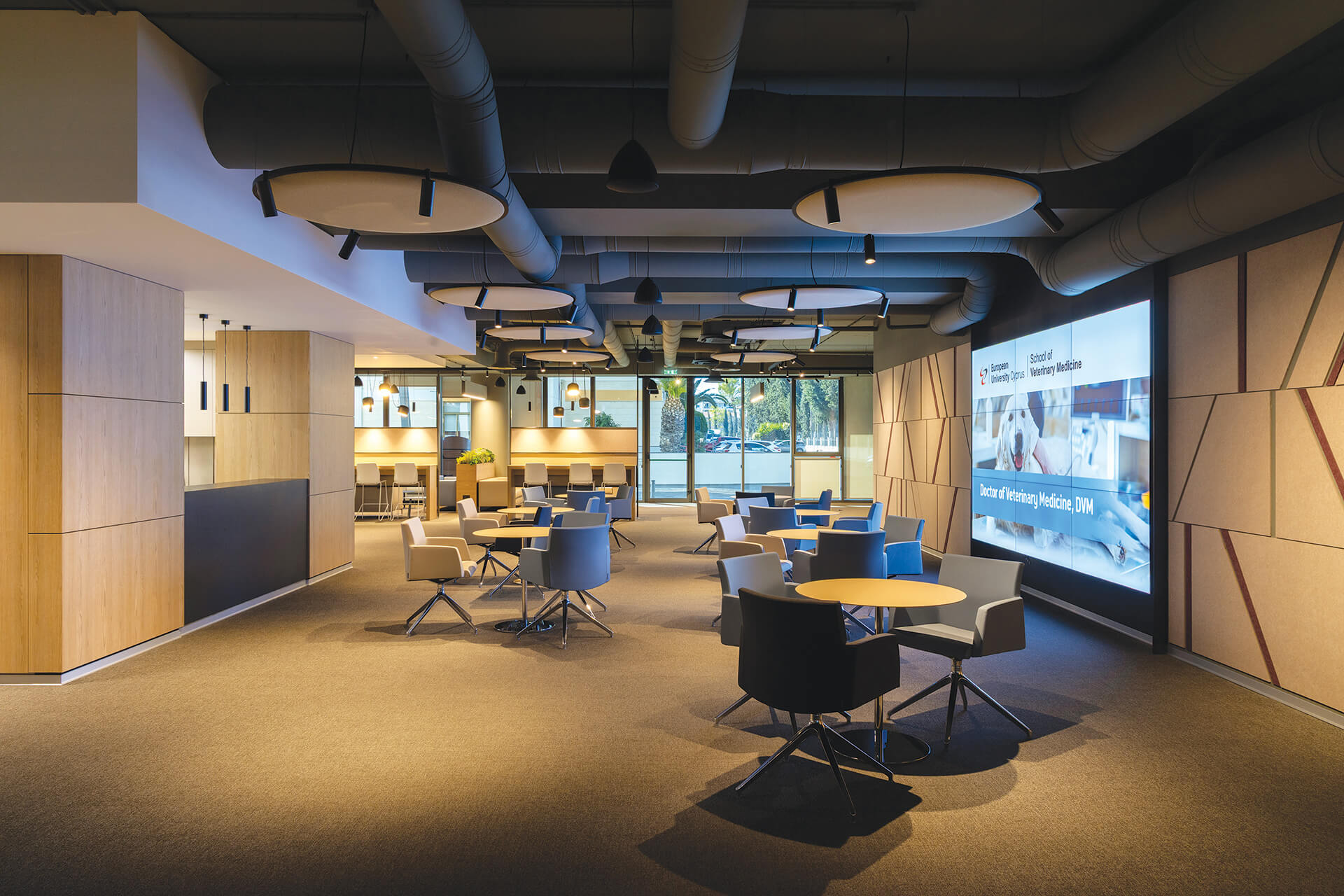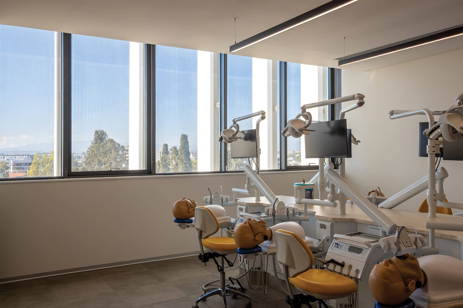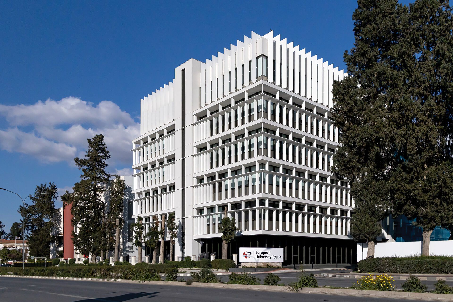 The recently completed addition to the campus of the European University Cyprus houses the Schools of Medicine, Dentistry and Veterinary Medicine. More specifically, the building comprises standard tertiary education classrooms along with their supporting facilities, as well as laboratories of various kinds in conjunction with a series of complementary communal spaces.