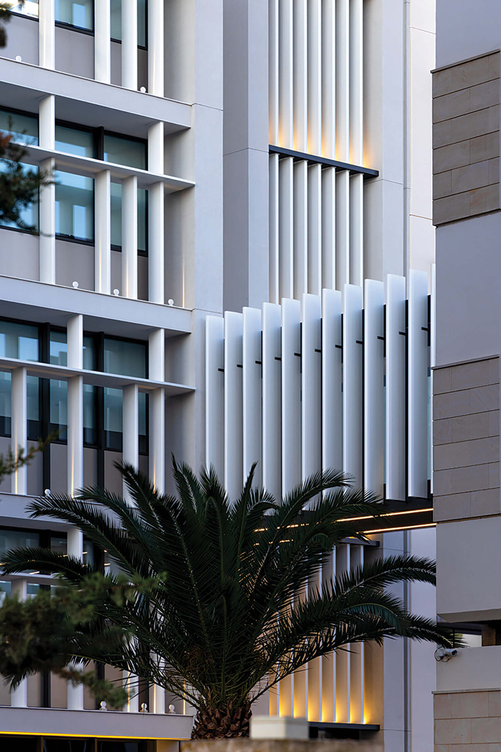 Beyond the aesthetic unification with the existing built complex, a key objective was the functional interconnection of the university buildings, which are developed on either side of a road axis. To ensure safe and comfortable movement between them, an elevated bridge was designed, organically integrated into the university’s internal circulation network. The architectural design was completed with a lighting study that discreetly highlights the lines and individual features of the facades. The exterior lighting lends depth and continuity to the complex’s presence, maintaining its identity and visibility even beyond operating hours.