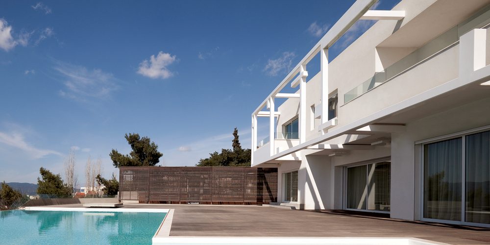 Frame House is a residence built on a hill in Athens’ northern suburbs. The sharp slope of the area to the southwest reveals a breathtaking view of Athens, while the municipal road runs along the northeast side. The duality of the plot constituted the starting point of the design for redeveloping the original building. The old building was simplified into a rectangular white volume to allow the view to play the leading role it deserves. The façade to the street has small openings to maintain privacy; while the white volume ‘opens’ to let the view in the house. On the north side of the residence is a perforated box of wooden blinds that is used for shading, and also serves as a windbreak. The side of the box near the pool is opened with the help of a series of hydraulic pistons. Movable panels can obscure even the lowest south-western light. The introverted character of the residence is underlined with the wall of exposed concrete that wraps around the building. The shape of the wall is adjusted to set the house’s entrance and parking area, and ends up defining the pool’s overflow. The architectural elements of the Frame house’s format convey the dual intentions of privacy and welcoming the view.