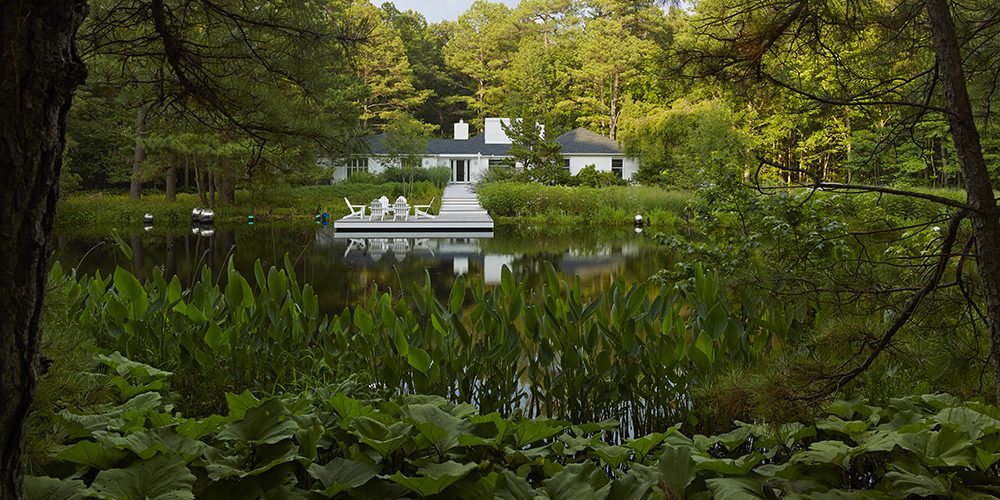 The project scope included a complete interior renovation, including amongst others, some new external living spaces. The original colonial house was closed, dark, with an interior subdivided into many small rooms. The client wanted a weekend house where the family could spend time together, and connect with nature. The transformative solution was to provide a retreat of openness and light through a small number of powerful and precise interventions. The exterior brick was painted white to refresh the building and better correspond to the contemporary design of the interior renovation. Α number of spaces were added to the landscape: a second dining room sits within the garden, defined by the surrounding greenery, deck, and pergola; a sitting room is located within the pond, connected to the house by a boardwalk; and lower portion of the deck serves as a private area away from the common space. Shinberg.Levinas designed a contemporary wood table and a metal bench for this outdoor environment. A number of original interior walls and ceilings were removed, in order to create a spacious, light-filled central core that is nearly seamlessly connected with the exterior landscape, establishing a dialogue between indoors and outdoors. Throughout the house, emphasis is placed on the outside, with visual and physical connections to the surrounding garden landscape and the forest beyond. The custom fabricated kitchen includes a 19-ft island, a window and view to the main house entrance and the boardwalk with pond. An innovative design strategy forms the shower of light encapsulated in white glass in the center of the kitchen island. This design element defines the central core area and provides an optimal amount of natural light, presenting a soothing, healthy ambiance.