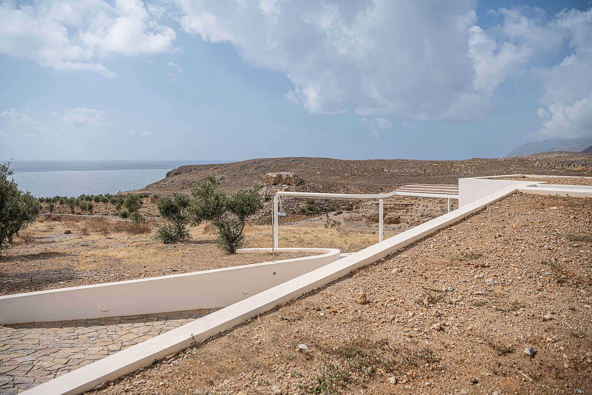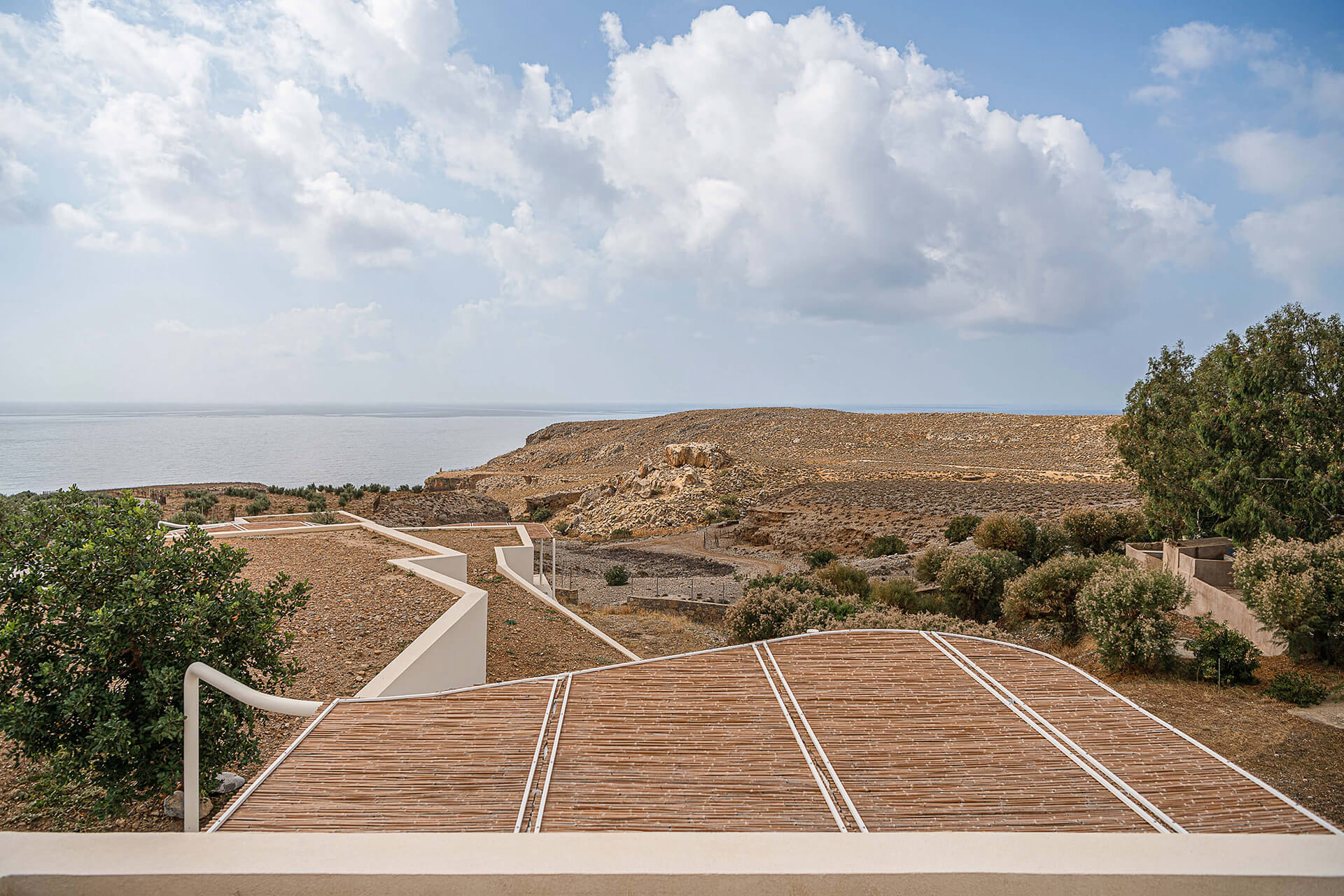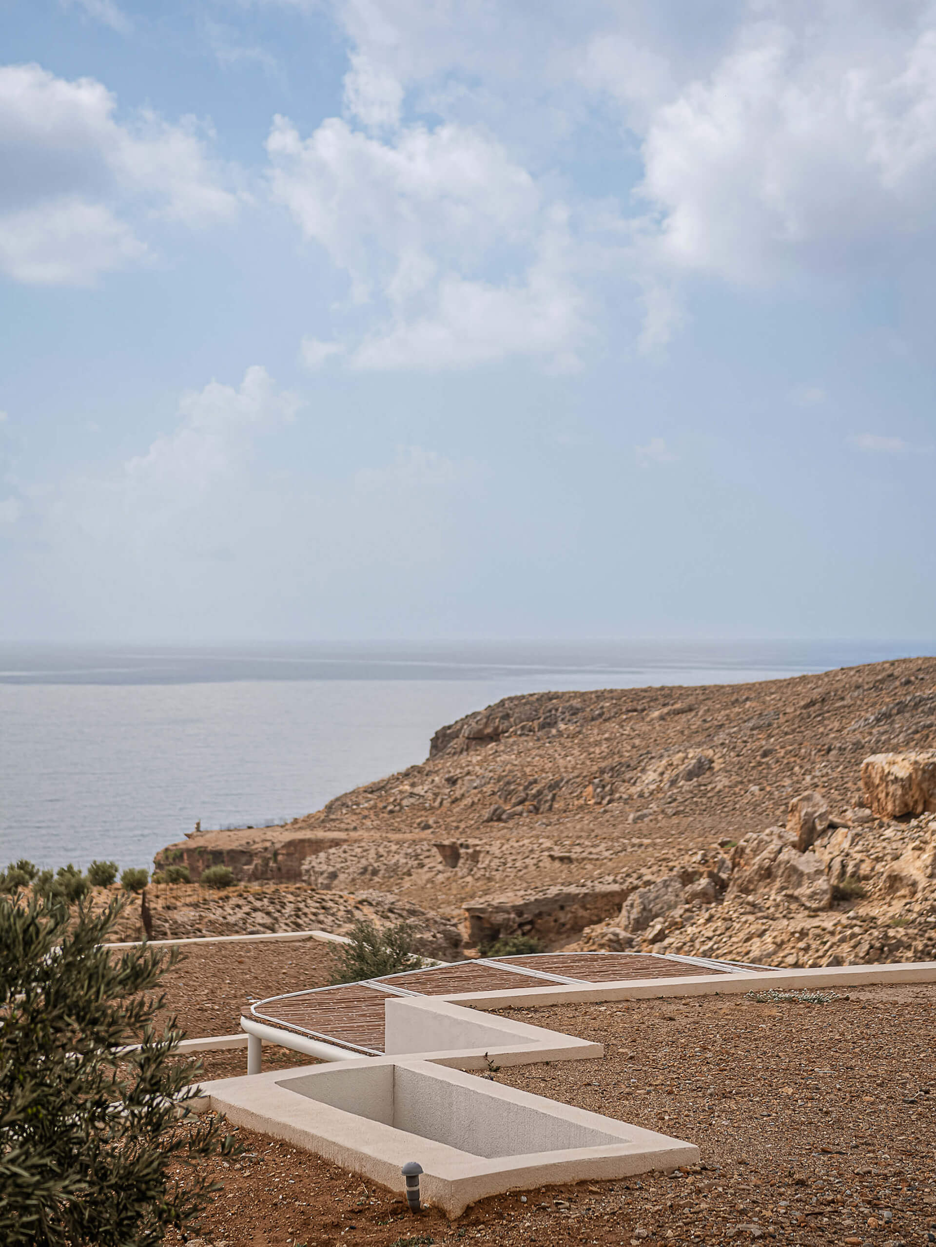 The site’s location played a pivotal role in shaping the design. With the Libyan Sea stretching out before it and the White Mountains rising behind, the landscape exerts a powerful influence on the visitor. From the mountains, a branching network of gorges and dry riverbeds descends toward the secluded beaches of the south, while human intervention has subtly enriched the native arid vegetation with cultivated olive trees. The project site embodies all three defining elements of the region: unobstructed sea views, dramatic rocky outcrops, and a section of the expansive olive grove.