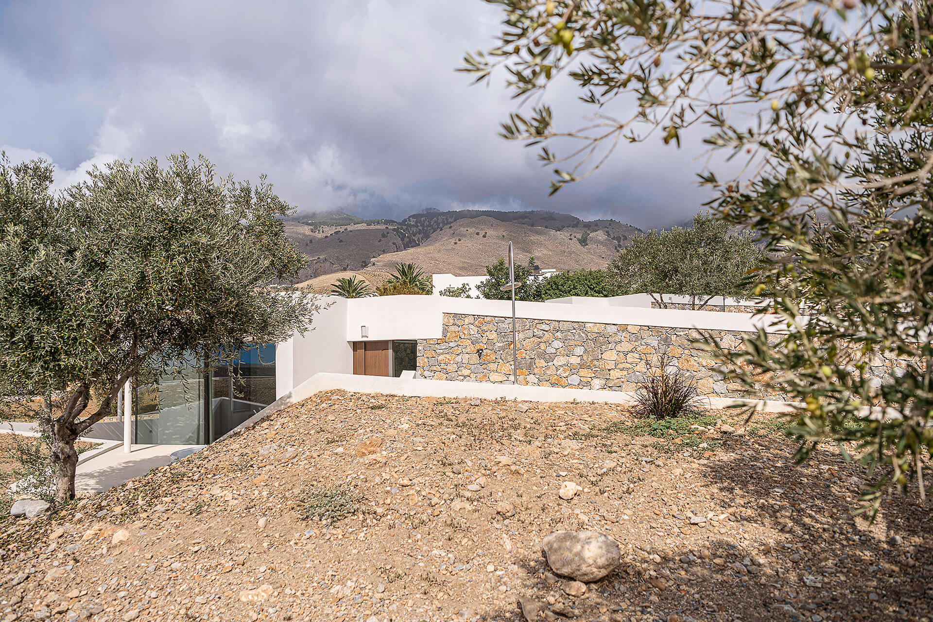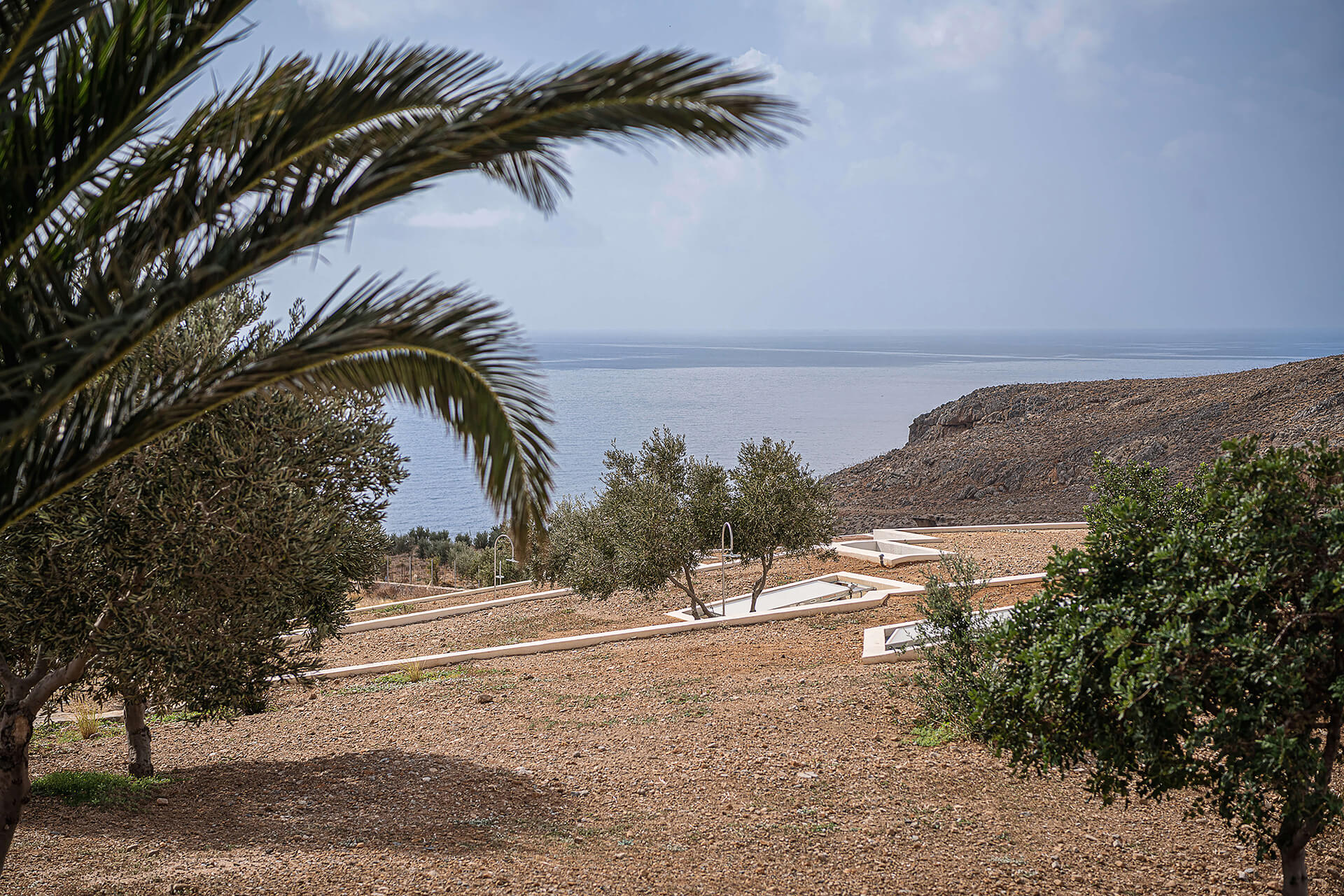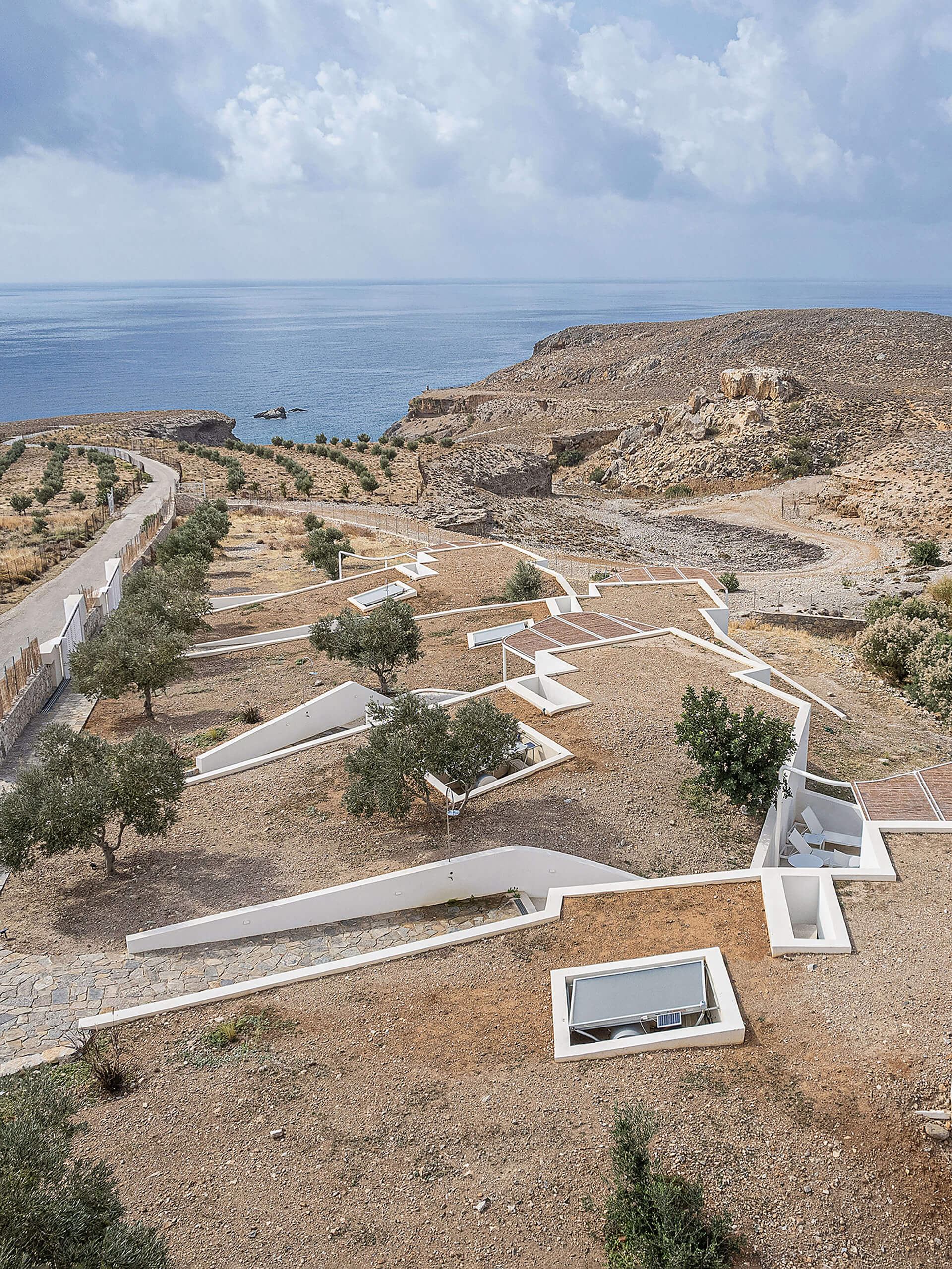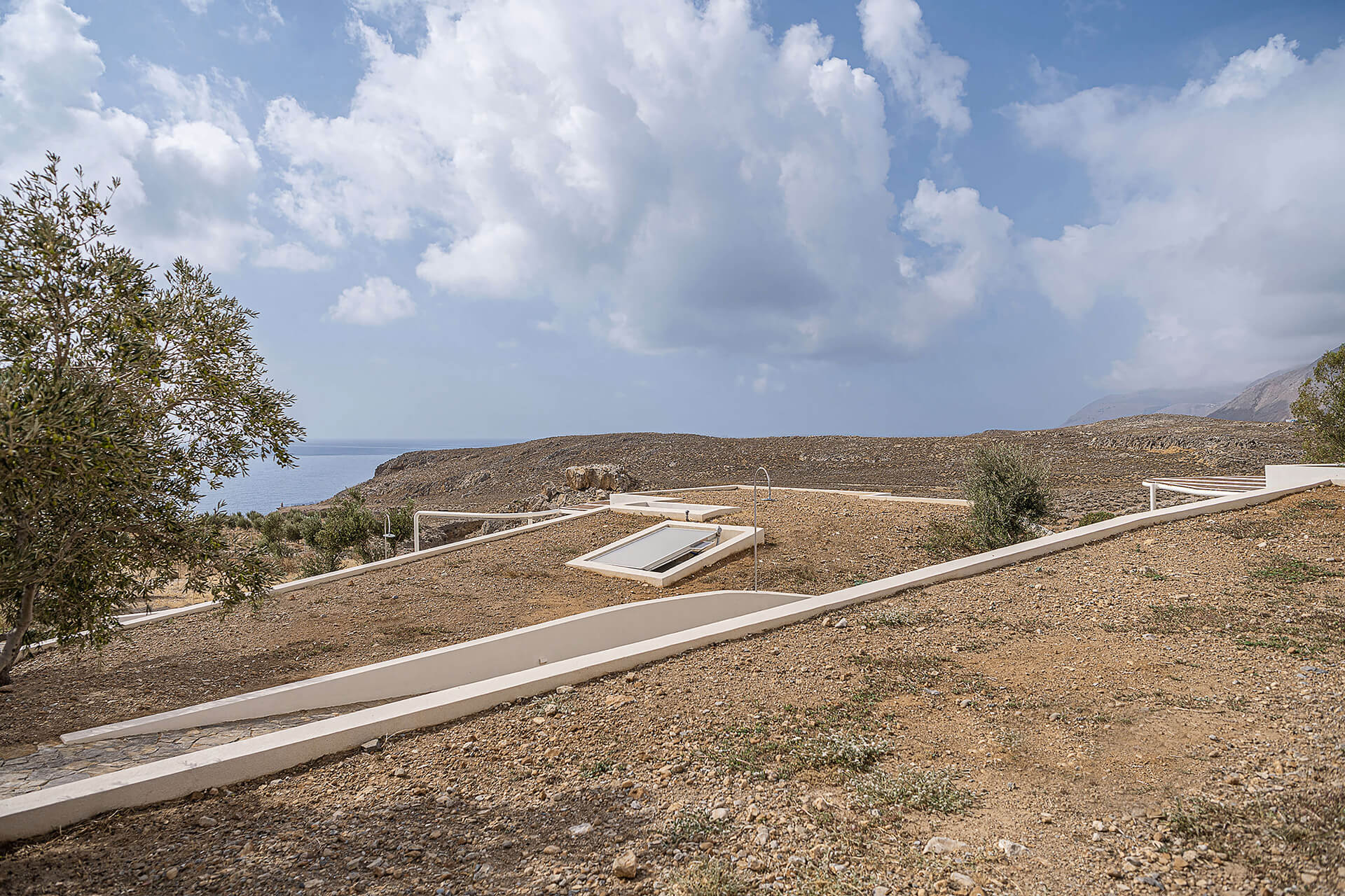 The site’s location played a pivotal role in shaping the design. With the Libyan Sea stretching out before it and the White Mountains rising behind, the landscape exerts a powerful influence on the visitor. From the mountains, a branching network of gorges and dry riverbeds descends toward the secluded beaches of the south, while human intervention has subtly enriched the native arid vegetation with cultivated olive trees. The project site embodies all three defining elements of the region: unobstructed sea views, dramatic rocky outcrops, and a section of the expansive olive grove.
