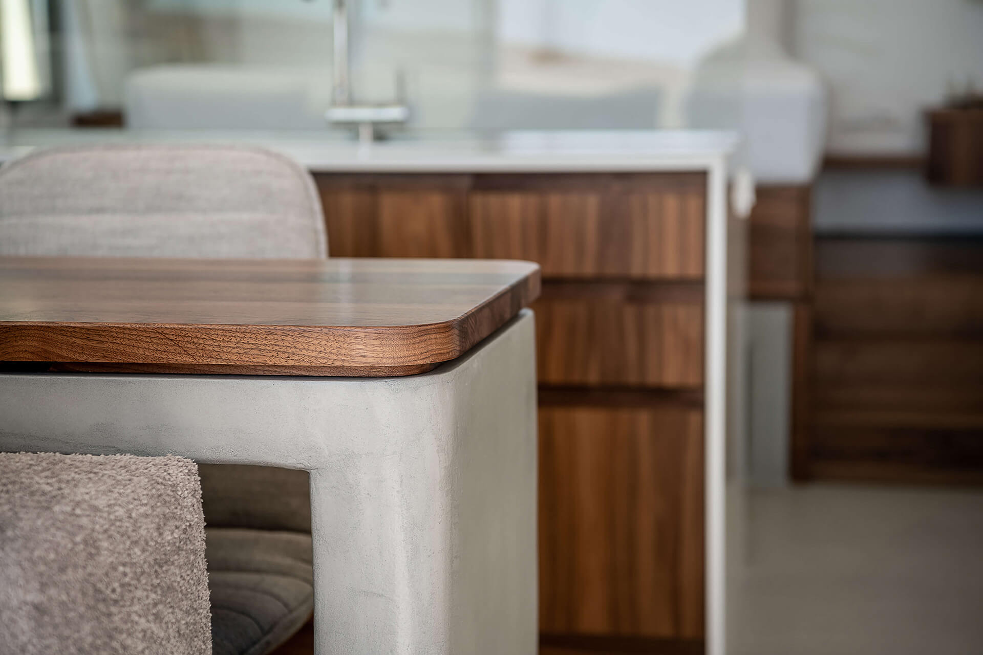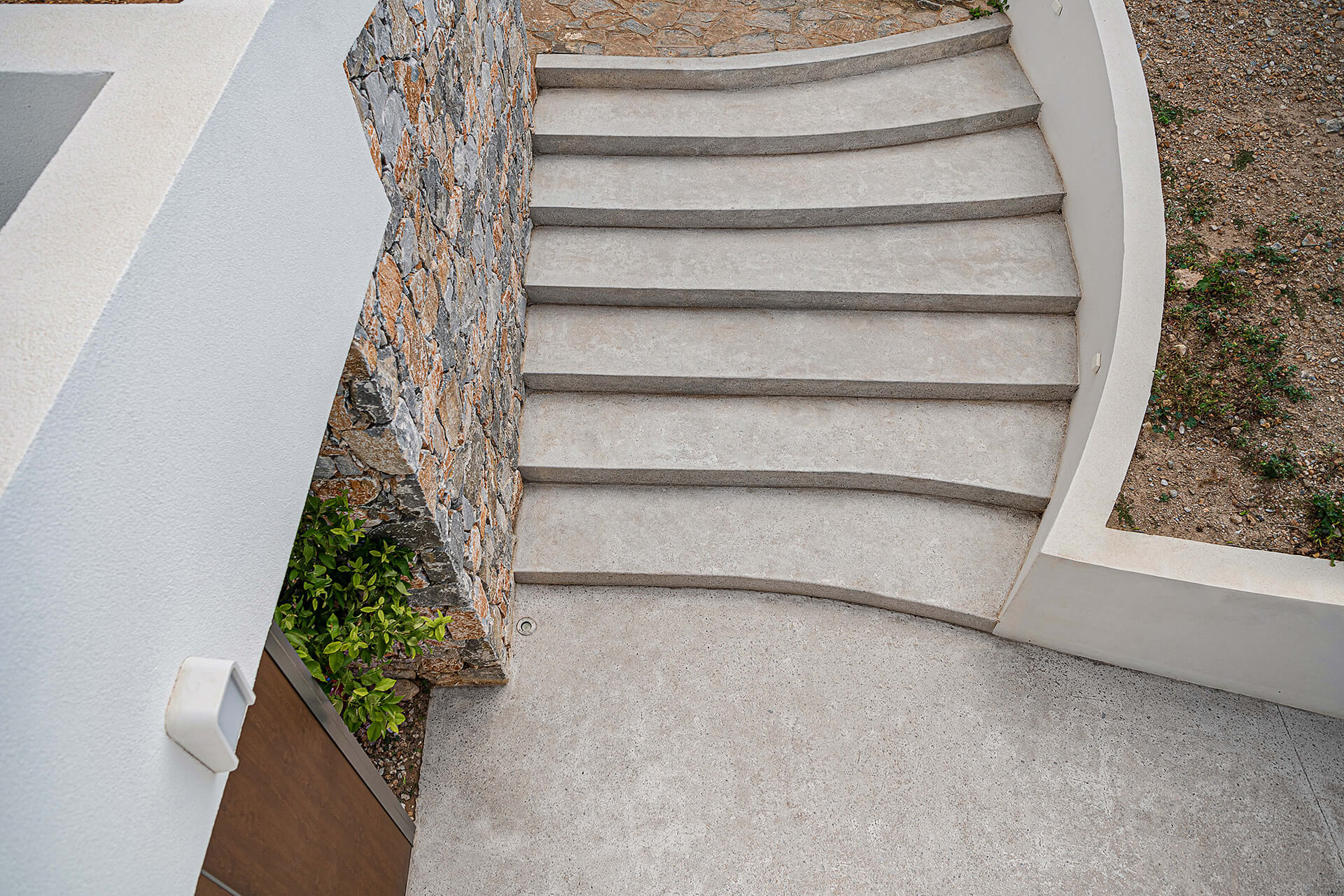 A soft white tone defines the façades and interventions, highlighting the “slopes” of these sculpted valleys in a modern interpretation of traditional local hues. Retaining walls and flooring are built from stone sourced directly from the site, shaping the terrain in the same spirit as the region’s historic dry-stone terraces and footpaths. Cast terrazzo concrete floors further reinforce the sense of continuity with the land. This architectural intervention merges seamlessly with the southern Cretan landscape, offering a tranquil retreat nestled within a wild and elemental setting.
