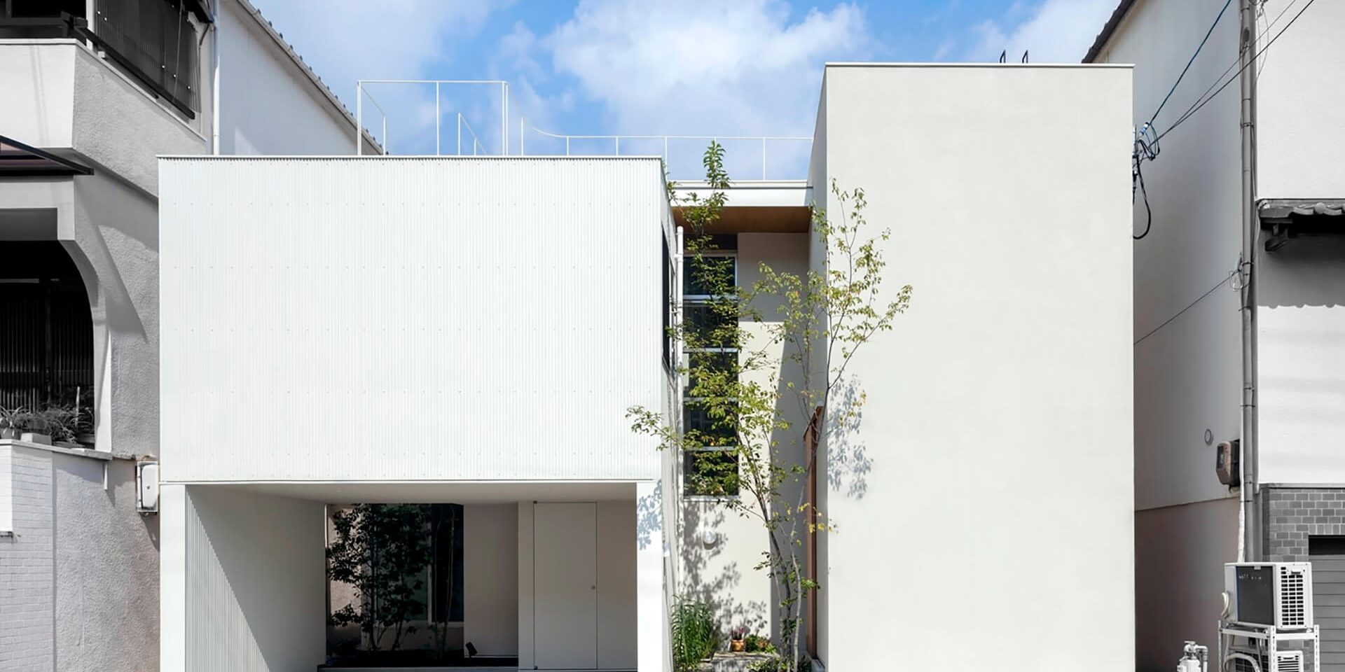 The property is located in a site boxed in by neighbouring houses in Neyagawa, a densely developed residential area of Osaka, Japan.