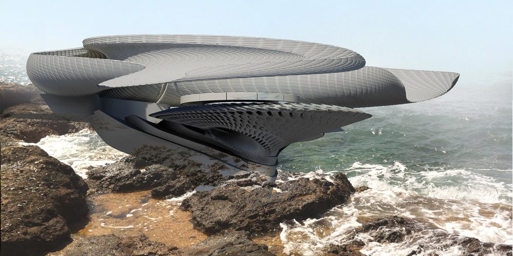 The tidal house has foundations embedded into the sand or rock coastline, harnessing tidal wave power to generate electricity. The structure is made up of two shells- the outer, cast in concrete, anchors the house to the beach whilst the inner shell, of a lightweight non-ferrous aluminium monocoque structure, rises with the tide as it flows around the primary structure. The form creates a series of channels for water to travel though creating a whirlpool effect in order to trap as much tidal energy throughout its structure. The semi circular concrete shell contains solar cells that provide an electrical supply to the living area, the cross section is made from an array of hydraulic tidal turbines; tides as a renewable energy source are more predictable than solar and wind energy, making it simpler to find an appropriate location to harness it. There are two types of extruded turbine, one type uses lightweight aluminium chambers which compress air trapped in the chamber when a wave breaks into them; this kinetic energy creates an electrical current similar to wind turbines. The second electromagnetic type uses neodymium magnets to move through wound copper wire tubes inducing an electrical current as a wave pushes and pulls against the extruded chambers; the electrical energy can be stored in a capacitor. There are three modules to the living area making it easy to dismantle according to the functional requirements of the house.