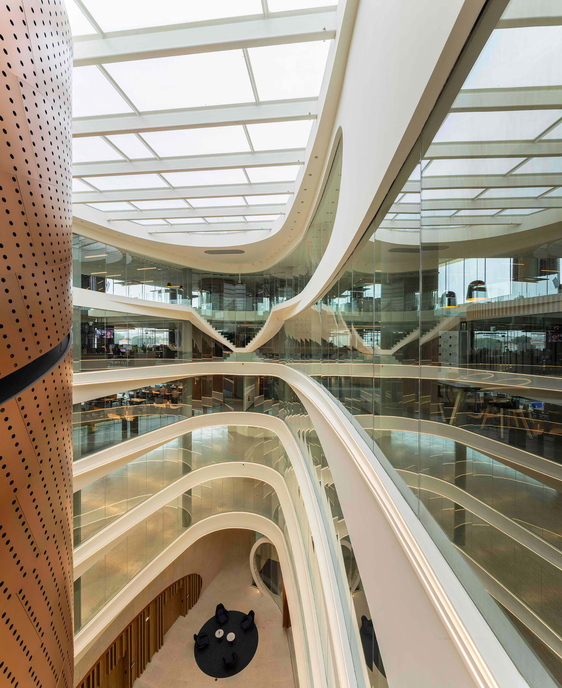 The façade combines stone and glass surfaces, ensuring durability and transparency. Natural light penetrates deep into interior spaces, reducing reliance on artificial illumination. Sustainability measures guided the selection of construction systems and finishes, integrating both performance and aesthetic goals. The project achieved BREEAM EXCELLENT certification for design and a VERY GOOD rating for construction, highlighting its environmental responsibility.