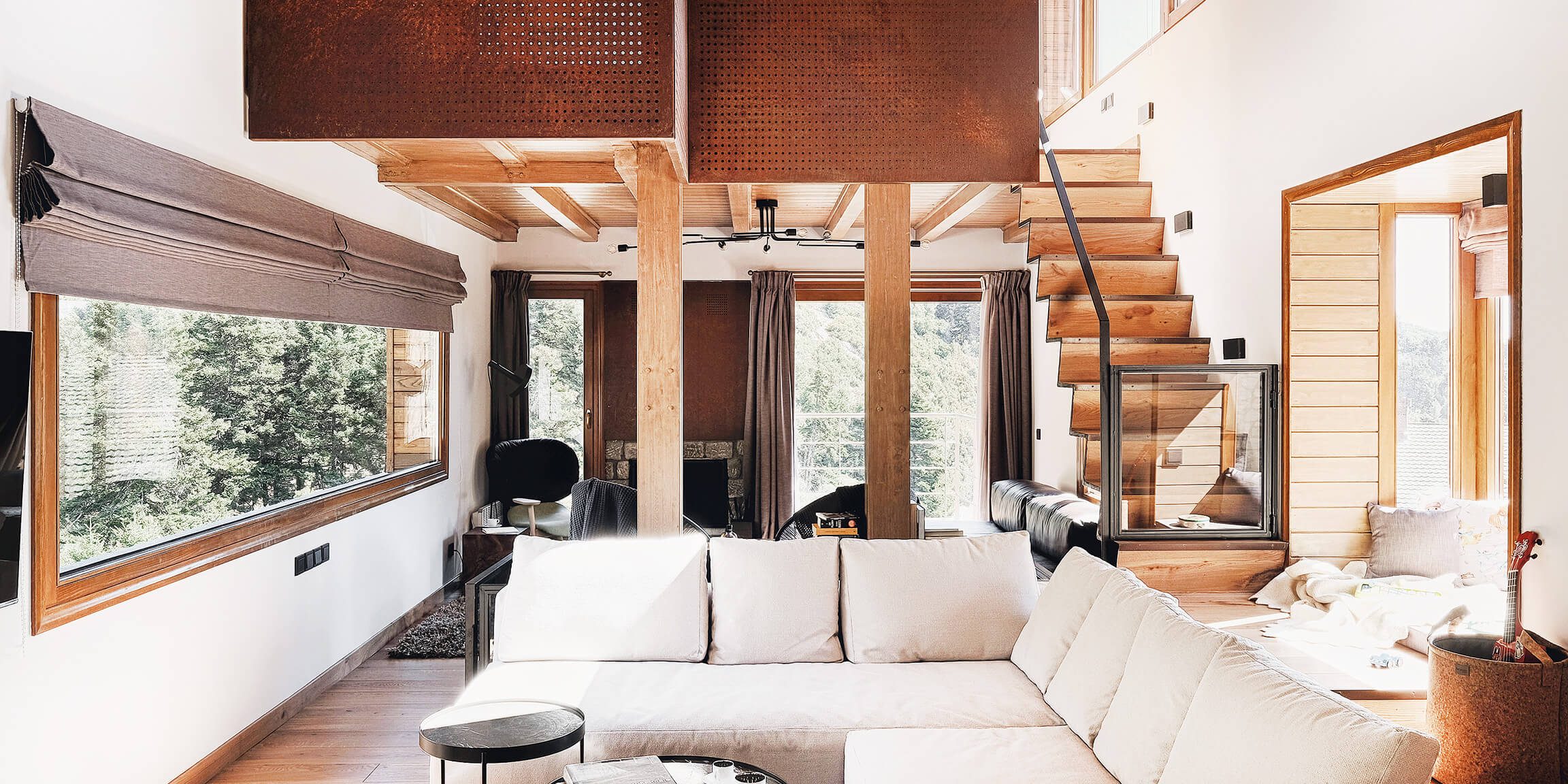 A thin metal stairway leads from the living room to the loft. The perforated Corten steel sheet acts as a lightweight divider between the two levels, simultaneously allowing the light to pass through its uneven circular cross-section holes. Among the changes made to the existing building, apart from the ground plan, was the modification of some openings in order to frame the spectacular view to the forest better or create cosy window seats.