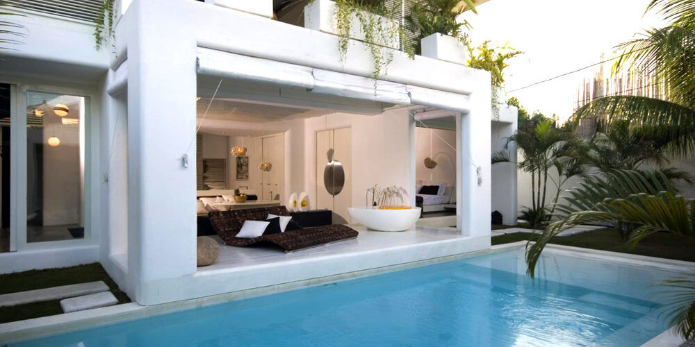 The brief to Architect Valentina Audrito and her team at Word of Mouth was very clear: create a fun, unique space in which the client, an Italian socialite/jewellery designer, could live and entertain. Set on only 300sqm of land in the trendy area of Seminyak, Bali, the site presented challenges not only in terms of its limited size but also its east orientation. The design solution therefore required a creative use of the space, where different functions could harmoniously overlap and interact with each other – the dining area also becomes a lounge, the living zone flows seamlessly into the pool area, and each bedroom functions also as a living space. The result of allowing the spaces to overlap, instead defining functions by changes in level and sliding panels, is a sense of a much larger space. The first floor is dominated by the master bedroom, flanked on 3 sides by green terraces, which maximise natural light and enhance the perception of the size of the space. Here too, functions comfortably overlap each other within the one area – there is a visual interaction between the bed, bathtub, shower, sink, and writing table. All vertical partitions on this floor are treated using wooden louvers to maximize the natural light, giving this space a much lighter feel in contrast to the strongly defined concrete structure of the floor below. The overall aesthetic of the villa is a tribute to the Mediterranean architecture that played a role in the backgrounds of both the client and Italian-born Audrito. Rounded corners are favoured over hard edges in order to infuse a softness to the imposing lines of the structure. The material palette is purposefully restrained; largely consisting of white rendered walls, polished concrete and white painted timber – all offset with an abundance of natural vegetation. The client requested that the architectural material palette be limited as much as possible to black and white (the only colours she wears). As is typical of the architecture of Word of Mouth, the colour is instead introduced in the playful interior furnishings; a combination of items selected from all over the word, and pieces designed by the practice, such as the furniture range inspired by eggs.