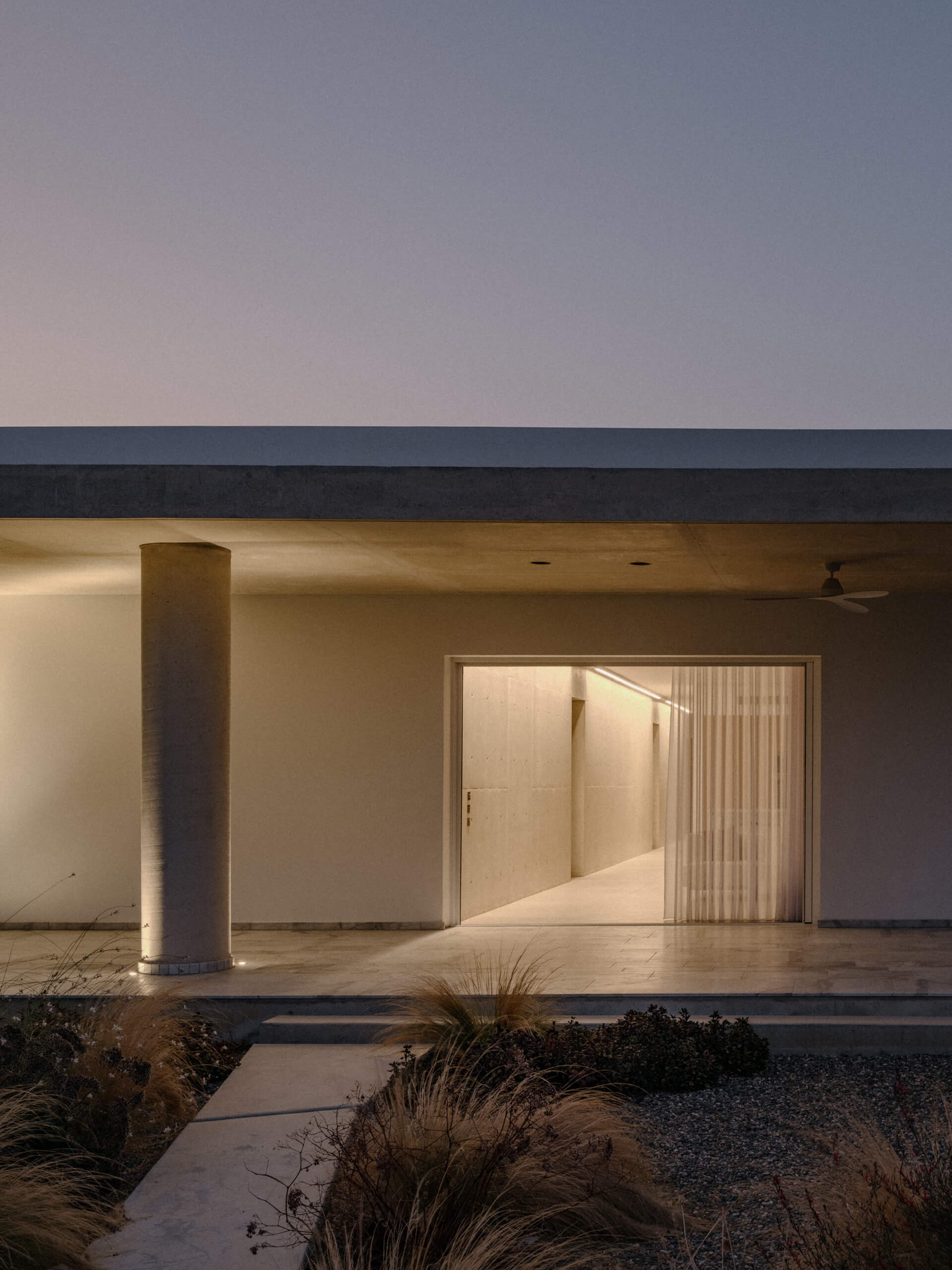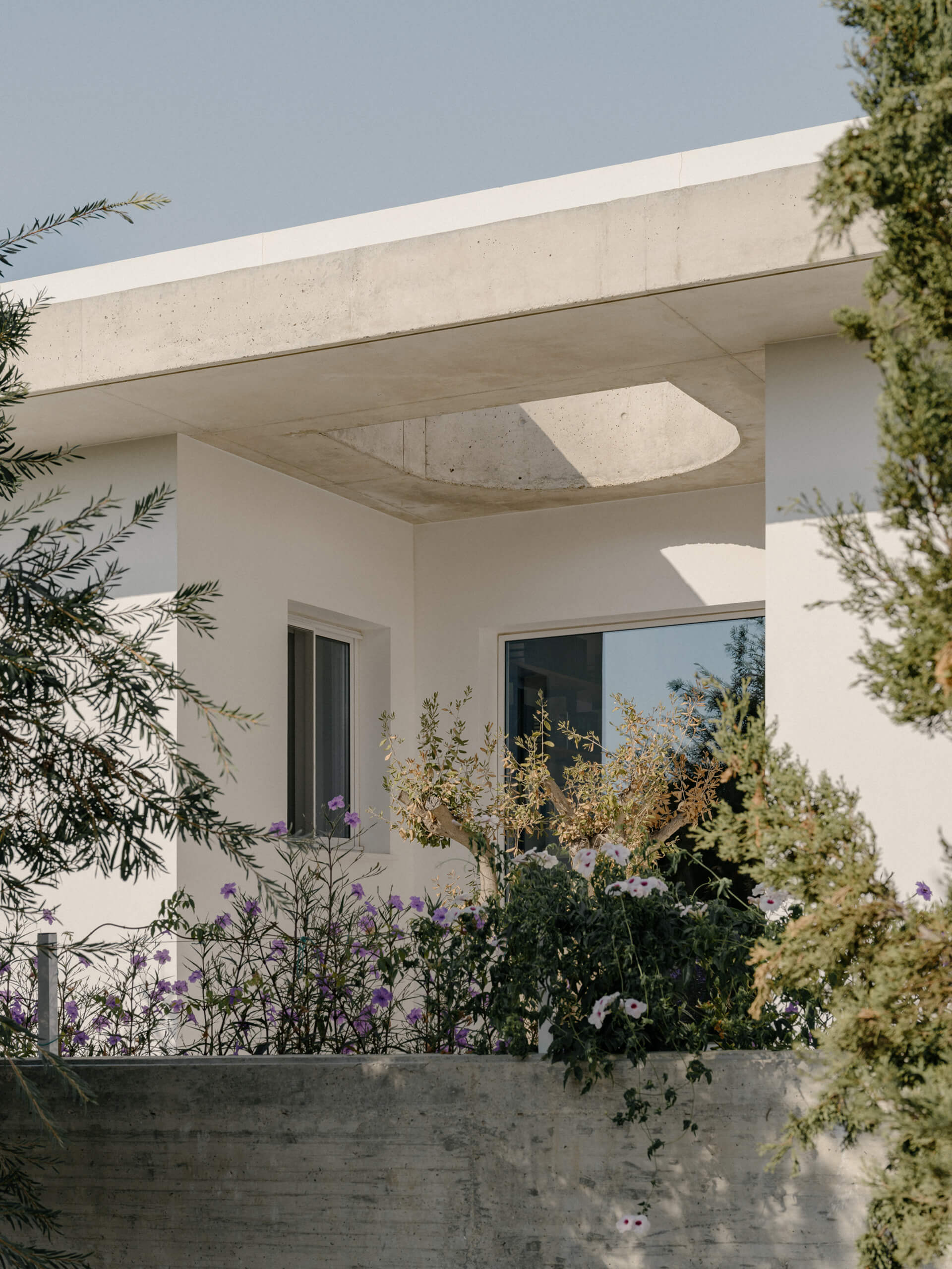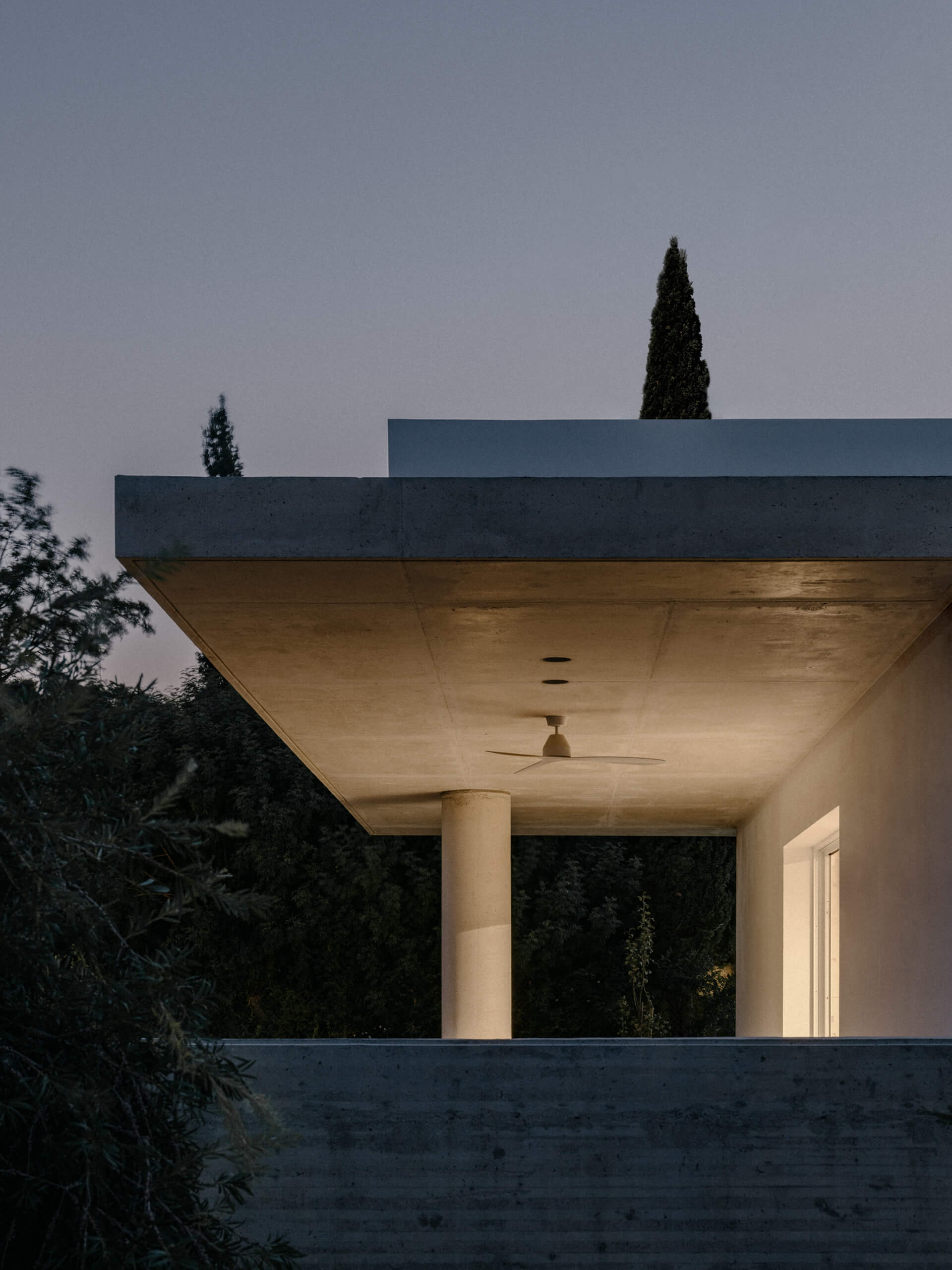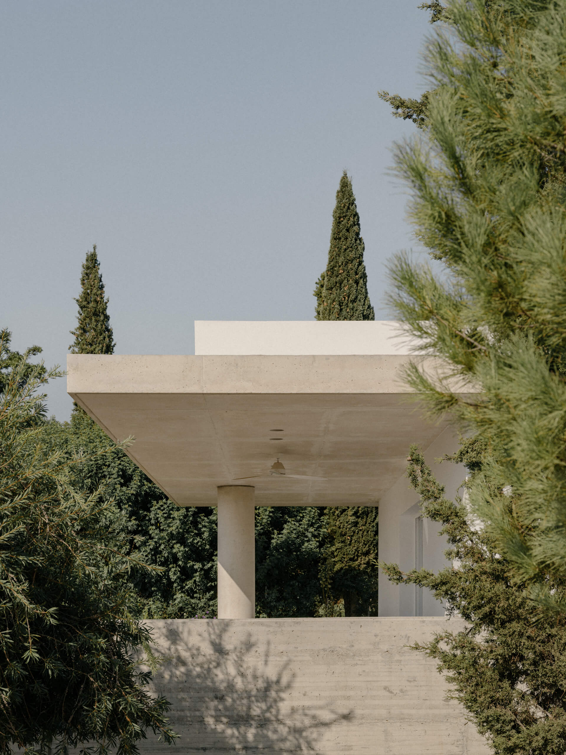 The house is organized under a table-like structure, oriented toward the street with a restrained façade, and elevated from street level. The southern portion of the plot was used for the garden. The building follows a rectangular grid of 12×24 meters, with a perimeter canopy of exposed concrete providing shading and protection. On the southern side, a 4-meter cantilever creates a generous veranda supported by a cylindrical column.