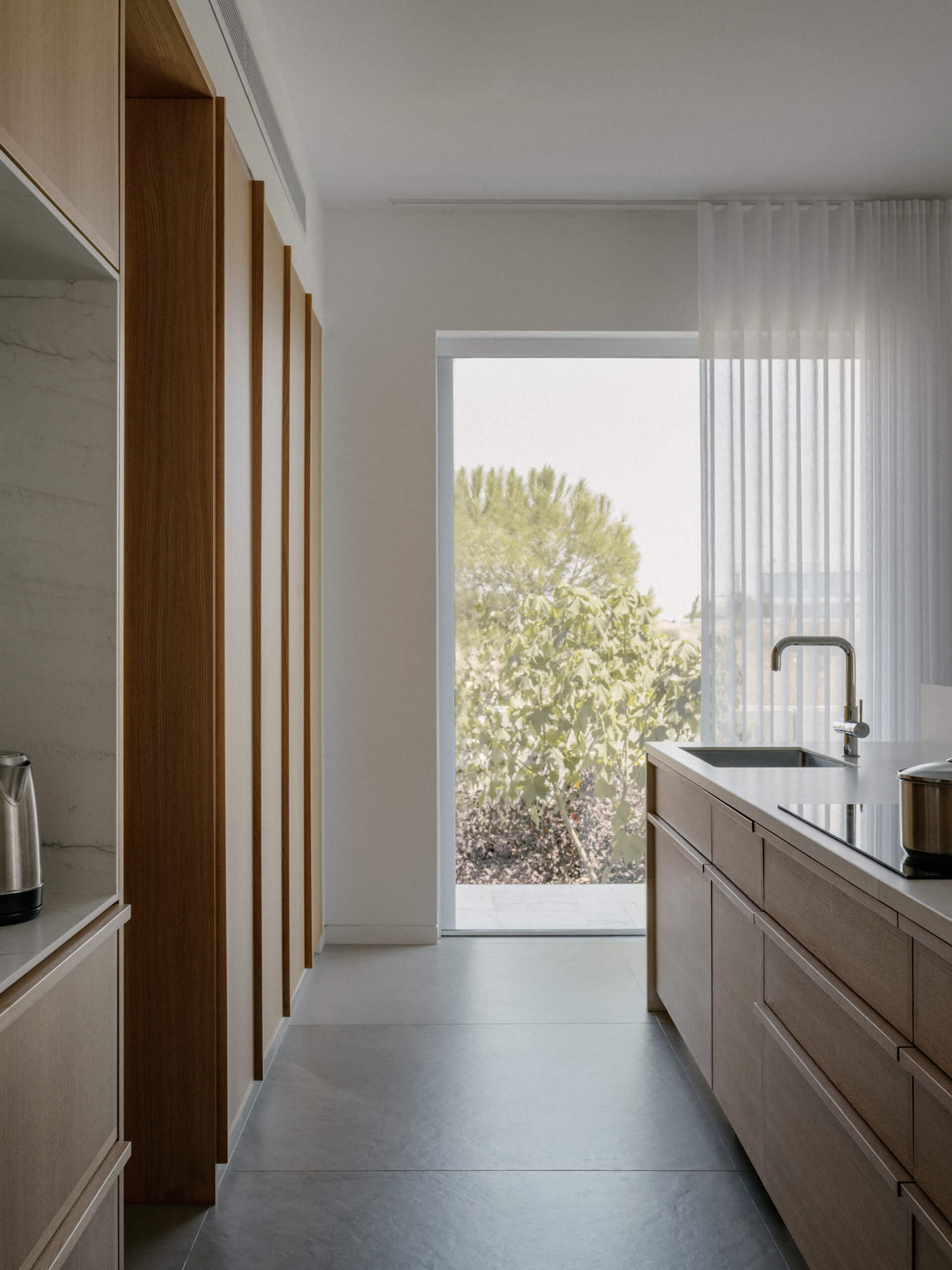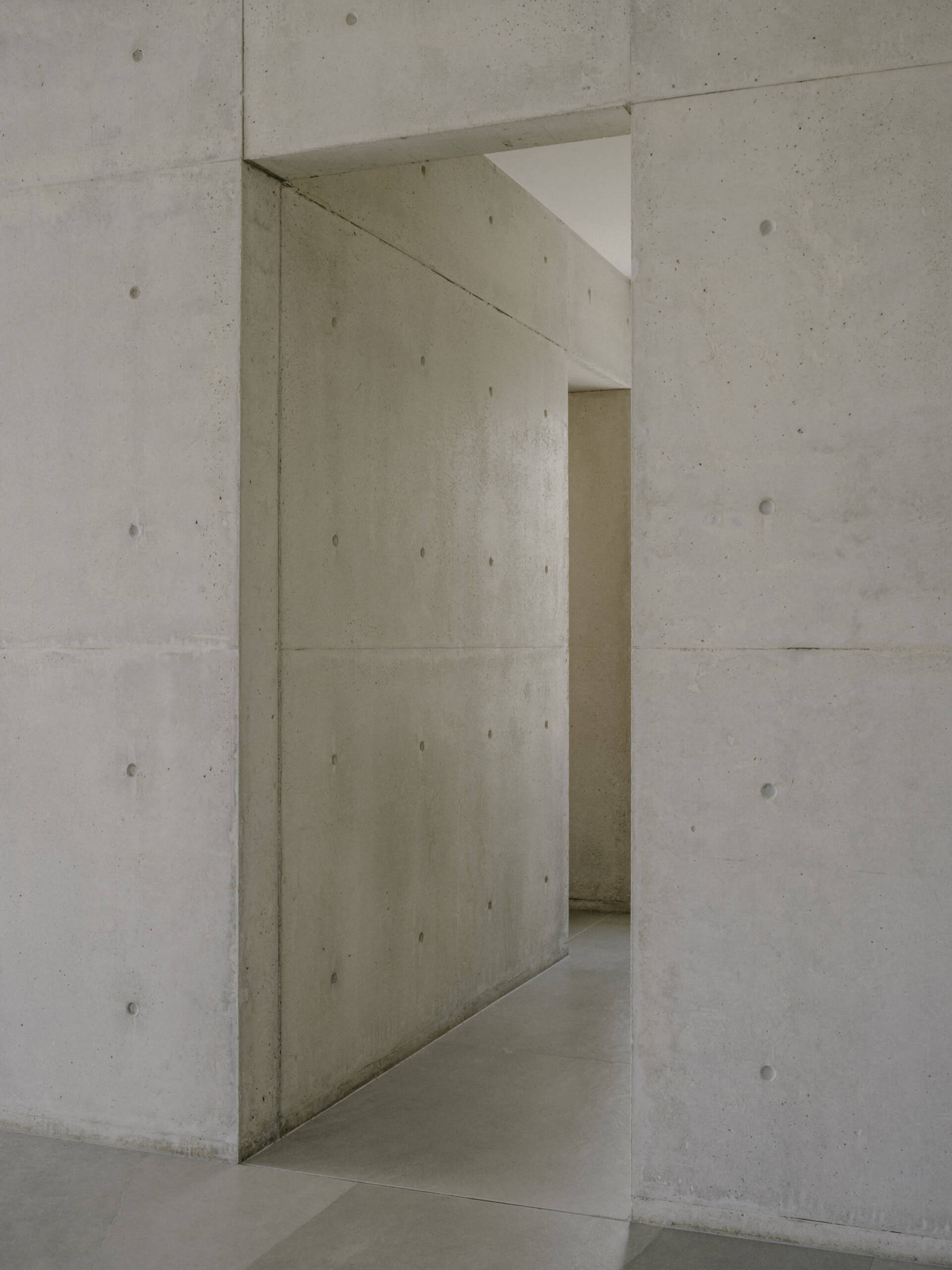 The restrained architecture is expressed through carefully selected materials: large ceramic tiles in communal spaces, wooden floors in bedrooms, exposed concrete walls and soffits, and white plaster on vertical surfaces. Doors, cabinetry, and kitchen fittings were crafted in oak, introducing warmth and a domestic atmosphere.
