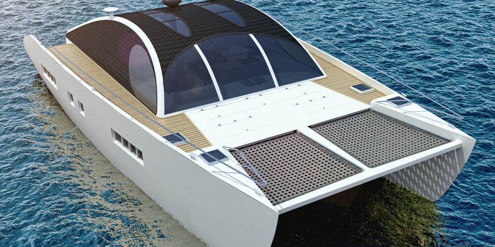 The decision of employing two hulls allows for less resistance in the water and therefore less propulsion energy. The boat is designed to be constructed using the most advanced technologies in the field today; vacuum infusion epoxy resins and Kevlar laminates where employed to achieve a lightweight yet inexpensive hull. The multi-hull also allows for more space above deck; this provides an area of 35 sq m (380 sq f) of photovoltaic panels, supplying the vessel with enough energy to become self-sufficient.