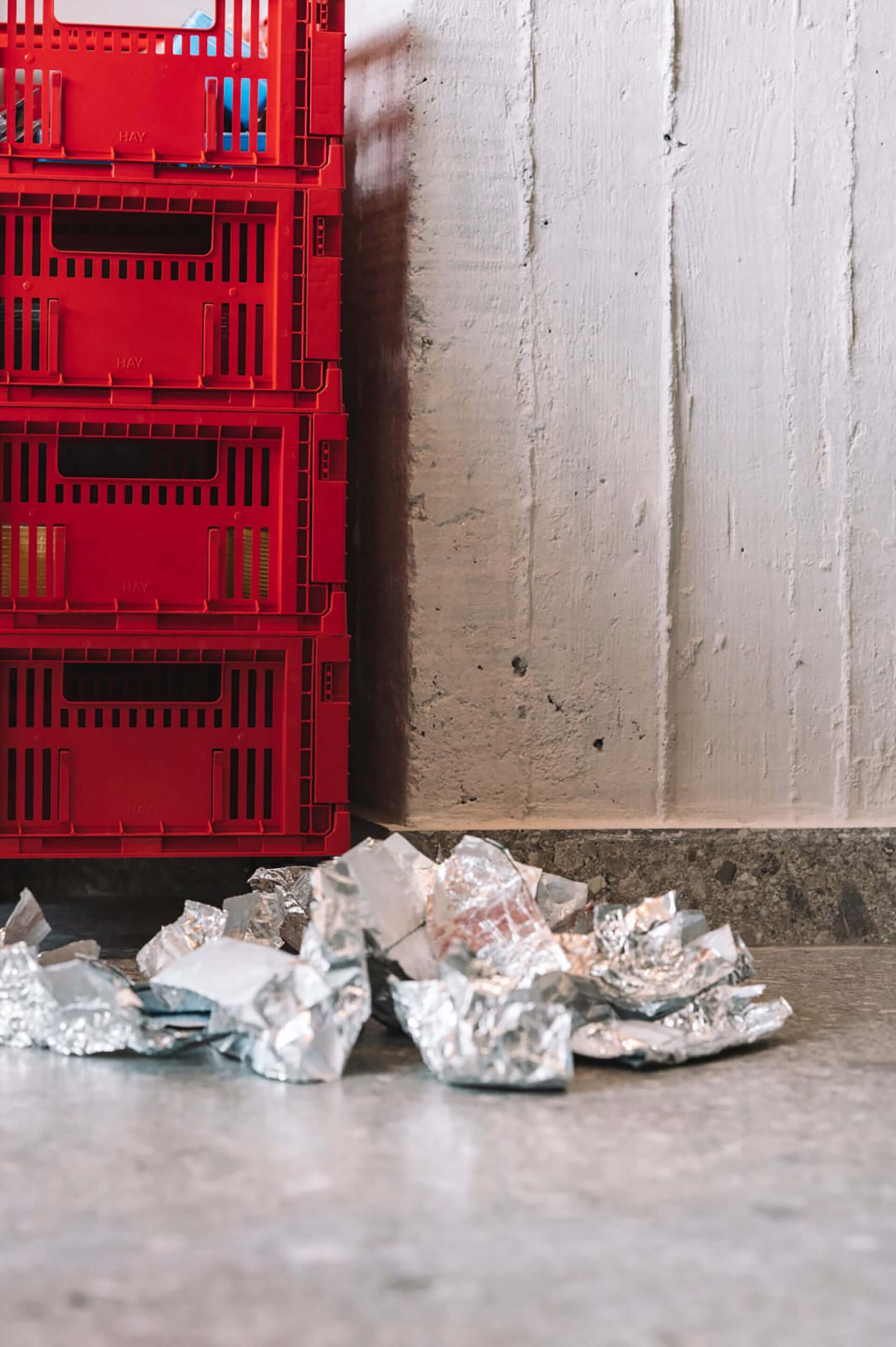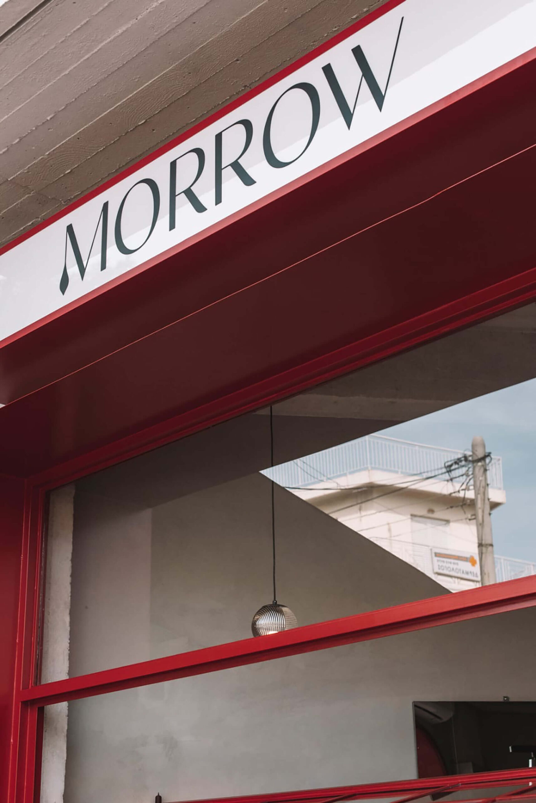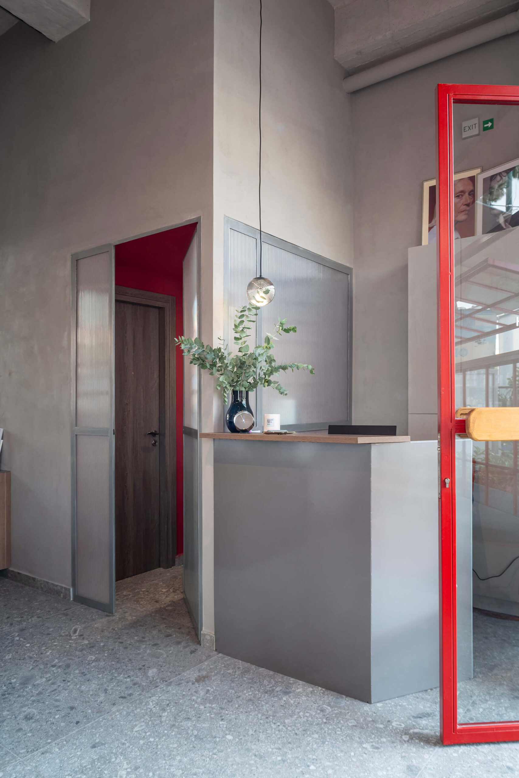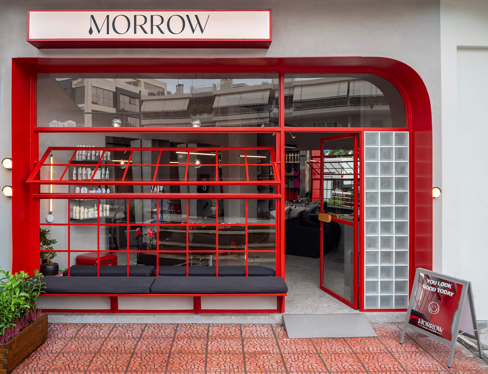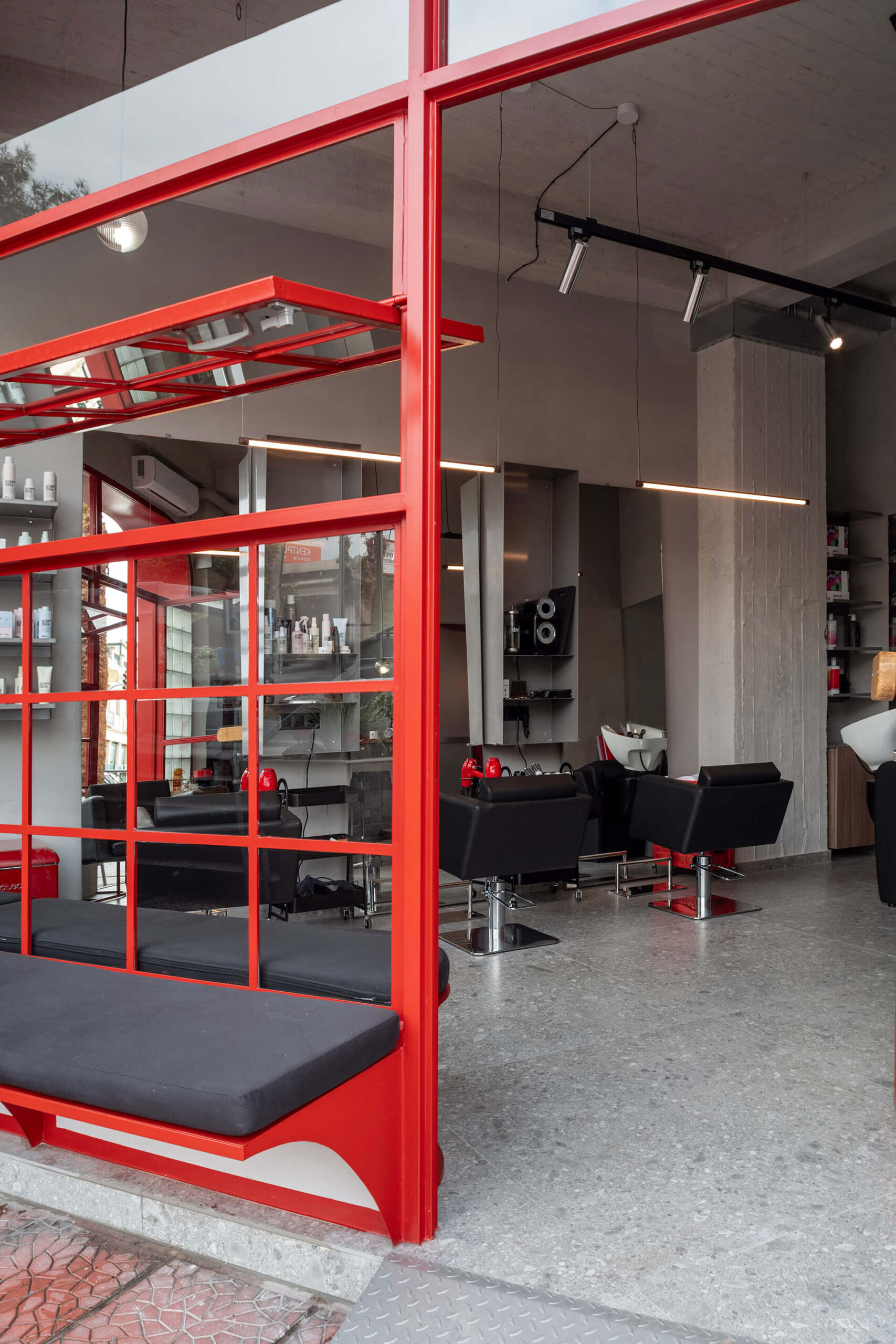 The façade is articulated as a striking composition of bold red steel framing, curved profiles, and translucent glass blocks, establishing a distinct and recognizable identity. A pivoting window allows the threshold to remain fluid and inviting, while an integrated outdoor bench extends the interior experience toward the street, fostering a dialogue between the studio and its urban context and offering a place for brief pauses by clients or passersby.