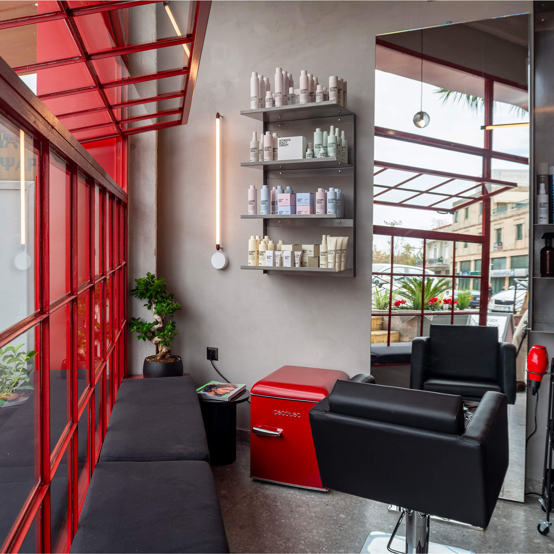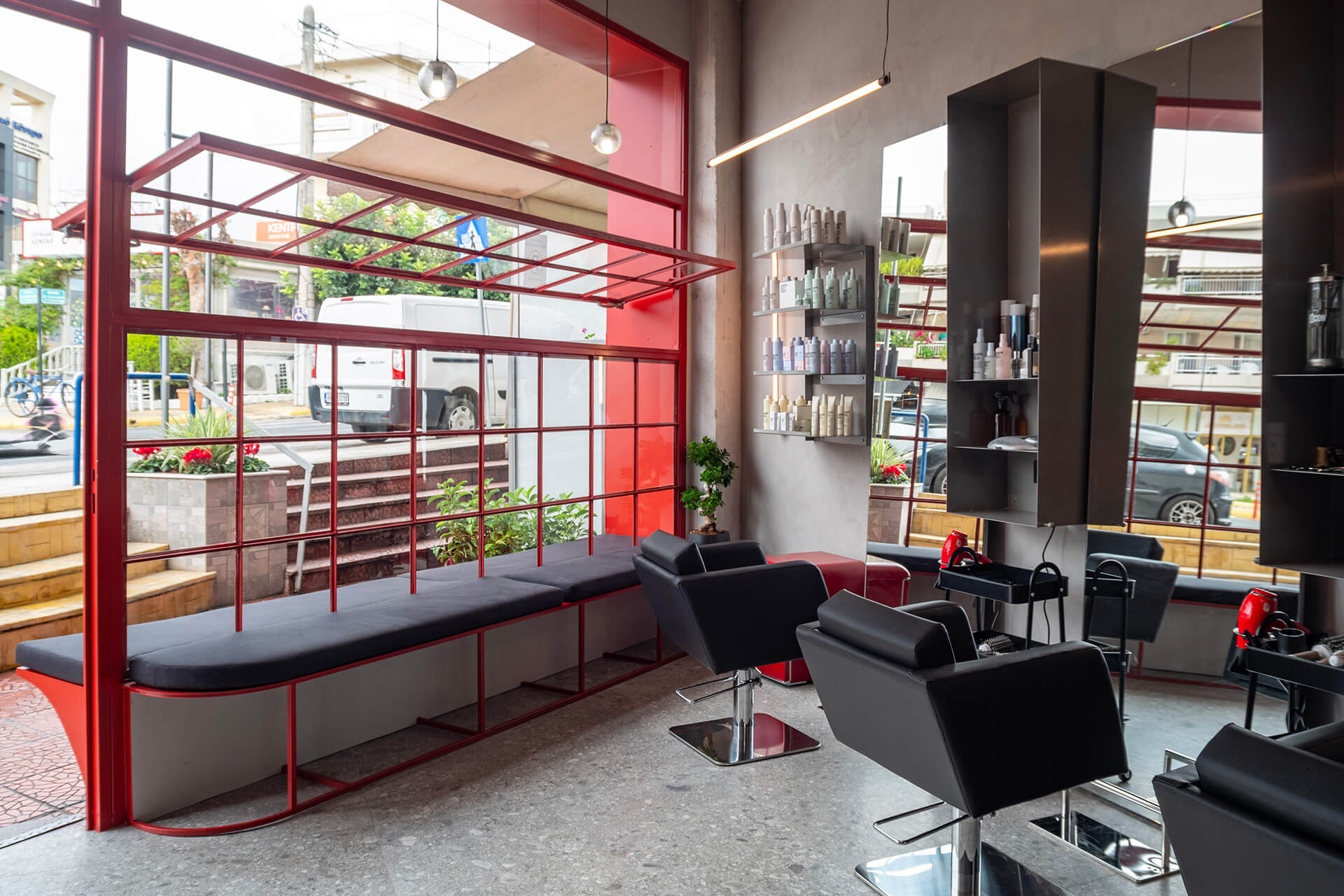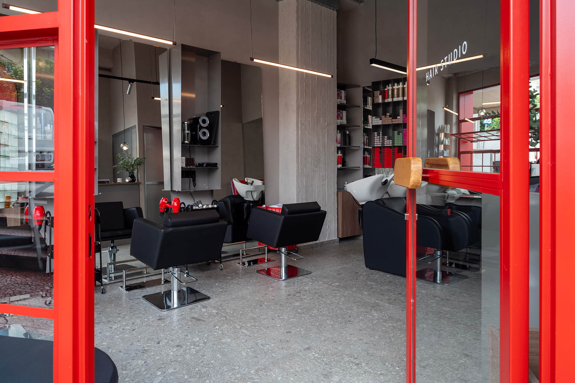 The spatial layout is organized with clarity and efficiency. A primary wall accommodates a sequence of full-height mirrors and black styling chairs, positioned to maximize light reflection and maintain unobstructed circulation. Storage is seamlessly integrated through tall cabinetry and discreet product shelving, preserving a clean and orderly workspace. Throughout the interior, red accents are introduced as intentional focal points – from equipment details to the warm glow of lighting in the side room – echoing the exterior language and infusing vibrancy into the muted interior setting.