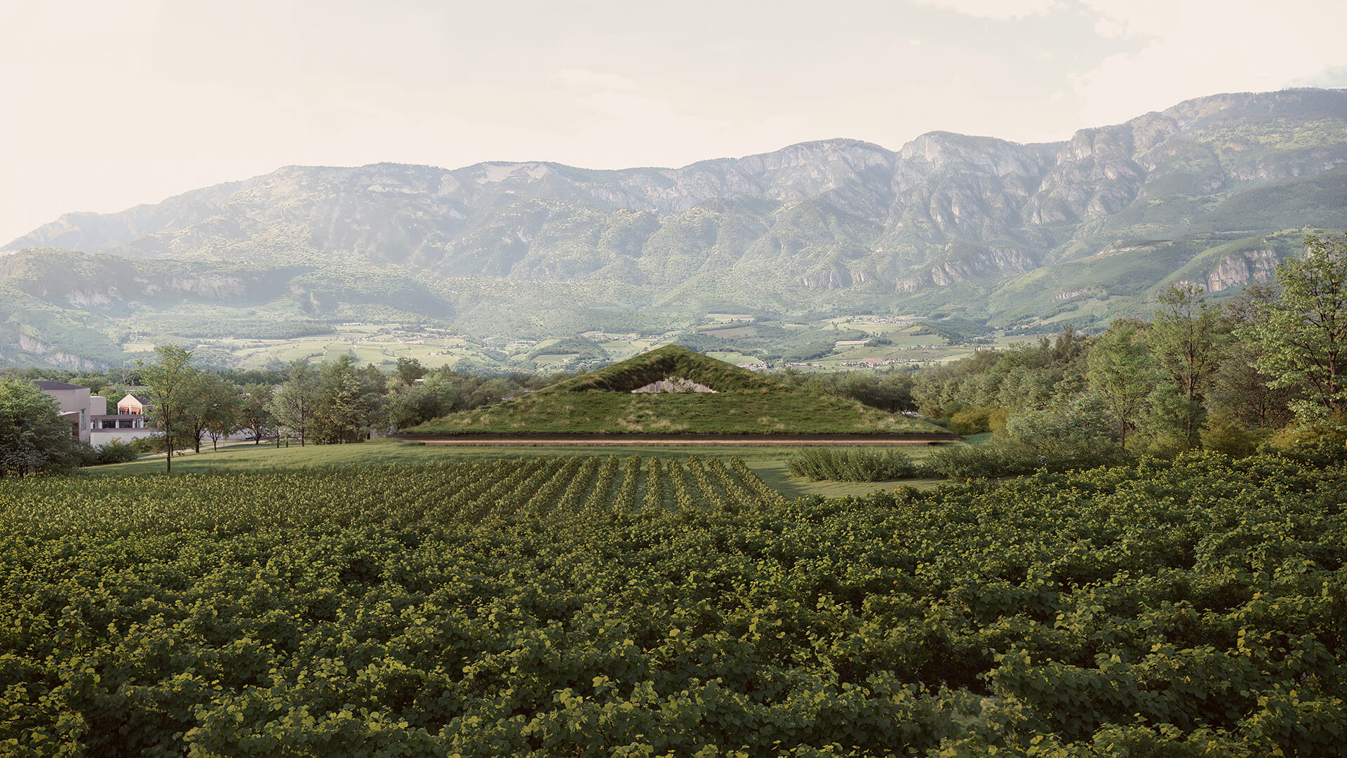 Partially embedded into the ground, the structure reduces its visual impact and establishes a sensitive relationship with the surrounding landscape. The green roof extends the natural terrain, reinforcing continuity between the built form and its environment. This integration is further emphasized by the material palette and the modulation of volumes, which echo local architectural references while maintaining a distinct contemporary identity.