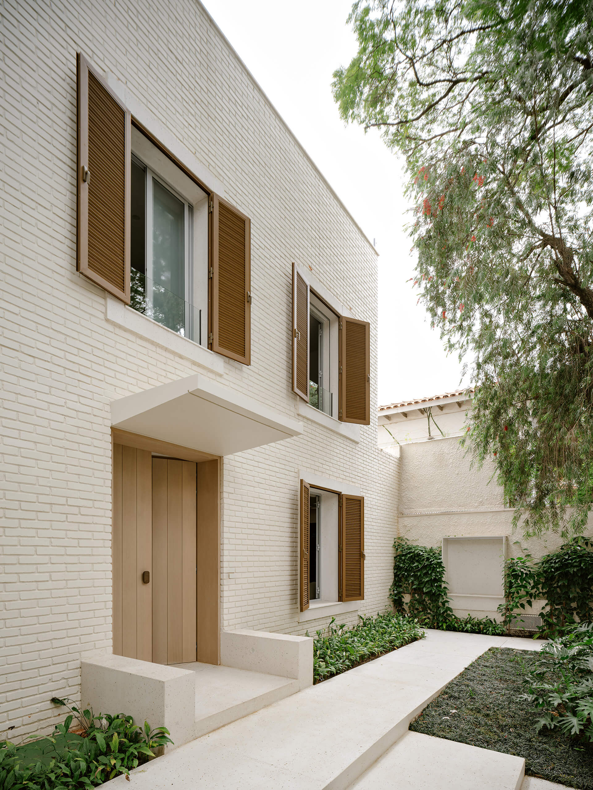 The primary volume is clad in white-painted brick, evoking purity and timelessness. At key points, this brickwork continues indoors, reinforcing the dialogue between past and present. Warmth is introduced through wood details -seen in the entrance door, façade windows, rear deck, and interior millwork- that harmonize with the lush greenery.