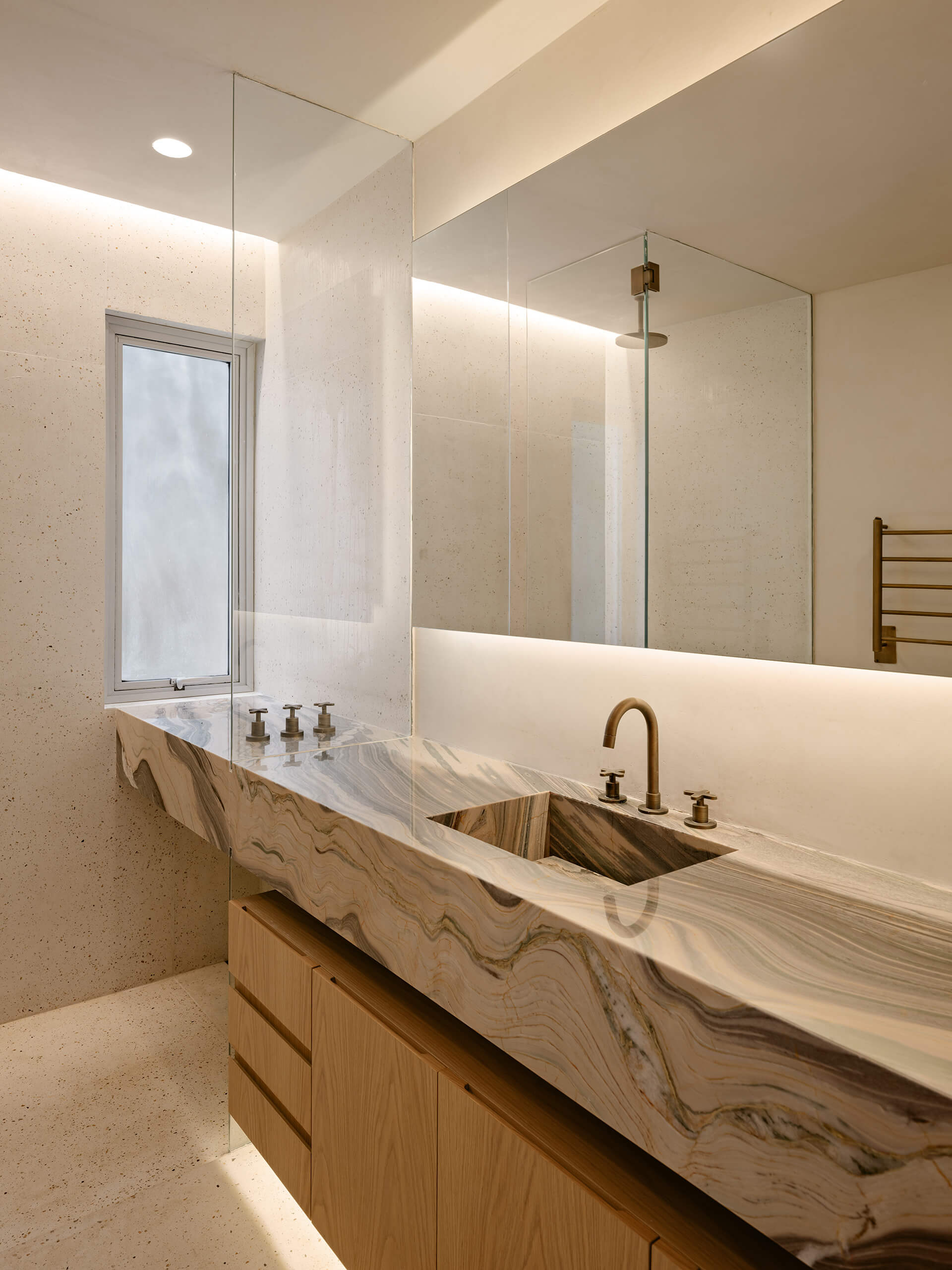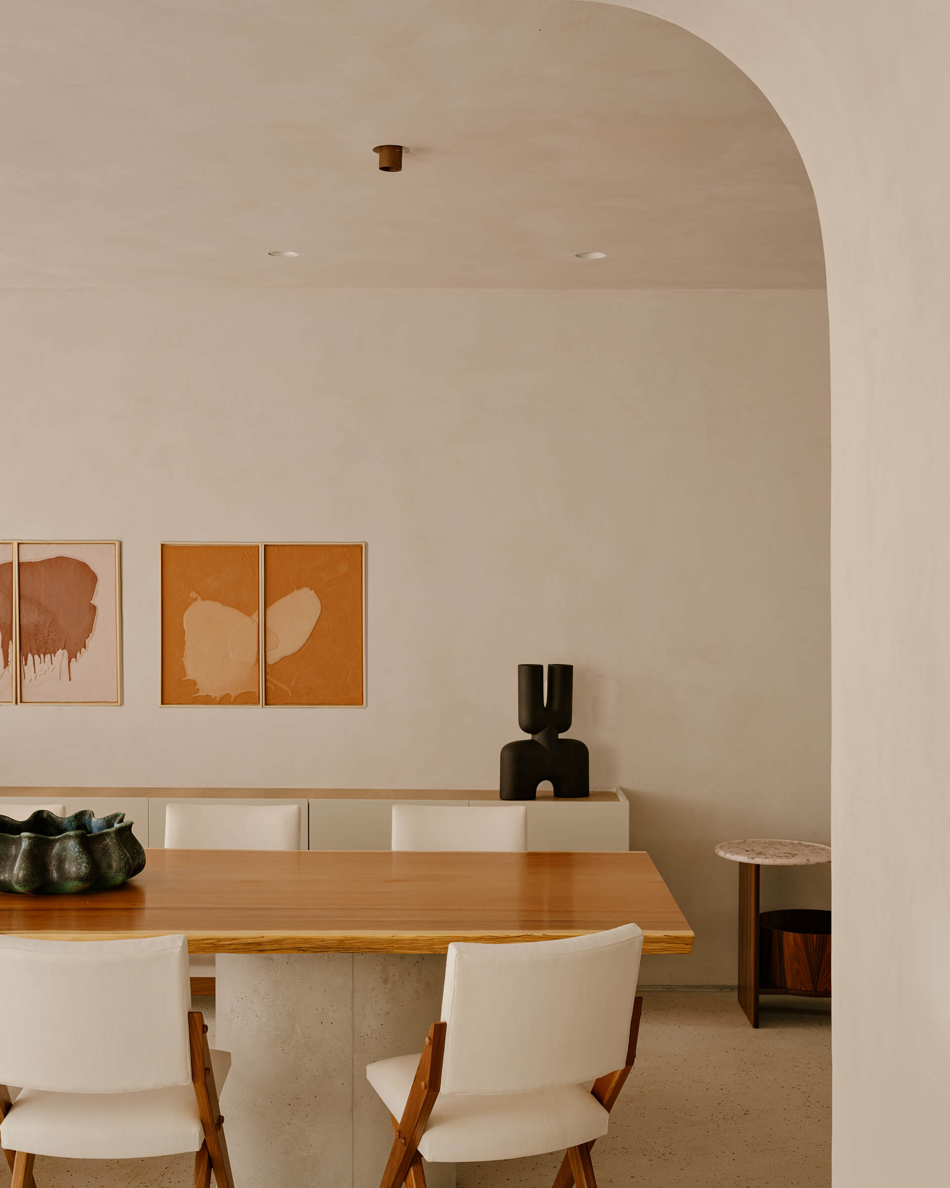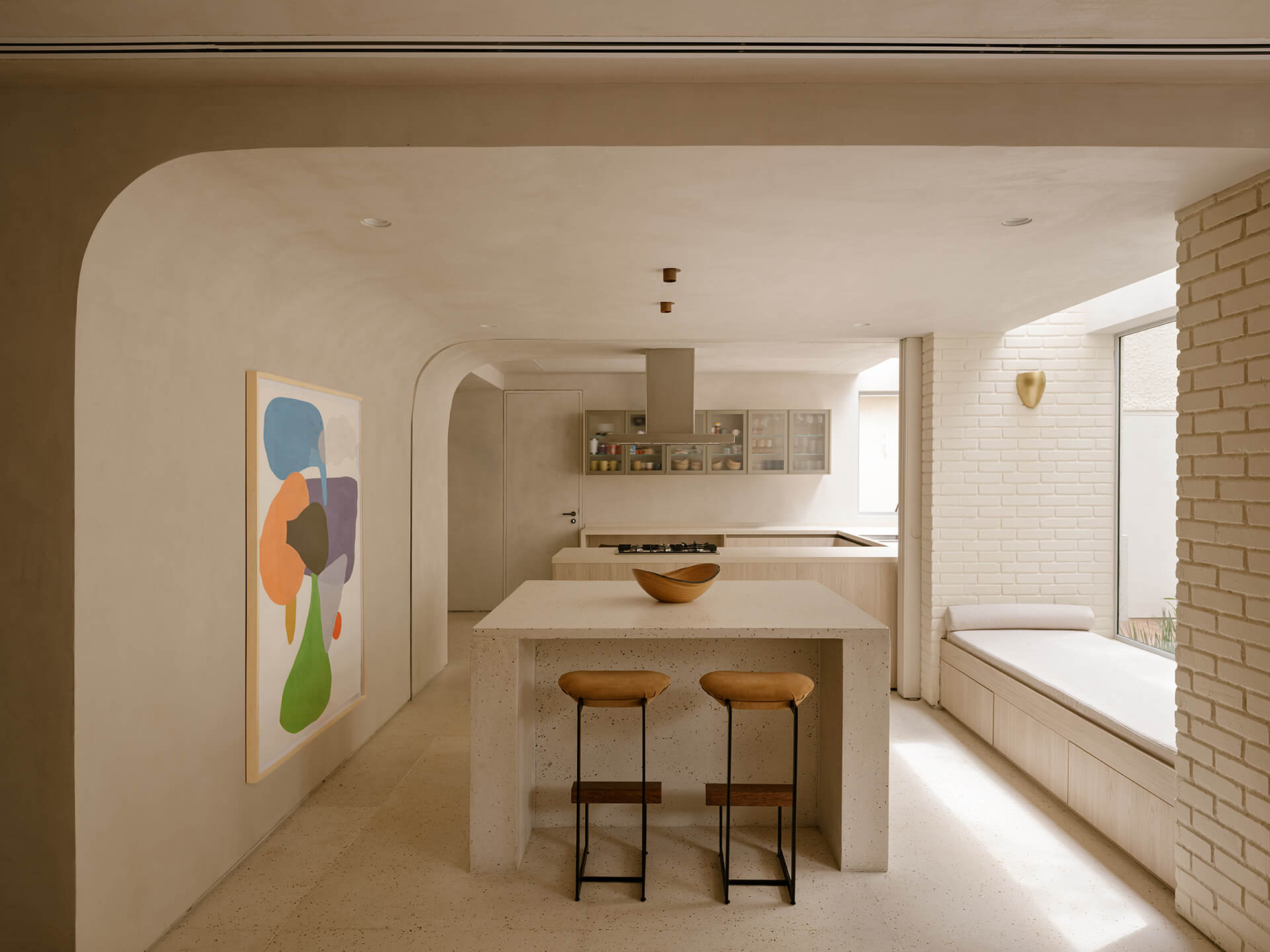 Inside, a unified palette of monolithic flooring, stucco walls, and neutral brick details enhances spatial continuity and amplifies natural light. Bathrooms follow a similar clarity, combining terrazzo or stone floors and countertops with off-white tiles and wooden cabinetry. Furniture selections celebrate icons of modern and contemporary design. Together, these pieces curate an atmosphere of refinement, comfort, and timeless style.