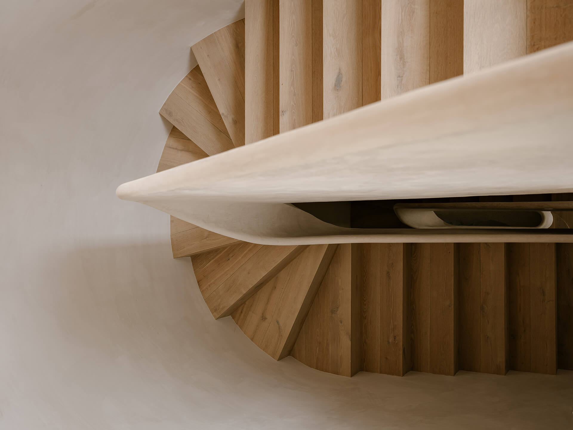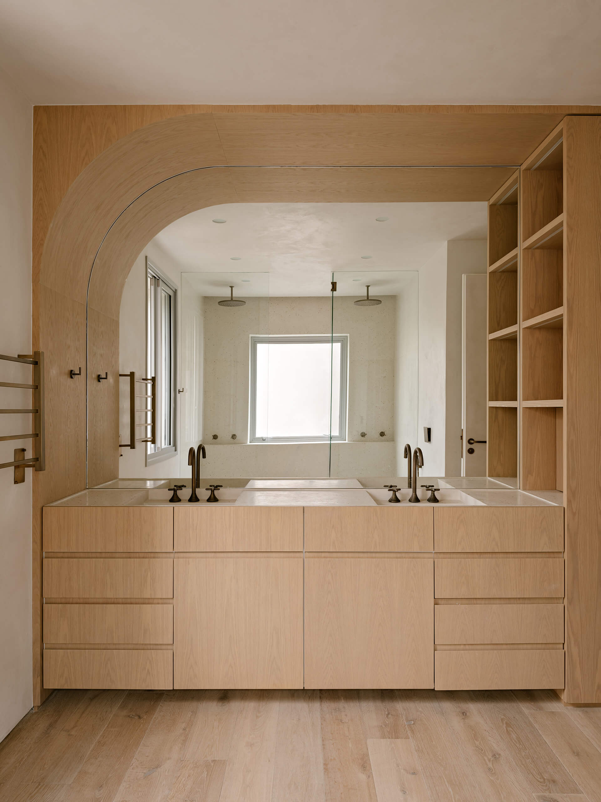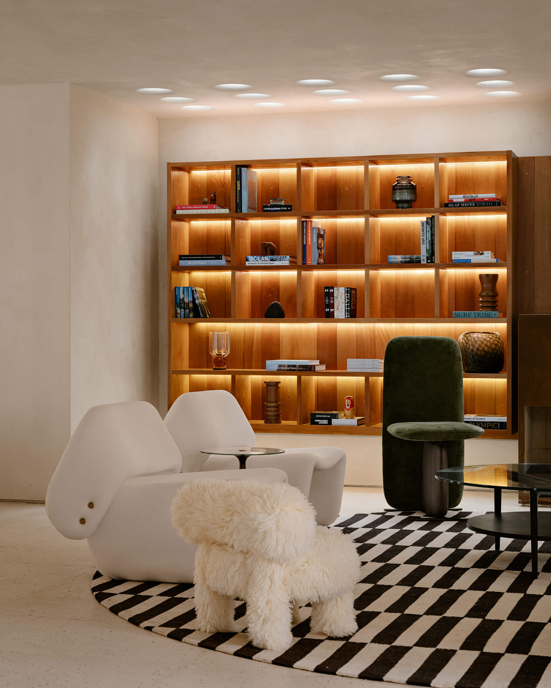 Inside, a unified palette of monolithic flooring, stucco walls, and neutral brick details enhances spatial continuity and amplifies natural light. Bathrooms follow a similar clarity, combining terrazzo or stone floors and countertops with off-white tiles and wooden cabinetry. Furniture selections celebrate icons of modern and contemporary design. Together, these pieces curate an atmosphere of refinement, comfort, and timeless style.