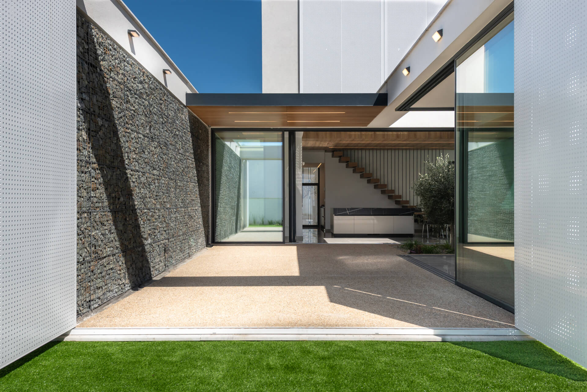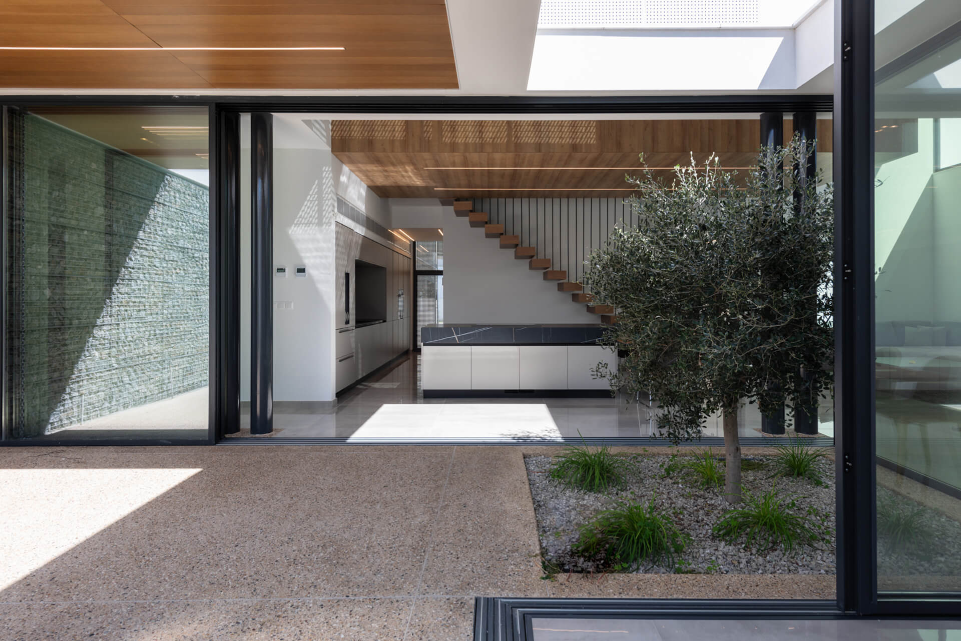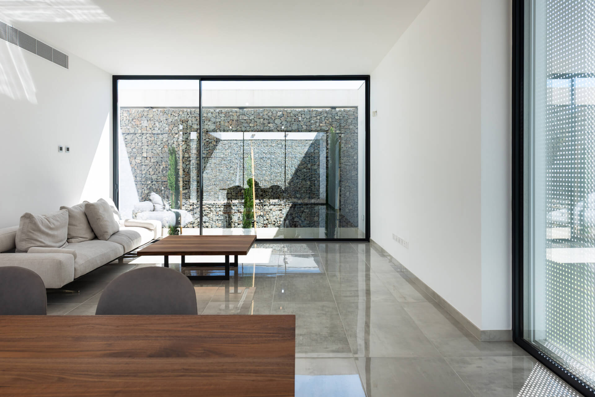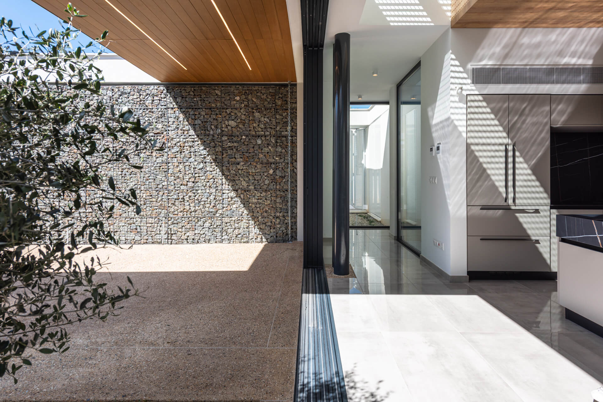 The courtyards, functioning as the key bioclimatic components of the residence, form the heart of the design. Positioned next to the communal areas and the bedrooms, they provide private outdoor zones for each room while allowing the flow of natural light and ventilation with privacy in mind. Planted with low-growing Cypriot vegetation, the courtyards create microclimates that bring natural greenery into the home. In this way, the residence “embraces” the natural environment, achieving an organic continuity with the landscape.