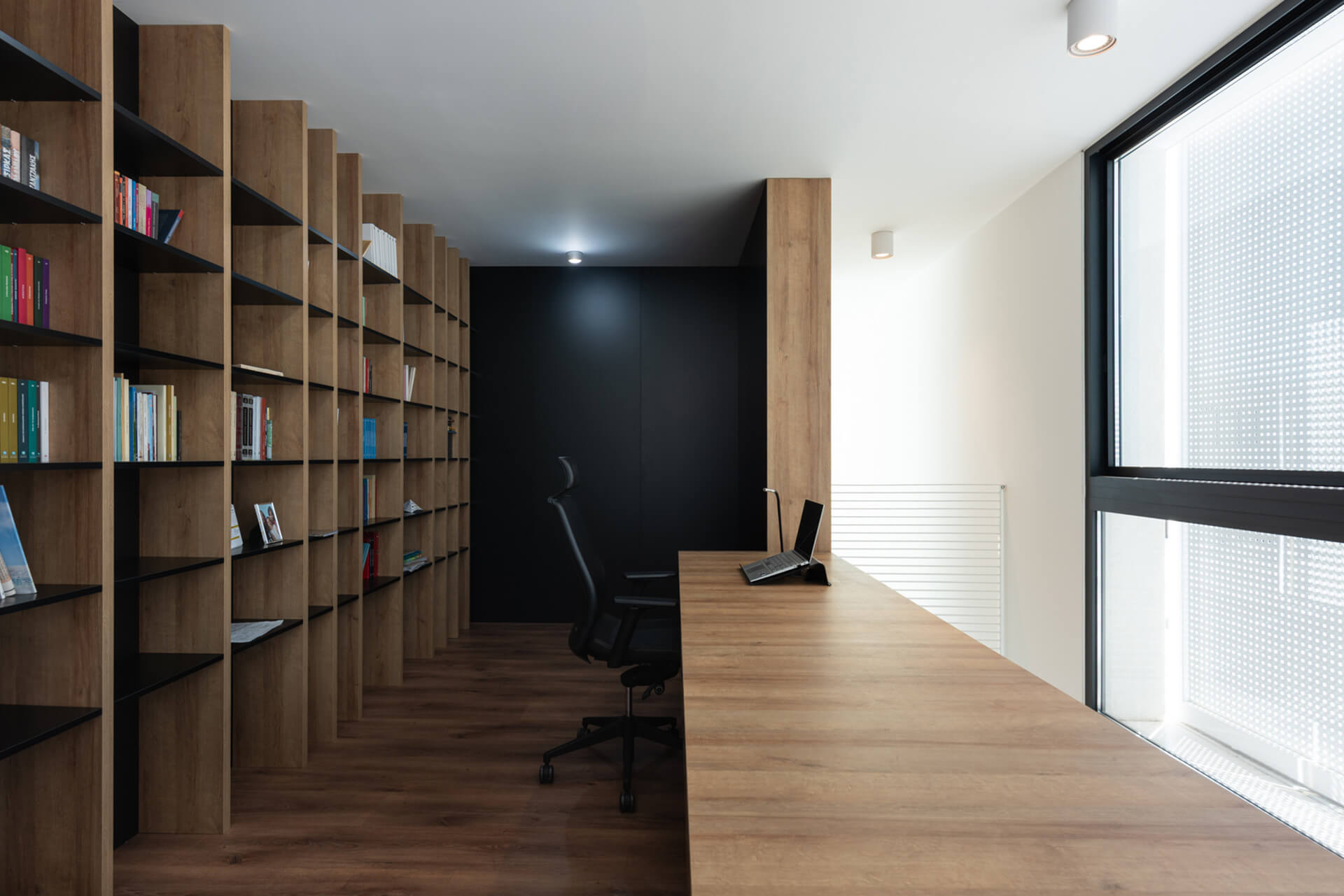 A central architectural feature of the interior is the workspace, which hovers as a wooden volume above the kitchen and the everyday living area. It functions as the secondary main use of the home, meeting the need for book storage and providing a dedicated study area for the residents.
