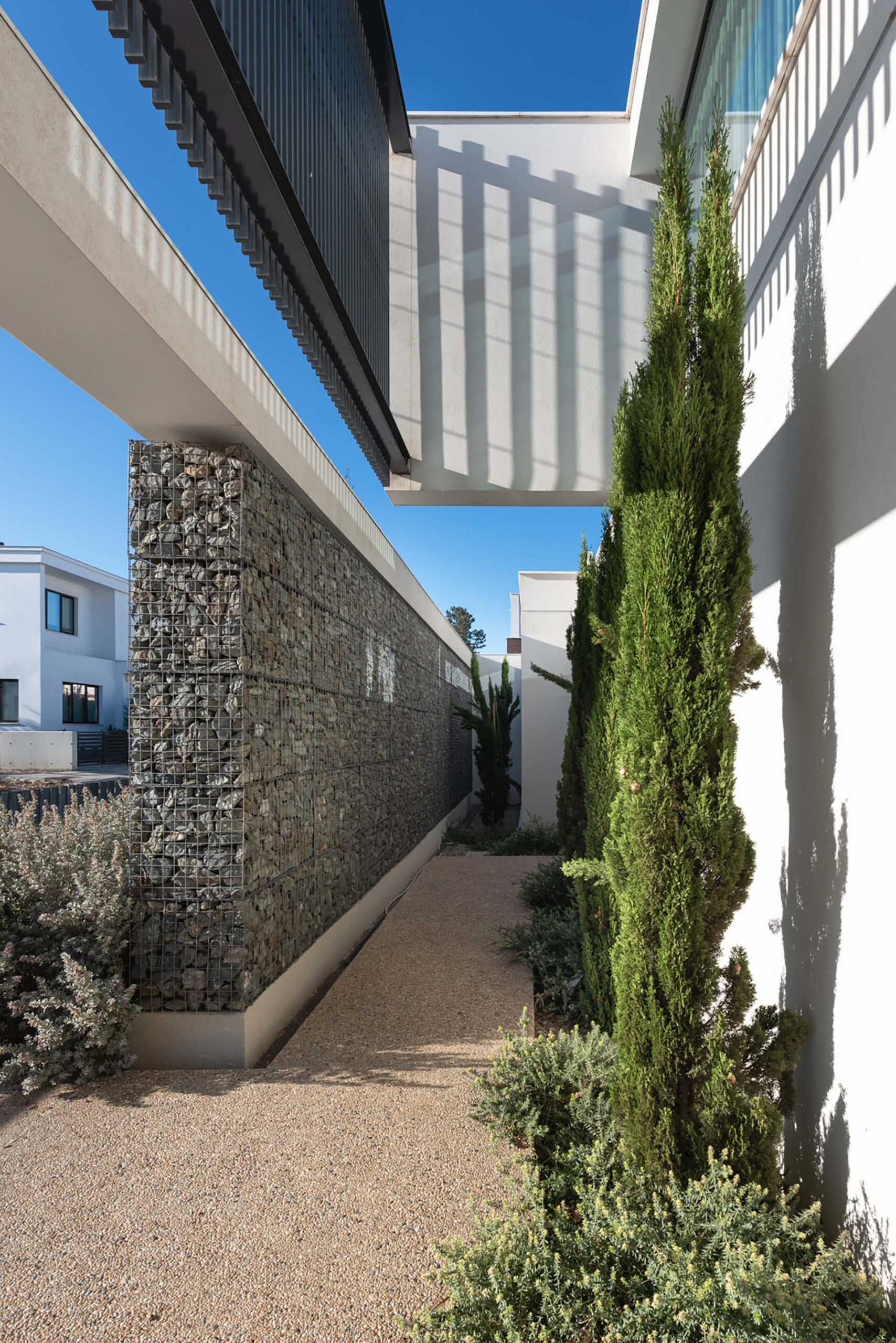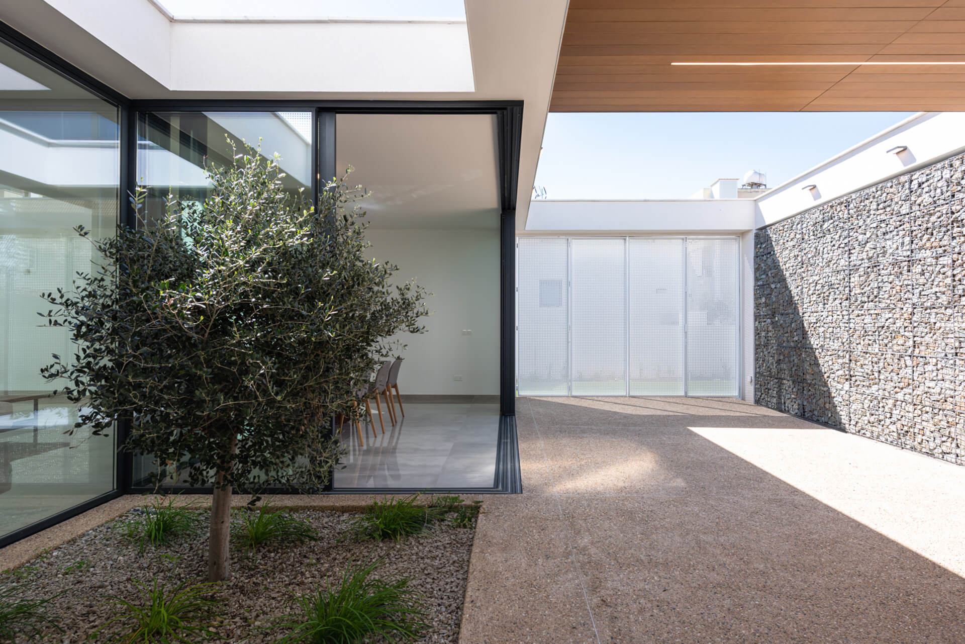 The spatial configuration offers organic flexibility, with public and private areas arranged in relation to a workspace volume that “suspends” itself as a focal point within the residence, allowing multiple movement paths. The inward-looking, through-ventilated layout and its relationship with the outdoor space create a core of privacy and security for the residents. The external walls, together with the eastern gabion wall filled with local stone, form a protective diaphragm separating public from private space, while the interior spaces extend toward the courtyards, ensuring cross-ventilation and natural light.