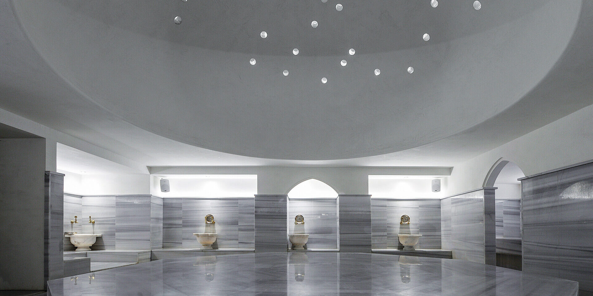 From the changing rooms and wet areas, curved corridors in wood lead to the main hall with a central octagonal marble base and smaller more private niches. The VIP hall with a smaller orthogonal marble base, has direct access to the central space and the VIP changing rooms. A relaxation area is located next to the garden; the final stage to the ultimate hammam experience.