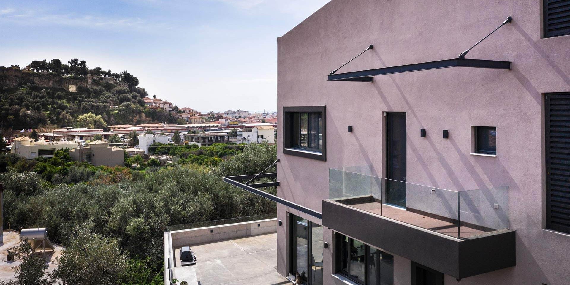 The simple, four-sided building in Kalamata, emerging through the green of nature, maintains a prismatic shape on all sides of its volume with protracting, linear balconies, and comes in contrast with the rectangular neighboring buildings.