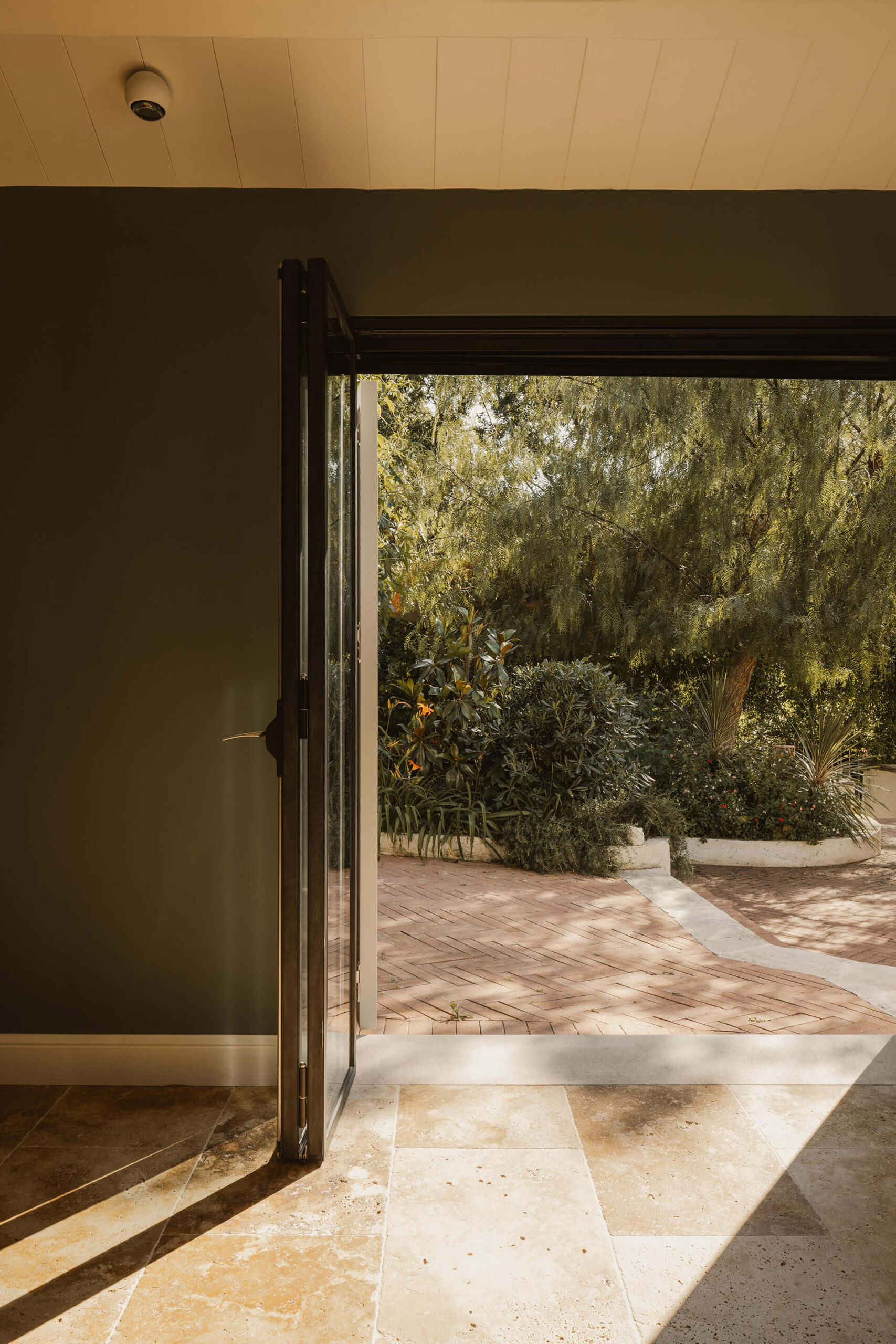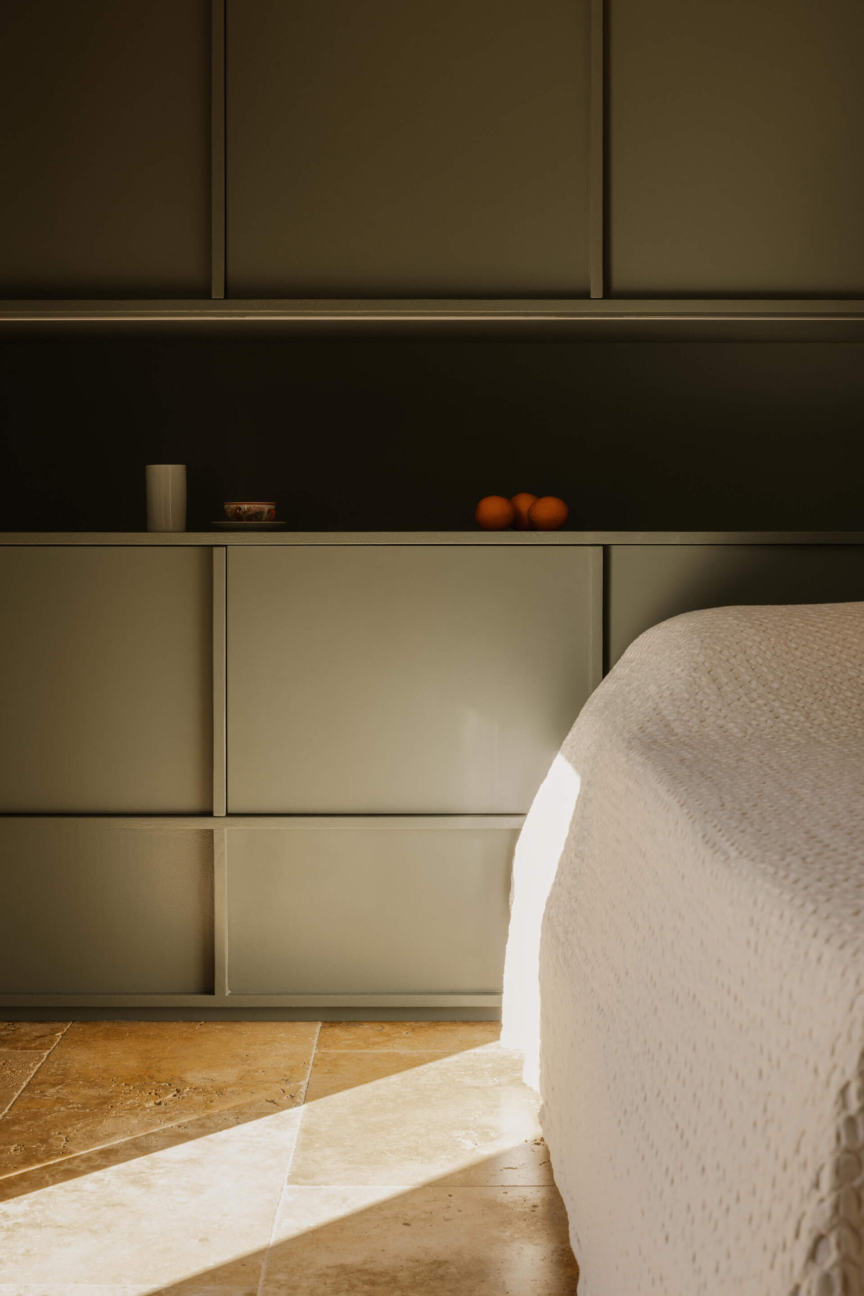 In the second guesthouse, the choice of a deep green hue for the central built-in element evokes the lush vegetation of the garden, reinforcing the connection between inside and out. The ochre-toned stone flooring continues the visual narrative of the exterior, drawing the natural palette indoors.